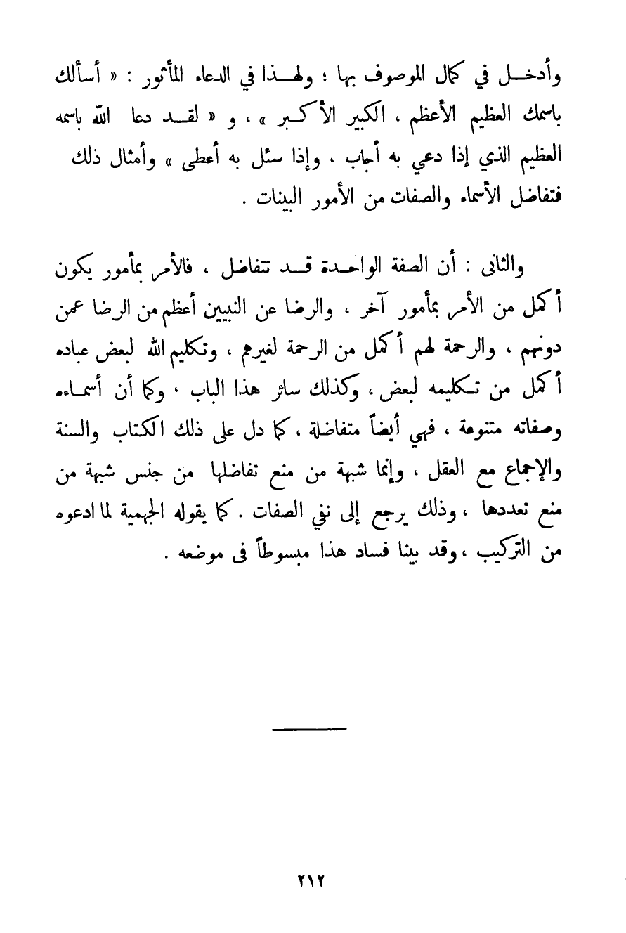 وَأُدْخِلَ فِي كَمَالِ الْمَوْصُوفِ بِهَا؛ وَلِهَذَا فِي الدُّعَاءِ الْمَأْثُورِ: {أَسْأَلُك بِاسْمِك الْعَظِيمِ الْأَعْظَمِ الْكَبِيرِ الْأَكْبَرِ} وَ {لَقَدْ دَعَا اللَّهَ بِاسْمِهِ الْعَظِيمِ الَّذِي إذَا دُعِيَ بِهِ أَجَابَ وَإِذَا سُئِلَ بِهِ أَعْطَى} وَأَمْثَالِ ذَلِكَ فَتَفَاضُلُ الْأَسْمَاءِ وَالصِّفَاتِ مِنْ الْأُمُورِ الْبَيِّنَاتِ. وَالثَّانِي: أَنَّ الصِّفَةَ الْوَاحِدَةَ قَدْ تَتَفَاضَلُ فَالْأَمْرُ بِمَأْمُورِ يَكُونُ أَكْمَلَ مِنْ الْأَمْرِ بِمَأْمُورِ آخَرَ وَالرِّضَا عَنْ النَّبِيِّينَ أَعْظَمُ مِنْ الرِّضَا عَمَّنْ دُونَهُمْ وَالرَّحْمَةُ لَهُمْ أَكْمَلُ مِنْ الرَّحْمَةِ لِغَيْرِهِمْ وَتَكْلِيمُ اللَّهِ لِبَعْضِ عِبَادِهِ أَكْمَلُ مِنْ تَكْلِيمِهِ لِبَعْضِ وَكَذَلِكَ سَائِرُ هَذَا الْبَابِ وَكَمَا أَنَّ أَسْمَاءَهُ وَصِفَاتِهِ مُتَنَوِّعَةٌ فَهِيَ أَيْضًا مُتَفَاضِلَةٌ كَمَا دَلَّ عَلَى ذَلِكَ الْكِتَابُ وَالسُّنَّةُ وَالْإِجْمَاعُ مَعَ الْعَقْلِ وَإِنَّمَا شُبْهَةُ مَنْ مَنَعَ تَفَاضُلَهَا مِنْ جِنْسِ شُبْهَةِ مَنْ مَنَعَ تَعَدُّدَهَا وَذَلِكَ يَرْجِعُ إلَى نَفْيِ الصِّفَاتِ. كَمَا يَقُولُهُ الْجَهْمِيَّة لَمَّا ادَّعَوْهُ مِنْ التَّرْكِيبِ وَقَدْ بَيَّنَّا فَسَادَ هَذَا مَبْسُوطًا فِي مَوْضِعِهِ.