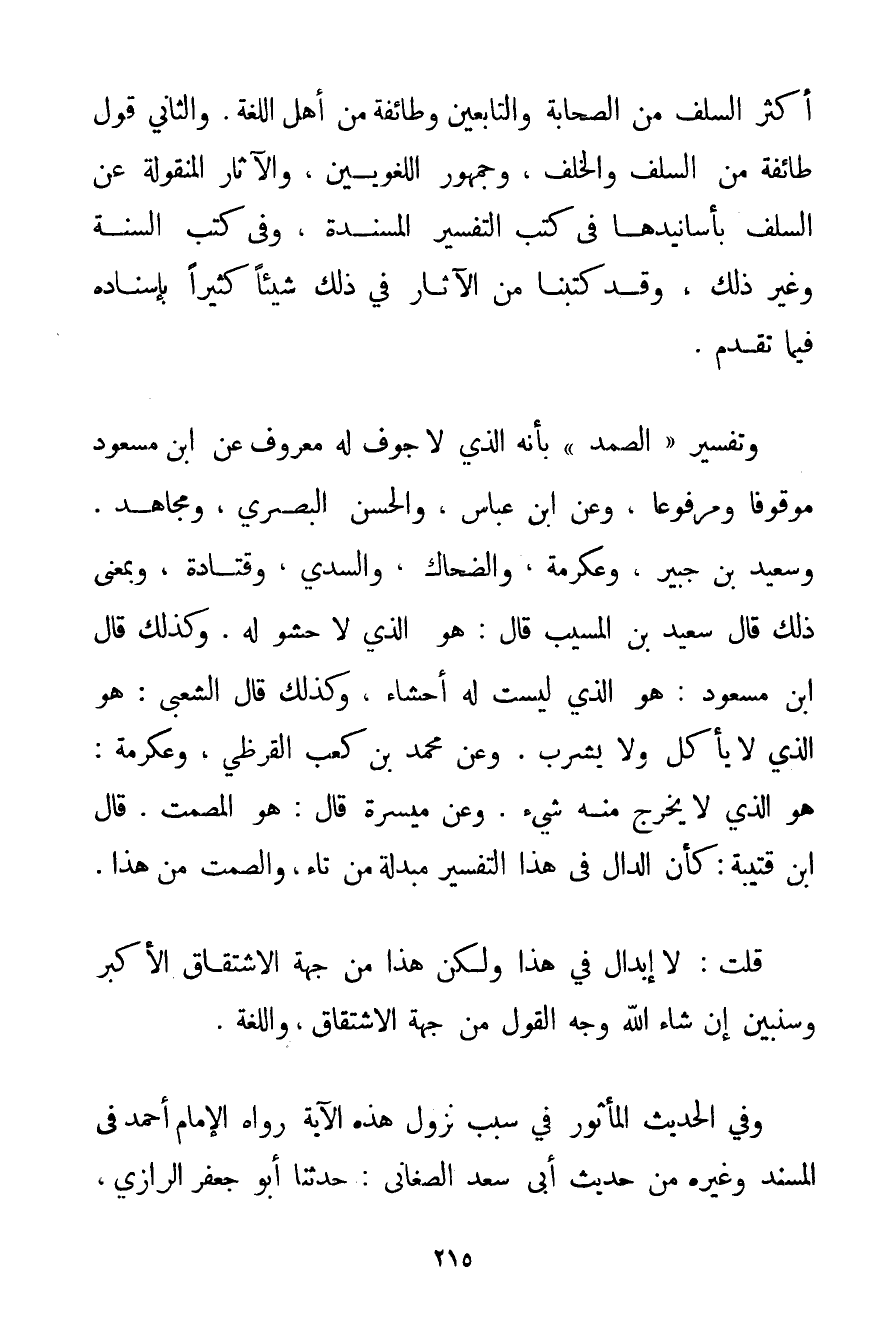 أَكْثَرِ السَّلَفِ مِنْ الصَّحَابَة وَالتَّابِعِينَ وَطَائِفَةٍ مِنْ أَهْلِ اللُّغَةِ. وَالثَّانِي قَوْلُ طَائِفَةٍ مِنْ السَّلَفِ وَالْخَلَفِ وَجُمْهُورِ اللُّغَوِيِّينَ وَالْآثَارِ الْمَنْقُولَةِ عَنْ السَّلَفِ بِأَسَانِيدِهَا فِي كُتُبِ التَّفْسِيرِ الْمُسْنَدَةِ وَفِي كُتُبِ السُّنَّةِ وَغَيْرِ ذَلِكَ وَقَدْ كَتَبْنَا مِنْ الْآثَارِ فِي ذَلِكَ شَيْئًا كَثِيرًا بِإِسْنَادِهِ فِيمَا تَقَدَّمَ. وَتَفْسِيرُ " الصَّمَدِ " بِأَنَّهُ الَّذِي لَا جَوْفَ لَهُ مَعْرُوفٌ عَنْ ابْنِ مَسْعُودٍ مَوْقُوفًا وَمَرْفُوعًا وَعَنْ ابْنِ عَبَّاسٍ وَالْحَسَنِ الْبَصْرِيِّ وَمُجَاهِدٍ. وَسَعِيدِ بْنِ جُبَيْرٍ وَعِكْرِمَةَ وَالضَّحَّاكِ والسدي وقتادة وَبِمَعْنَى ذَلِكَ قَالَ سَعِيدُ بْنُ الْمُسَيِّبِ قَالَ: هُوَ الَّذِي لَا حَشْوَ لَهُ. وَكَذَلِكَ قَالَ ابْنُ مَسْعُودٍ: هُوَ الَّذِي لَيْسَتْ لَهُ أَحْشَاءٌ وَكَذَلِكَ قَالَ الشَّعْبِيُّ: هُوَ الَّذِي لَا يَأْكُلُ وَلَا يَشْرَبُ. وَعَنْ مُحَمَّدِ بْنِ كَعْبٍ القرظي وَعِكْرِمَةَ: هُوَ الَّذِي لَا يَخْرُجُ مِنْهُ شَيْءٌ. وَعَنْ مَيْسَرَةَ قَالَ: هُوَ الْمُصْمَتُ. قَالَ ابْنُ قُتَيْبَةَ: كَأَنَّ الدَّالَ فِي هَذَا التَّفْسِيرِ مُبْدَلَةٌ مِنْ تَاءٍ والصمت مِنْ هَذَا. قُلْت: لَا إبْدَالَ فِي هَذَا وَلَكِنَّ هَذَا مِنْ جِهَةِ الِاشْتِقَاقِ الْأَكْبَرِ وَسَنُبَيِّنُ إنْ شَاءَ اللَّهُ وَجْهَ الْقَوْلِ مِنْ جِهَةِ الِاشْتِقَاقِ وَاللُّغَةِ. وَفِي الْحَدِيثِ الْمَأْثُورِ فِي سَبَبِ نُزُولِ هَذِهِ الْآيَةِ رَوَاهُ الْإِمَامُ أَحْمَد فِي الْمُسْنَدِ وَغَيْرِهِ مِنْ حَدِيثِ أَبِي سَعْدٍ الصغاني: حَدَّثَنَا أَبُو جَعْفَرٍ الرَّازِي