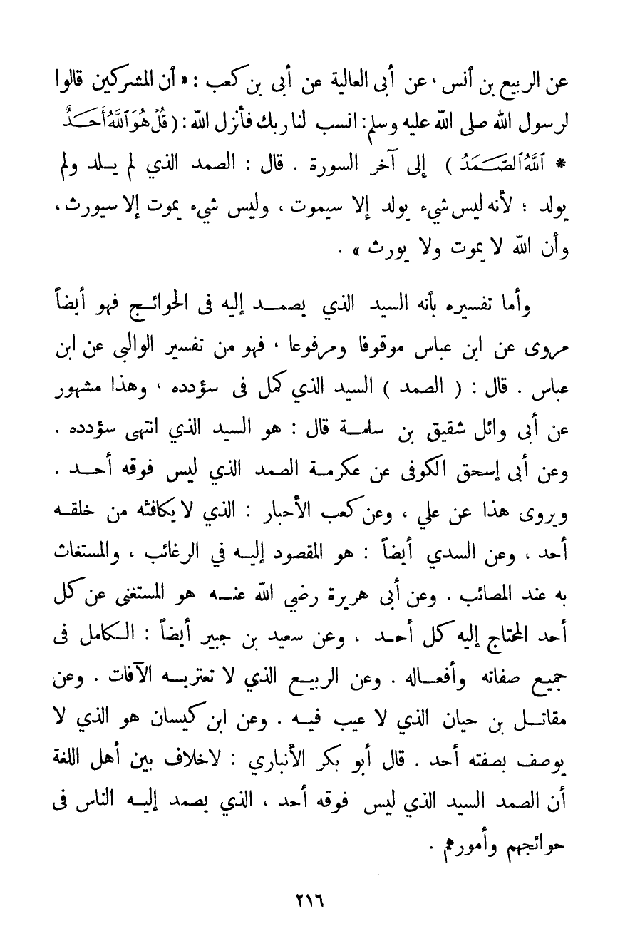 عَنْ الرَّبِيعِ بْنِ أَنَسٍ عَنْ أَبِي الْعَالِيَةِ عَنْ أبي بْنِ كَعْبٍ: {أَنَّ الْمُشْرِكِينَ قَالُوا لِرَسُولِ اللَّهِ صَلَّى اللَّهُ عَلَيْهِ وَسَلَّمَ اُنْسُبْ لَنَا رَبَّك فَأَنْزَلَ اللَّهُ: {قُلْ هُوَ اللَّهُ أَحَدٌ} {اللَّهُ الصَّمَدُ} إلَى آخِرِ السُّورَةِ. قَالَ: الصَّمَدُ الَّذِي لَمْ يَلِدْ وَلَمْ يُولَدْ؛ لِأَنَّهُ لَيْسَ شَيْءٌ يُولَدُ إلَّا سَيَمُوتُ وَلَيْسَ شَيْءٌ يَمُوتُ إلَّا سَيُورَثُ وَإِنَّ اللَّهَ لَا يَمُوتُ وَلَا يُورَثُ} . وَأَمَّا تَفْسِيرُهُ بِأَنَّهُ السَّيِّدُ الَّذِي يُصْمَدُ إلَيْهِ فِي الْحَوَائِجِ فَهُوَ أَيْضًا مَرْوِيٌّ عَنْ ابْنِ عَبَّاسٍ مَوْقُوفًا وَمَرْفُوعًا فَهُوَ مِنْ تَفْسِيرِ الْوَالِبِيَّ عَنْ ابْنِ عَبَّاسٍ. قَالَ: (الصَّمَدُ) السَّيِّدُ الَّذِي كَمُلَ فِي سُؤْدُدِهِ وَهَذَا مَشْهُورٌ عَنْ أَبِي وَائِلٍ شَقِيقِ بْنِ سَلَمَةَ قَالَ: هُوَ السَّيِّدُ الَّذِي انْتَهَى سُؤْدُدُهُ. وَعَنْ أَبِي إسْحَاقَ الْكُوفِيِّ عَنْ عِكْرِمَةَ الصَّمَدُ الَّذِي لَيْسَ فَوْقَهُ أَحَدٌ. وَيُرْوَى هَذَا عَنْ عَلِيٍّ وَعَنْ كَعْبِ الْأَحْبَارِ: الَّذِي لَا يُكَافِئُهُ مِنْ خَلْقِهِ أَحَدٌ وَعَنْ السدي أَيْضًا: هُوَ الْمَقْصُودُ إلَيْهِ فِي الرَّغَائِبِ وَالْمُسْتَغَاثِ بِهِ عِنْدَ الْمَصَائِبِ. وَعَنْ أَبِي هُرَيْرَةَ رَضِيَ اللَّهُ عَنْهُ هُوَ الْمُسْتَغْنِي عَنْ كُلِّ أَحَدٍ الْمُحْتَاجُ إلَيْهِ كُلُّ أَحَدٍ وَعَنْ سَعِيدِ بْنِ جُبَيْرٍ أَيْضًا: الْكَامِلُ فِي جَمِيعِ صِفَاتِهِ وَأَفْعَالِهِ. وَعَنْ الرَّبِيعِ الَّذِي لَا تَعْتَرِيهِ الْآفَاتُ. وَعَنْ مُقَاتِلِ بْنِ حَيَّانَ الَّذِي لَا عَيْبَ فِيهِ. وَعَنْ ابْنِ كيسان هُوَ الَّذِي لَا يُوصَفُ بِصِفَتِهِ أَحَدٌ. قَالَ أَبُو بَكْرٍ الْأَنْبَارِيُّ: لَا خِلَافَ بَيْنِ أَهْلِ اللُّغَةِ أَنَّ الصَّمَدَ السَّيِّدَ الَّذِي لَيْسَ فَوْقَهُ أَحَدٌ الَّذِي يَصْمُدُ إلَيْهِ النَّاسُ فِي حَوَائِجِهِمْ وَأُمُورِهِمْ.