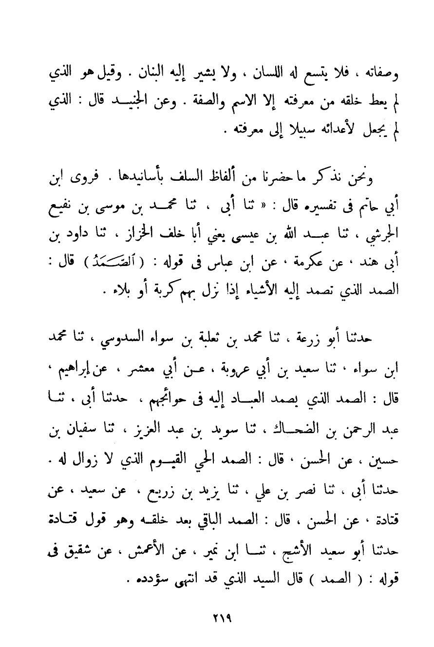 وَصِفَاتِهِ فَلَا يَتَّسِعُ لَهُ اللِّسَانُ وَلَا يُشِيرُ إلَيْهِ الْبَنَانُ. وَقِيلَ هُوَ الَّذِي لَمْ يُعْطِ خَلْقَهُ مِنْ مَعْرِفَتِهِ إلَّا الِاسْمَ وَالصِّفَةَ. وَعَنْ الْجُنَيْد قَالَ: الَّذِي لَمْ يَجْعَلْ لِأَعْدَائِهِ سَبِيلًا إلَى مَعْرِفَتِهِ. وَنَحْنُ نَذْكُرُ مَا حَضَرْنَا مِنْ أَلْفَاظِ السَّلَفِ بِأَسَانِيدِهَا. فَرَوَى ابْنُ أَبِي حَاتِمٍ فِي تَفْسِيرِهِ قَالَ: " ثنا أَبِي ثنا مُحَمَّدُ بْنُ مُوسَى بْنِ نفيع الجرشي ثنا عَبْدُ اللَّهِ بْنُ عِيسَى يَعْنِي أَبَا خَلَفٍ الْخَزَّازَ ثنا دَاوُد بْنُ أَبِي هِنْدٍ عَنْ عِكْرِمَةَ عَنْ ابْنِ عَبَّاسٍ فِي قَوْلِهِ: (الصَّمَدُ قَالَ: الصَّمَدُ الَّذِي تَصْمُدُ إلَيْهِ الْأَشْيَاءُ إذَا نَزَلَ بِهِمْ كُرْبَةٌ أَوْ بَلَاءٌ. حَدَّثَنَا أَبُو زُرْعَةَ ثنا مُحَمَّدُ بْنُ ثَعْلَبَةَ بْنِ سَوَاءٍ السدوسي ثنا مُحَمَّدُ بْنُ سَوَاءٍ ثنا سَعِيدُ بْنُ أَبِي عَرُوبَةَ عَنْ أَبِي مَعْشَرٍ عَنْ إبْرَاهِيمَ قَالَ: الصَّمَدُ الَّذِي يَصْمُدُ الْعِبَادُ إلَيْهِ فِي حَوَائِجِهِمْ حَدَّثَنَا أَبِي ثنا عَبْدُ الرَّحْمَنِ بْنُ الضَّحَّاكِ ثنا سُوِيدُ بْنُ عَبْدِ الْعَزِيزِ ثنا سُفْيَانُ بْنُ حُسَيْنٍ عَنْ الْحَسَنِ قَالَ: الصَّمَدُ الْحَيُّ الْقَيُّومُ الَّذِي لَا زَوَالَ لَهُ. حَدَّثَنَا أَبِي ثنا نَصْرُ بْنُ عَلِيٍّ ثنا يَزِيدُ بْنُ زريع عَنْ سَعِيدٍ عَنْ قتادة عَنْ الْحَسَنِ قَالَ: الصَّمَدُ الْبَاقِي بَعْدَ خَلْقِهِ وَهُوَ قَوْلُ قتادة حَدَّثَنَا أَبُو سَعِيدٍ الْأَشَجُّ ثنا ابْنُ نُمَيْرٍ عَنْ الْأَعْمَشِ عَنْ شَقِيقٍ فِي قَوْلِهِ: (الصَّمَدُ) قَالَ السَّيِّدُ الَّذِي قَدْ انْتَهَى سُؤْدُدُهُ.