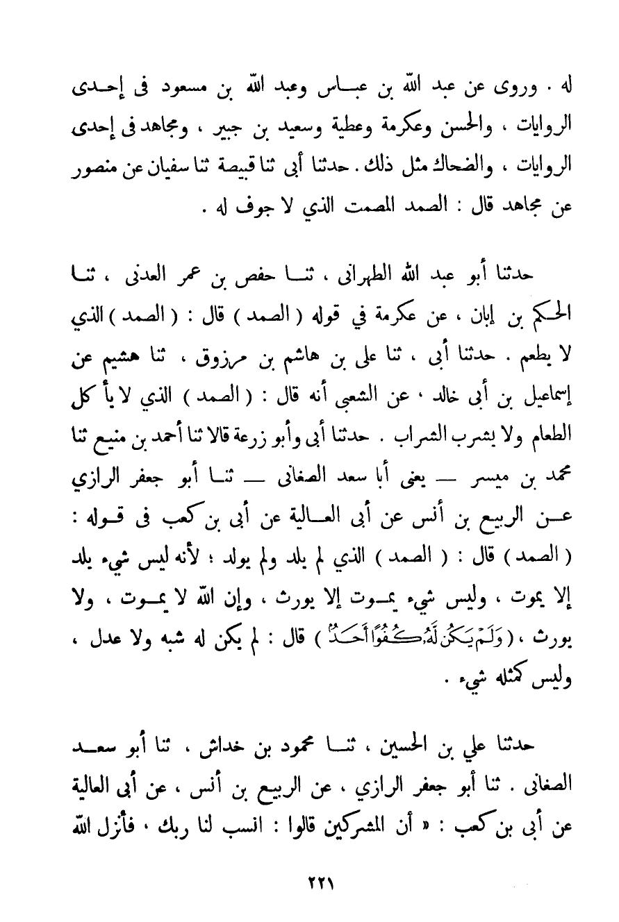 لَهُ. وَرُوِيَ عَنْ عَبْدِ اللَّهِ بْنِ عَبَّاسٍ وَعَبْدِ اللَّهِ بْنِ مَسْعُودٍ فِي إحْدَى الرِّوَايَاتِ وَالْحَسَنِ وَعِكْرِمَةَ وَعَطِيَّةَ وَسَعِيدِ بْنِ جُبَيْرٍ وَمُجَاهِدٍ فِي إحْدَى الرِّوَايَاتِ وَالضَّحَّاكُ مِثْلُ ذَلِكَ. حَدَّثَنَا أَبِي ثَنَا قَبِيصَةَ ثَنَا سُفْيَانُ عَنْ مَنْصُورٍ عَنْ مُجَاهِدٍ قَالَ: الصَّمَدُ الْمُصْمَتُ الَّذِي لَا جَوْفَ لَهُ. حَدَّثَنَا أَبُو عَبْدِ اللَّهِ الطهراني ثَنَا حَفْصُ بْنُ عُمَرَ الْعَدَنِيُّ ثَنَا الْحَكَمُ بْنُ أَبَانَ عَنْ عِكْرِمَةَ فِي قَوْلِهِ (الصَّمَدُ) قَالَ: (الصَّمَدُ) الَّذِي لَا يُطْعَمُ. حَدَّثَنَا أَبِي ثَنَا عَلِيُّ بْنُ هَاشِمِ بْنِ مَرْزُوقٍ ثَنَا هشيم عَنْ إسْمَاعِيلَ بْنِ أَبِي خَالِدٍ عَنْ الشَّعْبِيِّ أَنَّهُ قَالَ: (الصَّمَدُ) الَّذِي لَا يَأْكُلُ الطَّعَامَ وَلَا يَشْرَبُ الشَّرَابَ. حَدَّثَنَا أَبِي وَأَبُو زُرْعَةَ قَالَا ثَنَا أَحْمَد بْنُ مَنِيعٍ ثَنَا مُحَمَّدُ بْنُ مَيْسِرٍ - يَعْنِي أَبَا سَعْدٍ الصغاني - ثنا أَبُو جَعْفَرٍ الرَّازِي عَنْ الرَّبِيعِ بْنِ أَنَسٍ عَنْ أَبِي الْعَالِيَةِ عَنْ أبي بْنِ كَعْبٍ فِي قَوْلِهِ: (الصَّمَدُ) قَالَ: (الصَّمَدُ) الَّذِي لَمْ يَلِدْ وَلَمْ يُولَدْ؛ لِأَنَّهُ لَيْسَ شَيْءٌ يَلِدُ إلَّا يَمُوتُ وَلَيْسَ شَيْءٌ يَمُوتُ إلَّا يُورَثُ وَإِنَّ اللَّهَ لَا يَمُوتُ وَلَا يُورَثُ {وَلَمْ يَكُنْ لَهُ كُفُوًا أَحَدٌ} قَالَ: لَمْ يَكُنْ لَهُ شَبَهٌ وَلَا عِدْلٌ وَلَيْسَ كَمِثْلِهِ شَيْءٌ. حَدَّثَنَا عَلِيُّ بْنُ الْحُسَيْنِ ثنا مَحْمُودُ بْنُ خِدَاشٍ ثنا أَبُو سَعْدٍ الصغاني. ثنا أَبُو جَعْفَرٍ الرَّازِي عَنْ الرَّبِيعِ بْنِ أَنَسٍ عَنْ أَبِي الْعَالِيَةِ عَنْ أبي بْنِ كَعْبٍ: " أَنَّ الْمُشْرِكِينَ قَالُوا: اُنْسُبْ لَنَا رَبَّك فَأَنْزَلَ اللَّهُ