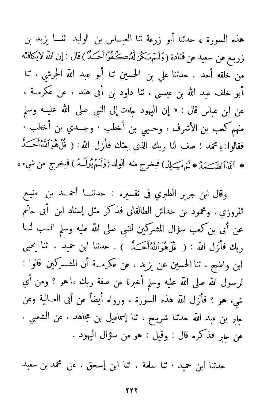 هَذِهِ السُّورَةَ " حَدَّثَنَا أَبُو زُرْعَةَ ثنا الْعَبَّاسُ بْن الْوَلِيدِ ثَنَا يَزِيدُ بْنُ زريع عَنْ سَعِيد عَنْ قتادة {وَلَمْ يَكُنْ لَهُ كُفُوًا أَحَدٌ} قَالَ: إنَّ اللَّهَ لَا يُكَافِئُهُ مِنْ خَلْقِهِ أَحَدٌ. حَدَّثَنَا عَلِيُّ بْنُ الْحُسَيْنِ ثَنَا أَبُو عَبْدِ اللَّهِ الجرشي ثَنَا أَبُو خَلَفٍ عَبْدُ اللَّهِ بْنُ عِيسَى ثَنَا دَاوُد بْنُ أَبِي هِنْدٍ عَنْ عِكْرِمَةَ عَنْ ابْنِ عَبَّاسٍ قَالَ: {إنَّ الْيَهُودَ جَاءَتْ إلَى النَّبِيِّ صَلَّى اللَّهُ عَلَيْهِ وَسَلَّمَ مِنْهُمْ كَعْبُ بْنُ الْأَشْرَفِ وحيي بْنُ أَخْطَبَ وجدي بْن أَخْطُبُ فَقَالُوا: يَا مُحَمَّد صَفُّ لَنَا رَبّك الَّذِي بَعَثَك فَأَنْزَلَ اللَّهُ: {قُلْ هُوَ اللَّهُ أَحَدٌ} {اللَّهُ الصَّمَدُ} {لَمْ يَلِدْ} فَيَخْرُجُ مِنْهُ الْوَلَدُ {وَلَمْ يُولَدْ} فَيَخْرُجُ مِنْهُ شَيْءٌ} وَقَالَ ابْنُ جَرِيرٍ الطبري فِي تَفْسِيرِهِ: حَدَّثَنَا أَحْمَد بْنُ مَنِيعٍ الْمَرْوَزِي. وَمَحْمُودُ بْنُ خِدَاشٍ الطالقاني فَذَكَرَ مِثْلَ إسْنَادِ ابْنِ أَبِي حَاتِمٍ عَنْ أبي بْنِ كَعْبَ {سُؤَال الْمُشْرِكِينَ لِلنَّبِيِّ صَلَّى اللَّهُ عَلَيْهِ وَسَلَّمَ اُنْسُبْ لَنَا رَبّك فَأَنْزَلَ اللَّهُ: {قُلْ هُوَ اللَّهُ أَحَدٌ} } . حَدَّثَنَا ابْنُ حميد ثَنَا يَحْيَى ابْنُ وَاضِحٍ ثَنَا الْحُسَيْنُ عَنْ يَزِيدَ عَنْ عِكْرِمَةَ {أَنَّ الْمُشْرِكِينَ قَالُوا: لِرَسُولِ اللَّهِ صَلَّى اللَّهُ عَلَيْهِ وَسَلَّمَ أَخْبِرْنَا عَنْ صِفَةِ رَبِّك مَا هُوَ؟ وَمِنْ أَيِّ شَيْءٍ هُوَ؟ فَأَنْزَلَ اللَّهُ هَذِهِ السُّورَةَ} وَرَوَاهُ أَيْضًا عَنْ أَبِي الْعَالِيَةِ وَعَنْ جَابِرِ بْنِ عَبْدِ اللَّهِ حَدَّثَنَا شريح ثَنَا إسْمَاعِيلُ بْنُ مُجَاهِدٍ عَنْ الشَّعْبِيِّ عَنْ جَابِرٍ فَذَكَرَهُ قَالَ: وَقِيلَ: هُوَ مِنْ سُؤَالِ الْيَهُودِ. حَدَّثَنَا ابْنُ حميد ثَنَا سَلَمَةُ ثَنَا ابْنُ إسْحَاقَ عَنْ مُحَمَّدِ بْنِ سَعِيدٍ