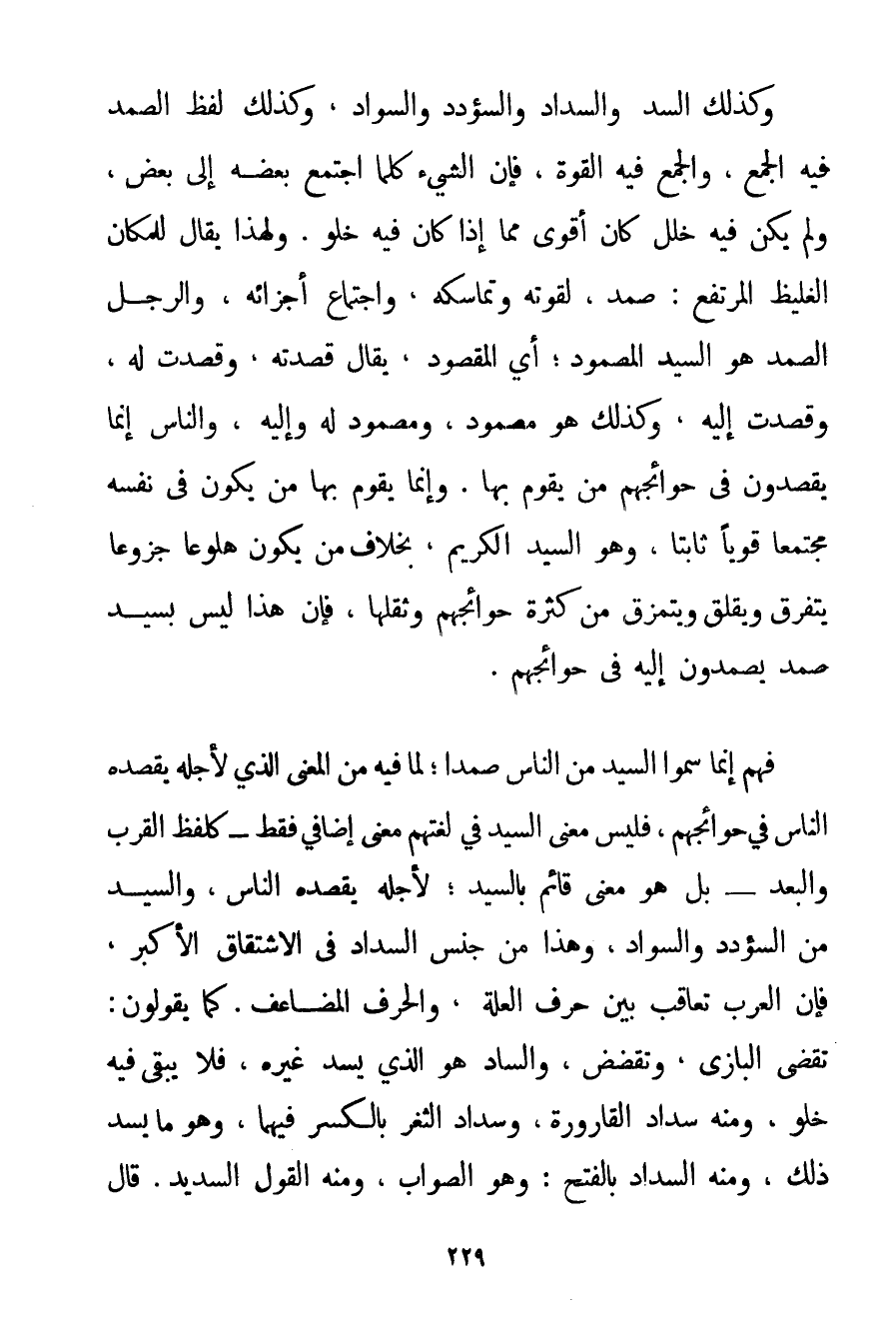وَكَذَلِكَ السَّدُّ وَالسَّدَادُ وَالسُّؤْدُدُ وَالسَّوَادُ وَكَذَلِكَ لَفْظُ الصَّمَدِ فِيهِ الْجَمْعُ وَالْجَمْعُ فِيهِ الْقُوَّةُ فَإِنَّ الشَّيْءَ كُلَّمَا اجْتَمَعَ بَعْضُهُ إلَى بَعْضٍ وَلَمْ يَكُنْ فِيهِ خَلَلٌ كَانَ أَقْوَى مِمَّا إذَا كَانَ فِيهِ خُلُوٌّ. وَلِهَذَا يُقَالُ لِلْمَكَانِ الْغَلِيظِ الْمُرْتَفِعِ: صَمَدٌ لِقُوَّتِهِ وَتَمَاسُكِهِ وَاجْتِمَاعِ أَجْزَائِهِ وَالرَّجُلُ الصَّمَدُ هُوَ السَّيِّدُ الْمَصْمُودُ؛ أَيْ الْمَقْصُودُ يُقَالُ قَصَدْته وَقَصَدْت لَهُ وَقَصَدْت إلَيْهِ وَكَذَلِكَ هُوَ مَصْمُودٌ وَمَصْمُودٌ لَهُ وَإِلَيْهِ وَالنَّاسُ إنَّمَا يَقْصِدُونَ فِي حَوَائِجِهِمْ مَنْ يَقُومُ بِهَا. وَإِنَّمَا يَقُومُ بِهَا مَنْ يَكُونُ فِي نَفْسِهِ مُجْتَمِعًا قَوِيًّا ثَابِتًا وَهُوَ السَّيِّدُ الْكَرِيمُ بِخِلَافِ مَنْ يَكُونُ هَلُوعًا جَزُوعًا يَتَفَرَّقُ وَيُقْلِقُ وَيَتَمَزَّقُ مِنْ كَثْرَةِ حَوَائِجِهِمْ وَثِقَلِهَا فَإِنَّ هَذَا لَيْسَ بِسَيِّدٍ صَمَدٍ يَصْمُدُونَ إلَيْهِ فِي حَوَائِجِهِمْ. فَهُمْ إنَّمَا سَمَّوْا السَّيِّدَ مِنْ النَّاسِ صَمَدًا؛ لِمَا فِيهِ مِنْ الْمَعْنَى الَّذِي لِأَجْلِهِ يَقْصِدُهُ النَّاسُ فِي حَوَائِجِهِمْ فَلَيْسَ مَعْنَى السَّيِّدِ فِي لُغَتِهِمْ مَعْنًى إضَافِيٍّ فَقَطْ - كَلَفْظِ الْقُرْبِ وَالْبُعْدِ - بَلْ هُوَ مَعْنًى قَائِمٌ بِالسَّيِّدِ؛ لِأَجْلِهِ يَقْصِدُهُ النَّاسُ وَالسَّيِّدُ مِنْ السُّؤْدُدِ وَالسَّوَادِ وَهَذَا مِنْ جِنْسِ السَّدَادِ فِي الِاشْتِقَاقِ الْأَكْبَرِ فَإِنَّ الْعَرَبَ تُعَاقِبُ بَيْنَ حَرْفِ الْعِلَّةِ وَالْحَرْفِ الْمُضَاعَفِ. كَمَا يَقُولُونَ: تَقَضَّى الْبَازِي وَتَقَضَّضَ وَالسَّادُّ هُوَ الَّذِي يَسُدُّ غَيْرَهُ فَلَا يَبْقَى فِيهِ خُلُوٌّ وَمِنْهُ سَدَادُ الْقَارُورَةِ وَسِدَادُ الثَّغْرِ بِالْكَسْرِ فِيهِمَا وَهُوَ مَا يَسُدُّ ذَلِكَ وَمِنْهُ السَّدَادُ بِالْفَتْحِ: وَهُوَ الصَّوَابُ وَمِنْهُ الْقَوْلُ السَّدِيدُ. قَالَ