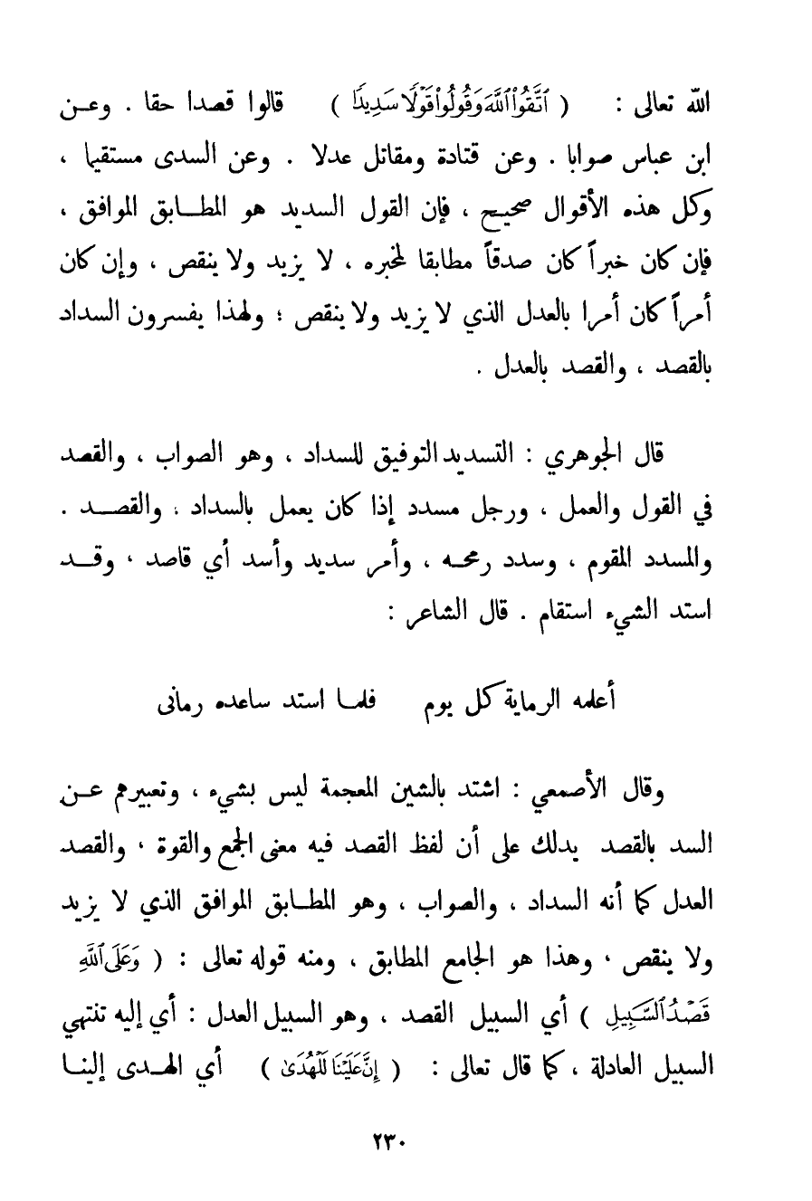 اللَّهُ تَعَالَى: {اتَّقُوا اللَّهَ وَقُولُوا قَوْلًا سَدِيدًا} قَالُوا قَصْدًا حَقًّا. وَعَنْ ابْنِ عَبَّاسٍ صَوَابًا. وَعَنْ قتادة وَمُقَاتِلٍ عَدْلًا. وَعَنْ السدي مُسْتَقِيمًا وَكُلُّ هَذِهِ الْأَقْوَالِ صَحِيحٌ فَإِنَّ الْقَوْلَ السَّدِيدَ هُوَ الْمُطَابِقُ الْمُوَافِقُ فَإِنْ كَانَ خَبَرًا كَانَ صِدْقًا مُطَابِقًا لِمُخْبِرِهِ لَا يَزِيدُ وَلَا يَنْقُصُ وَإِنْ كَانَ أَمْرًا كَانَ أَمْرًا بِالْعَدْلِ الَّذِي لَا يَزِيدُ وَلَا يَنْقُصُ؛ وَلِهَذَا يُفَسِّرُونَ السَّدَادَ بِالْقَصْدِ وَالْقَصْدَ بِالْعَدْلِ. قَالَ الْجَوْهَرِيُّ: التَّسْدِيدُ التَّوْفِيقُ لِلسَّدَادِ وَهُوَ الصَّوَابُ وَالْقَصْدُ فِي الْقَوْلِ وَالْعَمَلِ وَرَجُلٌ مُسَدَّدٌ إذَا كَانَ يَعْمَلُ بِالسَّدَادِ. وَالْقَصْدُ. وَالْمُسَدَّدُ الْمُقَوَّمُ وَسَدَّدَ رُمْحَهُ وَأَمْرٌ سَدِيدٌ وَأَسَدُّ أَيْ قَاصِدٌ وَقَدْ اسْتَدَّ الشَّيْءُ اسْتَقَامَ. قَالَ الشَّاعِرُ: أُعَلِّمُهُ الرِّمَايَةَ كُلَّ يَوْمٍ فَلَمَّا اسْتَدَّ سَاعِدُهُ رَمَانِي وَقَالَ الْأَصْمَعِيُّ: اشْتَدَّ بِالشِّينِ الْمُعْجَمَةِ لَيْسَ بِشَيْءِ وَتَعْبِيرُهُمْ عَنْ السَّدِّ بِالْقَصْدِ يَدُلُّك عَلَى أَنَّ لَفْظَ الْقَصْدِ فِيهِ مَعْنَى الْجَمْعِ وَالْقُوَّةِ وَالْقَصْدُ الْعَدْلُ كَمَا أَنَّهُ السَّدَادُ وَالصَّوَابُ وَهُوَ الْمُطَابِقُ الْمُوَافِقُ الَّذِي لَا يَزِيدُ وَلَا يَنْقُصُ وَهَذَا هُوَ الْجَامِعُ الْمُطَابِقُ وَمِنْهُ قَوْلُهُ تَعَالَى: {وَعَلَى اللَّهِ قَصْدُ السَّبِيلِ} أَيْ السَّبِيلُ الْقَصْدُ وَهُوَ السَّبِيلُ الْعَدْلُ: أَيْ إلَيْهِ تَنْتَهِي السَّبِيلُ الْعَادِلَةُ كَمَا قَالَ تَعَالَى: {إنَّ عَلَيْنَا لَلْهُدَى} أَيْ الْهُدَى إلَيْنَا