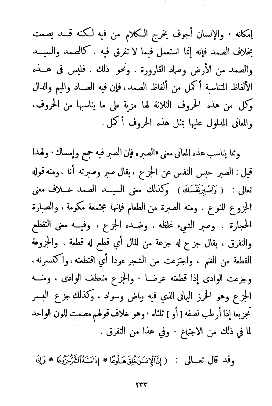 إمْكَانِهِ وَالْإِنْسَانُ أَجْوَفُ يُخْرِجُ الْكَلَامَ مِنْ فِيهِ لَكِنَّهُ قَدْ يَصْمُتُ بِخِلَافِ الصَّمَدِ فَإِنَّهُ إنَّمَا اُسْتُعْمِلَ فِيمَا لَا تَفَرُّقَ فِيهِ كَالصَّمَدِ وَالسَّيِّدِ وَالصَّمَدُ مِنْ الْأَرْضِ وَصِمَادُ الْقَارُورَةِ وَنَحْوِ ذَلِكَ. فَلَيْسَ فِي هَذِهِ الْأَلْفَاظِ الْمُتَنَاسِبَةِ أَكْمَلُ مِنْ أَلْفَاظِ الصَّمَدِ فَإِنَّ فِيهِ الصَّادَ وَالْمِيمَ وَالدَّالَ وَكُلٌّ مِنْ هَذِهِ الْحُرُوفِ الثَّلَاثَةِ لَهَا مَزِيَّةَ عَلَى مَا يُنَاسِبُهَا مِنْ الْحُرُوفِ وَالْمَعَانِي الْمَدْلُولِ عَلَيْهَا بِمِثْلِ هَذِهِ الْحُرُوفِ أَكْمَلَ. وَمِمَّا يُنَاسِبُ هَذِهِ الْمَعَانِي مَعْنَى " الصَّبْرِ " فَإِنَّ الصَّبْرَ فِيهِ جَمْعٌ وَإِمْسَاكٌ وَلِهَذَا قِيلَ: الصَّبْرُ حَبْسُ النَّفْسِ عَنْ الْجَزَعِ يُقَالُ صَبَرَ وَصَبَّرْته أَنَا وَمِنْهُ قَوْلُهُ تَعَالَى: {وَاصْبِرْ نَفْسَكَ} وَكَذَلِكَ مَعْنَى السَّيِّدِ الصَّمَدُ خِلَافُ مَعْنَى الْجَزُوعِ الْمُنَوَّعِ وَمِنْهُ الصُّبْرَةُ مِنْ الطَّعَامِ فَإِنَّهَا مُجْتَمِعَةٌ مُكَوَّمَةٌ والصبارة الْحِجَارَةُ وَصَبْرُ الشَّيْءِ غِلَظُهُ وَضِدُّهُ الْجَزَعُ وَفِيهِ مَعْنَى التَّقَطُّعِ وَالتَّفَرُّقِ يُقَالُ جَزَعَ لَهُ جِزْعَةً مِنْ الْمَالِ أَيْ قَطَعَ لَهُ قِطْعَةً وَالْجُزَيْعَةُ: الْقِطْعَةُ مِنْ الْغَنَمِ واجتزعت مِنْ الشَّجَرِ عُودًا أَيْ اقْتَطَعْته واكتسرته وَجَزَعْت الْوَادِيَ إذَا قَطَعْته عَرْضًا وَالْجَزْعُ مُنْعَطَف الْوَادِي وَمِنْهُ الْجَزْعُ وَهُوَ الْخَرَزُ الْيَمَانِيُّ الَّذِي فِيهِ بَيَاضٌ وَسَوَادٌ وَكَذَلِكَ جَزَّعَ الْبُسْرَ تَجْزِيعًا إذَا أَرْطَبَ نِصْفُهُ أَوْ ثُلُثَاهُ وَهُوَ خِلَافُ قَوْلِهِمْ مُصْمَتٌ لِلَّوْنِ الْوَاحِدِ لِمَا فِي ذَلِكَ مِنْ الِاجْتِمَاعِ وَفِي هَذَا مِنْ التَّفَرُّقِ. وَقَدْ قَالَ تَعَالَى: {إنَّ الْإِنْسَانَ خُلِقَ هَلُوعًا} {إذَا مَسَّهُ الشَّرُّ