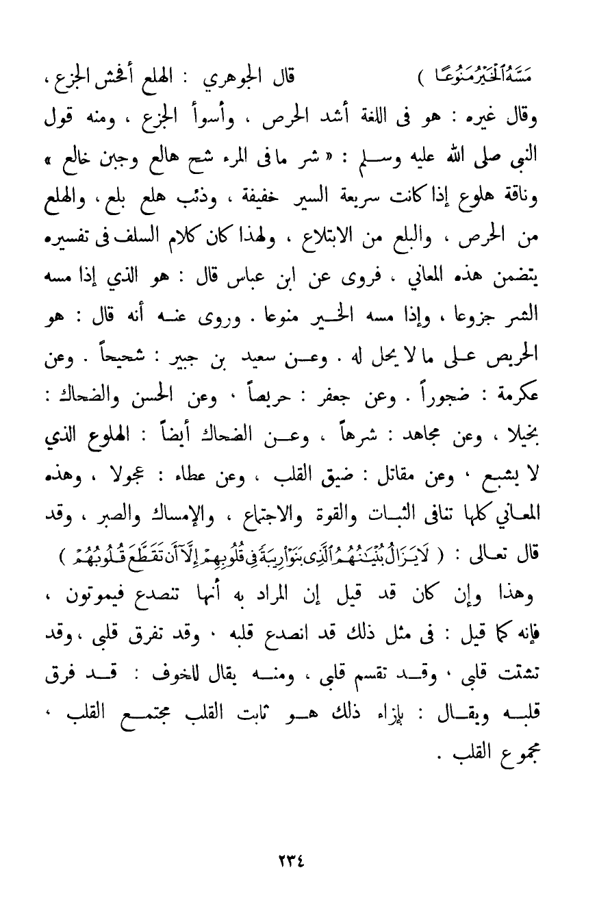 جَزُوعًا} {وَإِذَا مَسَّهُ الْخَيْرُ مَنُوعًا} قَالَ الْجَوْهَرِيُّ: الْهَلَعُ أَفْحَشُ الْجَزَعِ وَقَالَ غَيْرُهُ: هُوَ فِي اللُّغَةِ أَشَدُّ الْحِرْصِ وَأَسْوَأُ الْجَزَعِ وَمِنْهُ قَوْلُ النَّبِيِّ صَلَّى اللَّهُ عَلَيْهِ وَسَلَّمَ {شَرُّ مَا فِي الْمَرْءِ شُحٌّ هَالِعٌ وَجُبْنٌ خَالِعٌ} وَنَاقَةٌ هَلُوعٌ إذَا كَانَتْ سَرِيعَةَ السَّيْرِ خَفِيفَةً وَذِئْبٌ هَلِعٌ بُلَعٌ وَالْهَلِعُ مِنْ الْحِرْصِ وَالْبُلَعُ مِنْ الِابْتِلَاعِ وَلِهَذَا كَانَ كَلَامُ السَّلَفِ فِي تَفْسِيرِهِ يَتَضَمَّنُ هَذِهِ الْمَعَانِي فَرُوِيَ عَنْ ابْنِ عَبَّاسٍ قَالَ: هُوَ الَّذِي إذَا مَسَّهُ الشَّرُّ جَزُوعًا وَإِذَا مَسَّهُ الْخَيْرُ مَنُوعًا. وَرُوِيَ عَنْهُ أَنَّهُ قَالَ: هُوَ الْحَرِيصُ عَلَى مَا لَا يَحِلُّ لَهُ. وَعَنْ سَعِيدِ بْنِ جُبَيْرٍ: شَحِيحًا. وَعَنْ عِكْرِمَةَ: ضَجُورًا. وَعَنْ جَعْفَرٍ: حَرِيصًا وَعَنْ الْحَسَنِ وَالضَّحَّاكِ: بَخِيلًا وَعَنْ مُجَاهِدٍ: شَرِهًا وَعَنْ الضَّحَّاكِ أَيْضًا: الْهَلُوعُ الَّذِي لَا يَشْبَعُ وَعَنْ مُقَاتِلٍ: ضَيِّقُ الْقَلْبِ وَعَنْ عَطَاءٍ: عَجُولًا وَهَذِهِ الْمَعَانِي كُلُّهَا تُنَافِي الثَّبَاتَ وَالْقُوَّةَ وَالِاجْتِمَاعَ وَالْإِمْسَاكَ وَالصَّبْرَ وَقَدْ قَالَ تَعَالَى: {لَا يَزَالُ بُنْيَانُهُمُ الَّذِي بَنَوْا رِيبَةً فِي قُلُوبِهِمْ إلَّا أَنْ تَقَطَّعَ قُلُوبُهُمْ} وَهَذَا وَإِنْ كَانَ قَدْ قِيلَ إنَّ الْمُرَادَ بِهِ أَنَّهَا تَنْصَدِعُ فَيَمُوتُونَ فَإِنَّهُ كَمَا قِيلَ: فِي مِثْلِ ذَلِكَ قَدْ انْصَدَعَ قَلْبُهُ وَقَدْ تَفَرَّقَ قَلْبِي وَقَدْ تَشَتَّتَ قَلْبِي وَقَدْ تَقَسَّمَ قَلْبِي وَمِنْهُ يُقَالُ لِلْخَوْفِ: قَدْ فَرَّقَ قَلْبَهُ وَيُقَالُ: بِإِزَاءِ ذَلِكَ هُوَ ثَابِتُ الْقَلْبِ مُجْتَمَعُ الْقَلْبِ مَجْمُوعُ الْقَلْبِ.