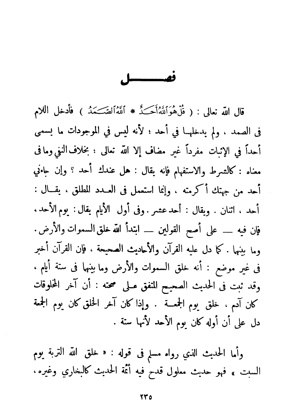 قَالَ اللَّهُ تَعَالَى: {قُلْ هُوَ اللَّهُ أَحَدٌ} {اللَّهُ الصَّمَدُ} فَأَدْخَلَ اللَّامَ فِي الصَّمَدِ وَلَمْ يُدْخِلْهَا فِي أَحَدٍ؛ لِأَنَّهُ لَيْسَ فِي الْمَوْجُودَاتِ مَا يُسَمَّى أَحَدًا فِي الْإِثْبَاتِ مُفْرِدًا غَيْرَ مُضَافٍ إلَّا اللَّهُ تَعَالَى؛ بِخِلَافِ النَّفْيِ وَمَا فِي مَعْنَاهُ: كَالشَّرْطِ وَالِاسْتِفْهَامِ فَإِنَّهُ يُقَالُ: هَلْ عِنْدَك أَحَدٌ؟ وَإِنْ جَاءَنِي أَحَدٌ مِنْ جِهَتِك أَكْرَمْته وَإِنَّمَا اُسْتُعْمِلَ فِي الْعَدَدِ الْمُطْلَقِ يُقَالُ: أَحَدٌ اثْنَانِ. وَيُقَالُ: أَحَدٌ عَشْرٌ. وَفِي أَوَّلِ الْأَيَّامِ يُقَالُ: يَوْمُ الْأَحَدِ. فَإِنَّ فِيهِ - عَلَى أَصَحِّ الْقَوْلَيْنِ - ابْتَدَأَ اللَّهُ خَلْقَ السَّمَاوَاتِ وَالْأَرْضَ. وَمَا بَيْنَهُمَا. كَمَا دَلَّ عَلَيْهِ الْقُرْآنُ وَالْأَحَادِيثُ الصَّحِيحَةُ فَإِنَّ الْقُرْآنَ أَخْبَرَ فِي غَيْرِ مَوْضِعٍ: أَنَّهُ خَلَقَ السَّمَاوَاتِ وَالْأَرْضَ وَمَا بَيْنَهُمَا فِي سِتَّةِ أَيَّامٍ وَقَدْ ثَبَتَ فِي الْحَدِيثِ الصَّحِيحِ الْمُتَّفَقِ عَلَى صِحَّتِهِ: أَنَّ آخِرَ الْمَخْلُوقَاتِ كَانَ آدَمَ خُلِقَ يَوْم الْجُمُعَةِ. وَإِذَا كَانَ آخِرُ الْخَلْقِ كَانَ يَوْمَ الْجُمُعَةِ دَلَّ عَلَى أَنَّ أَوَّلَهُ كَانَ يَوْمَ الْأَحَدِ لِأَنَّهَا سِتَّةٌ. وَأَمَّا الْحَدِيثُ الَّذِي رَوَاهُ مُسْلِمٌ فِي قَوْلِهِ: {خَلَقَ اللَّهُ التُّرْبَةَ يَوْمَ السَّبْتِ} فَهُوَ حَدِيثٌ مَعْلُولٌ قَدَحَ فِيهِ أَئِمَّةُ الْحَدِيثِ كَالْبُخَارِيِّ وَغَيْرِهِ