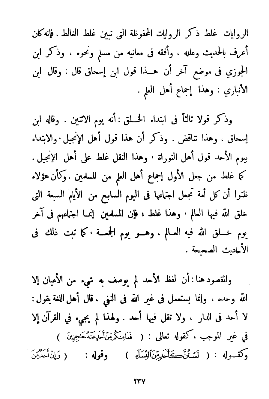 الرِّوَايَاتِ غَلَطٌ ذَكَرَ الرِّوَايَاتِ الْمَحْفُوظَةَ الَّتِي تُبَيِّنُ غَلَطَ الغالط فَإِنَّهُ كَانَ أَعْرَفَ بِالْحَدِيثِ وَعِلَلِهِ وَأَفْقَهَ فِي مَعَانِيهِ مِنْ مُسْلِمٍ وَنَحْوِهِ وَذَكَرَ ابْنُ الْجَوْزِيِّ فِي مَوْضِعٍ آخَرَ أَنَّ هَذَا قَوْلُ ابْنِ إسْحَاقَ قَالَ: وَقَالَ ابْنُ الْأَنْبَارِيِّ: وَهَذَا إجْمَاعُ أَهْلِ الْعِلْمِ. وَذَكَرَ قَوْلًا ثَالِثًا فِي ابْتِدَاءِ الْخَلْقِ: أَنَّهُ يَوْمَ الِاثْنَيْنِ. وَقَالَهُ ابْنُ إسْحَاقَ وَهَذَا تَنَاقُضٌ. وَذَكَرَ أَنَّ هَذَا قَوْلُ أَهْلِ الْإِنْجِيلِ وَالِابْتِدَاءُ بِيَوْمِ الْأَحَدِ قَوْلُ أَهْلِ التَّوْرَاةِ وَهَذَا النَّقْلُ غَلَطٌ عَلَى أَهْلِ الْإِنْجِيلِ. كَمَا غَلِطَ مَنْ جَعَلَ الْأَوَّلَ إجْمَاعَ أَهْلِ الْعِلْمِ مِنْ الْمُسْلِمِينَ. وَكَأَنَّ هَؤُلَاءِ ظَنُّوا أَنَّ كُلَّ أُمَّةٍ تَجْعَلُ اجْتِمَاعَهَا فِي الْيَوْمِ السَّابِعِ مِنْ الْأَيَّامِ السَّبْعَةِ الَّتِي خَلَقَ اللَّهُ فِيهَا الْعَالَمَ وَهَذَا غَلَطٌ؛ فَإِنَّ الْمُسْلِمِينَ إنَّمَا اجْتِمَاعُهُمْ فِي آخِرِ يَوْمٍ خَلَقَ اللَّهُ فِيهِ الْعَالَمَ وَهُوَ يَوْمُ الْجُمُعَةِ كَمَا ثَبَتَ ذَلِكَ فِي الْأَحَادِيثِ الصَّحِيحَةِ. وَالْمَقْصُودُ هُنَا: أَنَّ لَفْظَ الْأَحَدِ لَمْ يُوصَفْ بِهِ شَيْءٌ مِنْ الْأَعْيَانِ إلَّا اللَّهُ وَحْدَهُ. وَإِنَّمَا يُسْتَعْمَلُ فِي غَيْرِ اللَّهِ فِي النَّفْيِ قَالَ أَهْلُ اللُّغَةِ يَقُولُ: لَا أَحَدَ فِي الدَّارِ وَلَا تَقُلْ فِيهَا أَحَدٌ. وَلِهَذَا لَمْ يَجِئْ فِي الْقُرْآنِ إلَّا فِي غَيْرِ الْمُوجَبِ كَقَوْلِهِ تَعَالَى: {فَمَا مِنْكُمْ مِنْ أَحَدٍ عَنْهُ حَاجِزِينَ} وَكَقَوْلِهِ: {لَسْتُنَّ كَأَحَدٍ مِنَ النِّسَاءِ} وَقَوْلِهِ: {وَإِنْ أَحَدٌ مِنَ