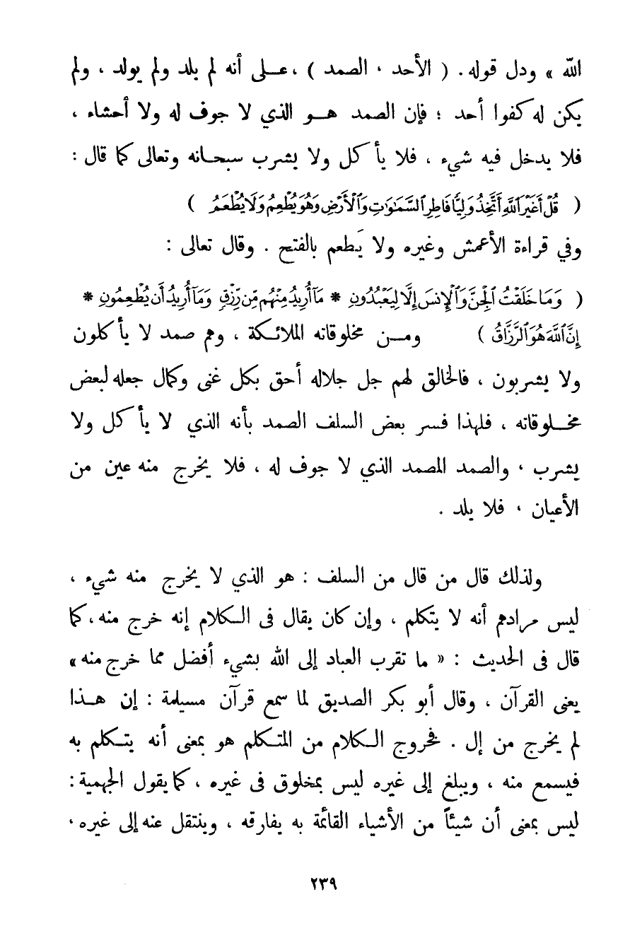 السَّيِّدُ اللَّهُ} وَدَلَّ قَوْلُهُ. (الْأَحَدُ، الصَّمَدُ) عَلَى أَنَّهُ لَمْ يَلِدْ وَلَمْ يُولَدْ وَلَمْ يَكُنْ لَهُ كُفُوًا أَحَدٌ؛ فَإِنَّ الصَّمَدَ هُوَ الَّذِي لَا جَوْفَ لَهُ وَلَا أَحْشَاءَ فَلَا يَدْخُلُ فِيهِ شَيْءٌ فَلَا يَأْكُلُ وَلَا يَشْرَبُ سُبْحَانَهُ وَتَعَالَى كَمَا قَالَ: {أَغَيْرَ اللَّهِ أَتَّخِذُ وَلِيًّا فَاطِرِ السَّمَاوَاتِ وَالْأَرْضِ وَهُوَ يُطْعِمُ وَلَا يُطْعَمُ} وَفِي قِرَاءَةِ الْأَعْمَشِ وَغَيْرِهِ وَلَا يُطْعَمَ بِالْفَتْحِ. وَقَالَ تَعَالَى: {وَمَا خَلَقْتُ الْجِنَّ وَالْإِنْسَ إلَّا لِيَعْبُدُونِ} {مَا أُرِيدُ مِنْهُمْ مِنْ رِزْقٍ وَمَا أُرِيدُ أَنْ يُطْعِمُونِ} {إنَّ اللَّهَ هُوَ الرَّزَّاقُ} وَمِنْ مَخْلُوقَاتِهِ الْمَلَائِكَةُ وَهُمْ صَمَدٌ لَا يَأْكُلُونَ وَلَا يَشْرَبُونَ فَالْخَالِقُ لَهُمْ جَلَّ جَلَالُهُ أَحَقُّ بِكُلِّ غِنًى وَكَمَالٍ جَعَلَهُ لِبَعْضِ مَخْلُوقَاتِهِ فَلِهَذَا فَسَّرَ بَعْضُ السَّلَفِ الصَّمَدَ بِأَنَّهُ الَّذِي لَا يَأْكُلُ وَلَا يَشْرَبُ وَالصَّمَدُ الْمُصْمَدُ الَّذِي لَا جَوْفَ لَهُ فَلَا يَخْرُجُ مِنْهُ عَيْنٌ مِنْ الْأَعْيَانِ فَلَا يَلِدُ. وَلِذَلِكَ قَالَ مَنْ قَال مِنْ السَّلَفِ: هُوَ الَّذِي لَا يَخْرُجُ مِنْهُ شَيْءٌ لَيْسَ مُرَادُهُمْ أَنَّهُ لَا يَتَكَلَّمُ وَإِنْ كَانَ يُقَالُ فِي الْكَلَامِ إنَّهُ خَرَجَ مِنْهُ كَمَا قَالَ فِي الْحَدِيثِ: {مَا تَقَرَّبَ الْعِبَادُ إلَى اللَّهِ بِشَيْءٍ أَفْضَلَ مِمَّا خَرَجَ مِنْهُ} يَعْنِي الْقُرْآنَ وَقَالَ أَبُو بَكْرٍ الصِّدِّيقُ لَمَّا سَمِعَ قُرْآنَ مُسَيْلِمَةَ: إنَّ هَذَا لَمْ يَخْرُجْ مِنْ إلٍّ. فَخُرُوجُ الْكَلَامِ مِنْ الْمُتَكَلِّمِ هُوَ بِمَعْنَى أَنَّهُ يَتَكَلَّمُ بِهِ فَيَسْمَعُ مِنْهُ وَيَبْلُغُ إلَى غَيْرِهِ لَيْسَ بِمَخْلُوقٍ فِي غَيْرِهِ كَمَا يَقُولُ الْجَهْمِيَّة: لَيْسَ بِمَعْنَى أَنَّ شَيْئًا مِنْ الْأَشْيَاءِ الْقَائِمَةِ بِهِ يُفَارِقُهُ وَيَنْتَقِلُ عَنْهُ إلَى غَيْرِهِ