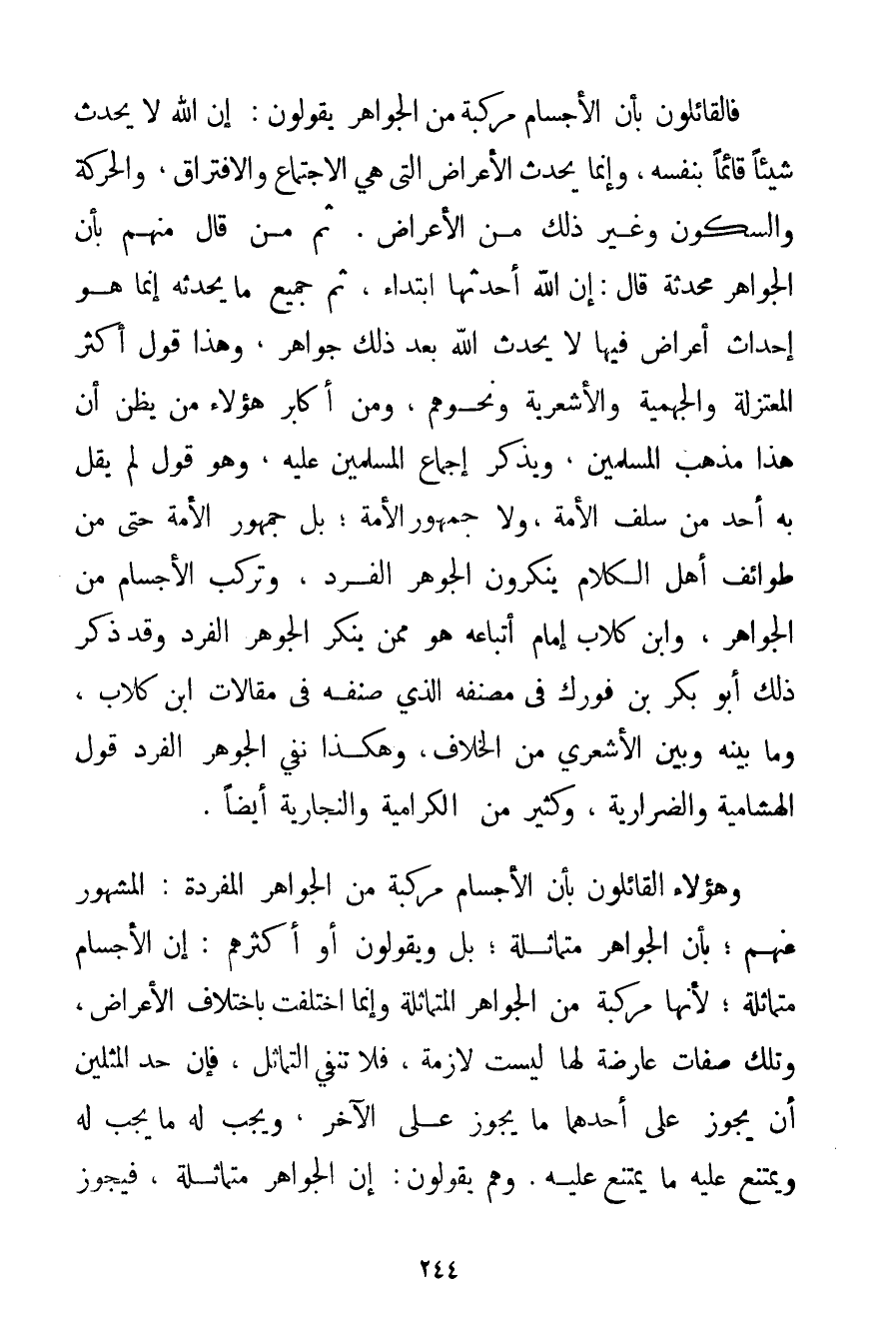 فَالْقَائِلُونَ بِأَنَّ الْأَجْسَامَ مُرَكَّبَةٌ مِنْ الْجَوَاهِرِ يَقُولُونَ: إنَّ اللَّهَ لَا يُحْدِثُ شَيْئًا قَائِمًا بِنَفْسِهِ وَإِنَّمَا يُحْدِثُ الْأَعْرَاضَ الَّتِي هِيَ الِاجْتِمَاعُ وَالِافْتِرَاقُ وَالْحَرَكَةُ وَالسُّكُونُ وَغَيْرُ ذَلِكَ مِنْ الْأَعْرَاضِ. ثُمَّ مَنْ قَالَ مِنْهُمْ بِأَنَّ الْجَوَاهِرَ مُحْدَثَةٌ قَالَ: إنَّ اللَّهَ أَحْدَثَهَا ابْتِدَاءً ثُمَّ جَمِيعُ مَا يُحْدِثُهُ إنَّمَا هُوَ إحْدَاثُ أَعْرَاضٍ فِيهَا لَا يُحْدِثُ اللَّهُ بَعْد ذَلِكَ جَوَاهِرَ وَهَذَا قَوْلُ أَكْثَرِ الْمُعْتَزِلَةِ وَالْجَهْمِيَّة وَالْأَشْعَرِيَّةِ وَنَحْوِهِمْ وَمِنْ أَكَابِرِ هَؤُلَاءِ مَنْ يَظُنُّ أَنَّ هَذَا مَذْهَبُ الْمُسْلِمِينَ وَيَذْكُرُ إجْمَاعَ الْمُسْلِمِينَ عَلَيْهِ وَهُوَ قَوْلٌ لَمْ يَقُلْ بِهِ أَحَدٌ مِنْ سَلَفِ الْأُمَّةِ وَلَا جُمْهُورِ الْأُمَّةِ؛ بَلْ جُمْهُورُ الْأُمَّةِ حَتَّى مِنْ طَوَائِفِ أَهْلِ الْكَلَامِ يُنْكِرُونَ الْجَوْهَرَ الْفَرْدَ وَتَرَكُّبَ الْأَجْسَامِ مِنْ الْجَوَاهِرِ وَابْنُ كُلَّابٍ إمَامُ أَتْبَاعِهِ هُوَ مِمَّنْ يُنْكِرُ الْجَوْهَرَ الْفَرْدَ وَقَدْ ذَكَرَ ذَلِكَ أَبُو بَكْرٍ بْنُ فورك فِي مُصَنَّفِهِ الَّذِي صَنَّفَهُ فِي مَقَالَاتِ ابْنِ كُلَّابٍ وَمَا بَيْنَهُ وَبَيْنَ الْأَشْعَرِيِّ مِنْ الْخِلَافِ وَهَكَذَا نَفَى الْجَوْهَرَ الْفَرْدَ قَوْلُ الهشامية والضرارية وَكَثِيرٍ مِنْ الكَرَّامِيَة والنجارية أَيْضًا. وَهَؤُلَاءِ الْقَائِلُونَ بِأَنَّ الْأَجْسَامَ مُرَكَّبَةٌ مِنْ الْجَوَاهِرِ الْمُفْرَدَةِ: الْمَشْهُورُ عَنْهُمْ؛ بِأَنَّ الْجَوَاهِرَ مُتَمَاثِلَةٌ؛ بَلْ وَيَقُولُونَ أَوْ أَكْثَرُهُمْ: أَنَّ الْأَجْسَامَ مُتَمَاثِلَةٌ؛ لِأَنَّهَا مُرَكَّبَةٌ مِنْ الْجَوَاهِرِ الْمُتَمَاثِلَةِ وَإِنَّمَا اخْتَلَفَتْ بِاخْتِلَافِ الْأَعْرَاضِ وَتِلْكَ صِفَاتٌ عَارِضَةٌ لَهَا لَيْسَتْ لَازِمَةً فَلَا تَنْفِي التَّمَاثُلَ فَإِنَّ حَدَّ الْمِثْلَيْنِ أَنْ يَجُوزَ عَلَى أَحَدِهِمَا مَا يَجُوزُ عَلَى الْآخَرِ وَيَجِبُ لَهُ مَا يَجِبُ لَهُ وَيَمْتَنِعُ عَلَيْهِ مَا يَمْتَنِعُ عَلَيْهِ. وَهُمْ يَقُولُونَ: إنَّ الْجَوَاهِرَ مُتَمَاثِلَةٌ فَيَجُوزُ