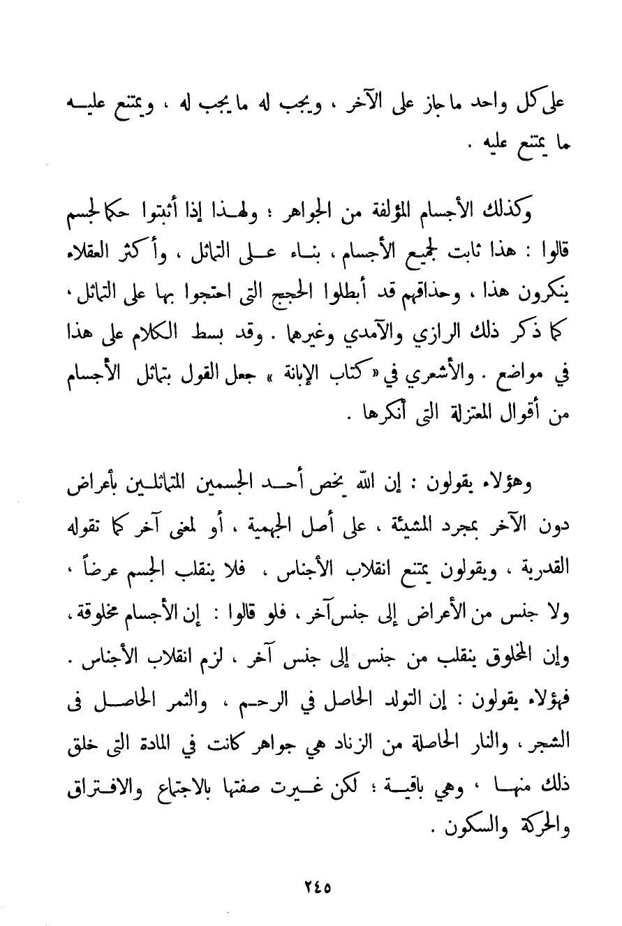 عَلَى كُلٍّ وَاحِدٍ مَا جَازَ عَلَى الْآخَرِ وَيَجِبُ لَهُ مَا يَجِبُ لَهُ وَيَمْتَنِعُ عَلَيْهِ مَا يَمْتَنِعُ عَلَيْهِ. وَكَذَلِكَ الْأَجْسَامُ الْمُؤَلَّفَةُ مِنْ الْجَوَاهِرِ؛ وَلِهَذَا إذَا أَثْبَتُوا حُكْمًا لِجِسْمٍ قَالُوا: هَذَا ثَابِتٌ لِجَمِيعِ الْأَجْسَامِ بِنَاءً عَلَى التَّمَاثُلِ وَأَكْثَرُ الْعُقَلَاءِ يُنْكِرُونَ هَذَا وَحُذَّاقِهِمْ قَدْ أَبْطَلُوا الْحُجَجَ الَّتِي احْتَجُّوا بِهَا عَلَى التَّمَاثُلِ كَمَا ذَكَرَ ذَلِكَ الرَّازِي والآمدي وَغَيْرُهُمَا. وَقَدْ بُسِطَ الْكَلَامُ عَلَى هَذَا فِي مَوَاضِعَ. وَالْأَشْعَرِيُّ فِي " كِتَابِ الْإِبَانَةِ " جَعَلَ الْقَوْلَ بِتَمَاثُلِ الْأَجْسَامِ مِنْ أَقْوَالِ الْمُعْتَزِلَةِ الَّتِي أَنْكَرَهَا. وَهَؤُلَاءِ يَقُولُونَ: إنَّ اللَّهَ يَخُصُّ أَحَدَ الْجِسْمَيْنِ الْمُتَمَاثِلَيْنِ بِأَعْرَاضٍ دُونَ الْآخَرِ بِمُجَرَّدِ الْمَشِيئَةِ عَلَى أَصْلِ الْجَهْمِيَّة أَوْ لِمَعْنَى آخَرَ كَمَا تَقُولُهُ الْقَدَرِيَّةُ وَيَقُولُونَ يَمْتَنِعُ انْقِلَابُ الْأَجْنَاسِ فَلَا يَنْقَلِبُ الْجِسْمُ عَرَضًا وَلَا جِنْسٌ مِنْ الْأَعْرَاضِ إلَى جِنْسٍ آخَرَ فَلَوْ قَالُوا: إنَّ الْأَجْسَامَ مَخْلُوقَةٌ وَأَنَّ الْمَخْلُوقَ يَنْقَلِبُ مِنْ جِنْسٍ إلَى جِنْسٍ آخَرَ لَزِمَ انْقِلَابُ الْأَجْنَاسِ. فَهَؤُلَاءِ يَقُولُونَ: أَنَّ التَّوَلُّدَ الْحَاصِلَ فِي الرَّحِمِ وَالثَّمَرَ الْحَاصِلَ فِي الشَّجَرِ وَالنَّارَ الْحَاصِلَةَ مِنْ الزِّنَادِ هِيَ جَوَاهِرُ كانت فِي الْمَادَّةِ الَّتِي خُلِقَ ذَلِكَ مِنْهَا وَهِيَ بَاقِيَةٌ؛ لَكِنْ غُيِّرَتْ صِفَتُهَا بِالِاجْتِمَاعِ وَالِافْتِرَاقِ وَالْحَرَكَةِ وَالسُّكُونِ.