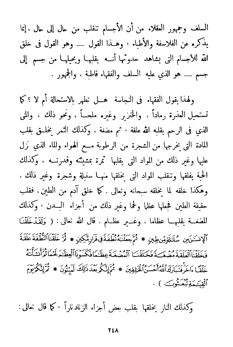 السَّلَفُ وَجُمْهُورُ الْعُقَلَاءِ مِنْ أَنَّ الْأَجْسَامَ تَنْقَلِبُ مِنْ حَالٍ إلَى حَالٍ إنَّمَا يَذْكُرُهُ عَنْ الْفَلَاسِفَةِ وَالْأَطِبَّاءِ؛ وَهَذَا الْقَوْلُ - وَهُوَ الْقَوْلُ فِي خَلْقِ اللَّهِ لِلْأَجْسَامِ الَّتِي يُشَاهِدُ حُدُوثَهَا أَنَّهُ يُقَلِّبُهَا وَيُحِيلُهَا مِنْ جِسْمٍ إلَى جِسْمٍ - هُوَ الَّذِي عَلَيْهِ السَّلَفُ وَالْفُقَهَاءُ قَاطِبَةً وَالْجُمْهُورُ. وَلِهَذَا يَقُولُ الْفُقَهَاءُ فِي النَّجَاسَةِ هَلْ تَطْهُرُ بِالِاسْتِحَالَةِ أَمْ لَا؟ كَمَا تَسْتَحِيلُ الْعَذِرَةُ رَمَادًا وَالْخِنْزِيرُ وَغَيْرُهُ مِلْحًا وَنَحْوَ ذَلِكَ وَالْمَنِيُّ الَّذِي فِي الرَّحِمِ يَقْلِبُهُ اللَّهُ عَلَقَةً ثُمَّ مُضْغَةً وَكَذَلِكَ الثَّمَرُ يُخْلَقُ بِقَلْبِ الْمَادَّةِ الَّتِي يُخْرِجُهَا مِنْ الشَّجَرَةِ مِنْ الرُّطُوبَةِ مَعَ الْهَوَاءِ وَالْمَاءِ الَّذِي نَزَلَ عَلَيْهَا وَغَيْرِ ذَلِكَ مِنْ الْمَوَادِّ الَّتِي يَقْلِبُهَا ثَمَرَةً بِمَشِيئَتِهِ وَقُدْرَتِهِ وَكَذَلِكَ الْحَبَّةُ يَفْلِقُهَا وَتَنْقَلِبُ الْمَوَادُّ الَّتِي يَخْلُقُهَا مِنْهَا سُنْبُلَةً وَشَجَرَةً وَغَيْرَ ذَلِكَ وَهَكَذَا خَلْقُهُ لِمَا يَخْلُقُهُ سُبْحَانَهُ وَتَعَالَى. كَمَا خَلَقَ آدَمَ مِنْ الطِّينِ فَقَلَبَ حَقِيقَةَ الطِّينِ فَجَعَلَهَا عَظْمًا وَلَحْمًا وَغَيْرَ ذَلِكَ مِنْ أَجْزَاءِ الْبَدَنِ وَكَذَلِكَ الْمُضْغَةُ يَقْلِبُهَا عِظَامًا وَغَيْرَ عِظَامٍ. قَالَ اللَّهُ تَعَالَى: {وَلَقَدْ خَلَقْنَا الْإِنْسَانَ مِنْ سُلَالَةٍ مِنْ طِينٍ} {ثُمَّ جَعَلْنَاهُ نُطْفَةً فِي قَرَارٍ مَكِينٍ} {ثُمَّ خَلَقْنَا النُّطْفَةَ عَلَقَةً فَخَلَقْنَا الْعَلَقَةَ مُضْغَةً فَخَلَقْنَا الْمُضْغَةَ عِظَامًا فَكَسَوْنَا الْعِظَامَ لَحْمًا ثُمَّ أَنْشَأْنَاهُ خَلْقًا آخَرَ فَتَبَارَكَ اللَّهُ أَحْسَنُ الْخَالِقِينَ} {ثُمَّ إنَّكُمْ بَعْدَ ذَلِكَ لَمَيِّتُونَ} {ثُمَّ إنَّكُمْ يَوْمَ الْقِيَامَةِ تُبْعَثُونَ} . وَكَذَلِكَ النَّارُ يَخْلُقُهَا بِقَلْبِ بَعْضِ أَجْزَاءِ الزِّنَادِ نَارًا كَمَا قَالَ تَعَالَى: