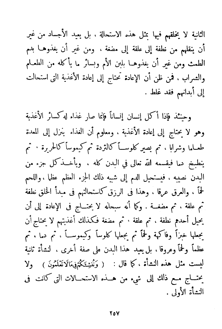 الثَّانِيَةُ لَا يَخْلُقُهُمْ فِيهَا بِمِثْلِ هَذِهِ الِاسْتِحَالَةِ بَلْ يُعِيدُ الْأَجْسَادَ مِنْ غَيْرِ أَنْ يَنْقُلَهُمْ مِنْ نُطْفَةٍ إلَى عَلَقَةٍ إلَى مُضْغَةٍ وَمِنْ غَيْرِ أَنْ يَغْذُوَهَا بِدَمِ الطَّمْثِ وَمِنْ غَيْرِ أَنْ يَغْذُوَهَا بِلَبَنِ الْأُمِّ وَبِسَائِرِ مَا يَأْكُلُهُ مِنْ الطَّعَامِ وَالشَّرَابِ فَمَنْ ظَنَّ أَنَّ الْإِعَادَةَ تَحْتَاجُ إلَى إعَادَةِ الْأَغْذِيَةِ الَّتِي اسْتَحَالَتْ إلَى أَبْدَانِهِمْ فَقَدْ غَلِطَ. وَحِينَئِذٍ فَإِذَا أَكَلَ إنْسَانٌ إنْسَانًا فَإِنَّمَا صَارَ غِذَاءً لَهُ كَسَائِرِ الْأَغْذِيَةِ وَهُوَ لَا يَحْتَاجُ إلَى إعَادَةِ الْأَغْذِيَةِ وَمَعْلُومٌ أَنَّ الْغِذَاءَ يَنْزِلُ إلَى الْمَعِدَةِ طَعَامًا وَشَرَابًا ثُمَّ يَصِيرُ كلوسا كالثردة ثُمَّ كيموسا كَالْحَرِيرَةِ ثُمَّ يَنْطَبِخُ دَمًا فَيَقْسِمُهُ اللَّهُ تَعَالَى فِي الْبَدَنِ كُلِّهِ وَيَأْخُذُ كُلُّ جُزْءٍ مِنْ الْبَدَنِ نَصِيبَهُ فَيَسْتَحِيلُ الدَّمُ إلَى شَبِيهِ ذَلِكَ الْجُزْءِ الْعَظْمِ عَظْمًا وَاللَّحْمُ لَحْمًا وَالْعَرَقُ عَرَقًا وَهَذَا فِي الرِّزْقِ كَاسْتِحَالَتِهِمْ فِي مَبْدَأِ الْخَلْقِ نُطْفَةً ثُمَّ عَلَقَةً ثُمَّ مُضْغَةً. وَكَمَا أَنَّهُ سُبْحَانَهُ لَا يَحْتَاجُ فِي الْإِعَادَةِ إلَى أَنْ يُحِيلَ أَحَدَهُمْ نُطْفَةً ثُمَّ عَلَقَةً ثُمَّ مُضْغَةً فَكَذَلِكَ أَغْذِيَتُهُمْ لَا يَحْتَاجُ أَنْ يَجْعَلَهَا خُبْزًا وَفَاكِهَةً وَلَحْمًا ثُمَّ يَجْعَلُهَا كلوسا وكيموسا ثُمَّ دَمًا ثُمَّ عَظْمًا وَلَحْمًا وَعُرُوقًا بَلْ يُعِيدُ هَذَا الْبَدَنَ عَلَى صِفَةٍ أُخْرَى لِنَشْأَةٍ ثَانِيَةٍ لَيْسَتْ مِثْلَ هَذِهِ النَّشْأَةِ كَمَا قَالَ: {وَنُنْشِئَكُمْ فِي مَا لَا تَعْلَمُونَ} وَلَا يَحْتَاجُ مَعَ ذَلِكَ إلَى شَيْءٍ مِنْ هَذِهِ الِاسْتِحَالَاتِ الَّتِي كَانَتْ فِي النَّشْأَةِ الْأُولَى.