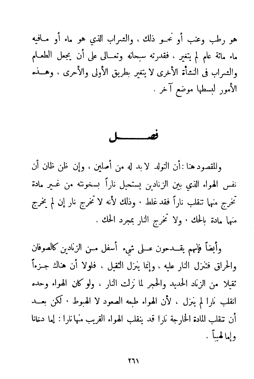 وَالْمَقْصُودُ هُنَا: أَنَّ التَّوَلُّدَ لَا بُدَّ لَهُ مِنْ أَصْلَيْنِ وَإِنْ ظَنَّ ظَانٌّ أَنَّ نَفْسَ الْهَوَاءِ الَّذِي بَيْن الزِّنَادَيْنِ يَسْتَحِيلُ نَارًا بِسُخُونَتِهِ مِنْ غَيْرِ مَادَّةٍ تَخْرُجُ مِنْهُمَا تَنْقَلِبُ نَارًا فَقَدْ غَلِطَ وَذَلِكَ لِأَنَّهُ لَا تَخْرُجُ نَارٌ إنْ لَمْ يَخْرُجْ مِنْهُمَا مَادَّةٌ بِالْحَكِّ وَلَا تَخْرُجْ النَّارُ بِمُجَرَّدِ الْحَكِّ.