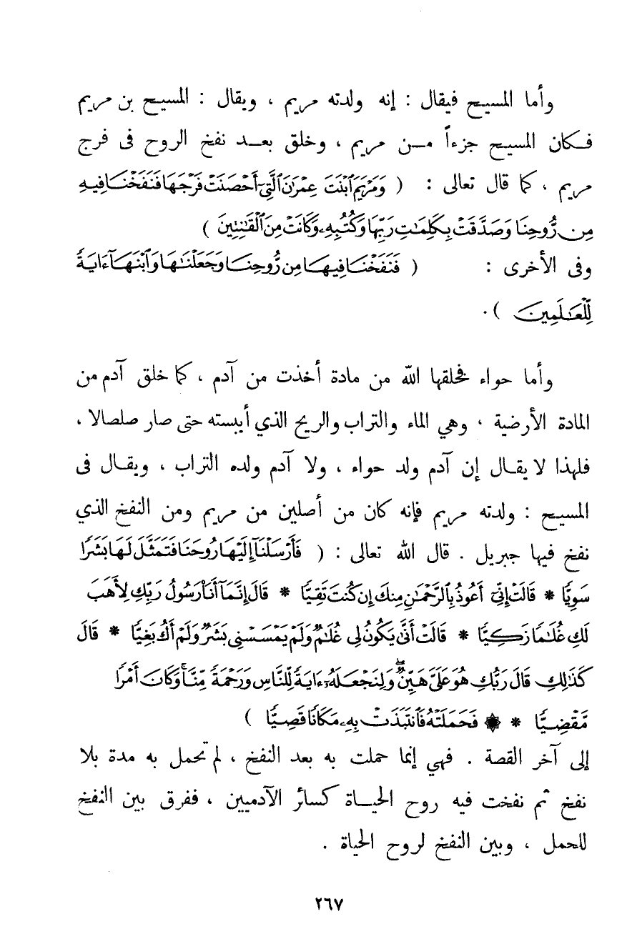 وَأَمَّا الْمَسِيحُ فَيُقَالُ: إنَّهُ وَلَدَتْهُ مَرْيَمُ وَيُقَالُ: الْمَسِيحُ ابْنُ مَرْيَمَ فَكَانَ الْمَسِيحُ جُزْءًا مِنْ مَرْيَمَ وَخُلِقَ بَعْدَ نَفْخِ الرُّوحِ فِي فَرْجِ مَرْيَمَ كَمَا قَالَ تَعَالَى: {وَمَرْيَمَ ابْنَتَ عِمْرَانَ الَّتِي أَحْصَنَتْ فَرْجَهَا فَنَفَخْنَا فِيهِ مِنْ رُوحِنَا وَصَدَّقَتْ بِكَلِمَاتِ رَبِّهَا وَكُتُبِهِ وَكَانَتْ مِنَ الْقَانِتِينَ} وَفِي الْأُخْرَى: {فَنَفَخْنَا فِيهَا مِنْ رُوحِنَا وَجَعَلْنَاهَا وَابْنَهَا آيَةً لِلْعَالَمِينَ} وَأَمَّا حَوَّاءُ فَخَلَقَهَا اللَّهُ مِنْ مَادَّةٍ أُخِذَتْ مِنْ آدَمَ كَمَا خُلِقَ آدَمَ مِنْ الْمَادَّةِ الْأَرْضِيَّةِ وَهِيَ الْمَاءُ وَالتُّرَابُ وَالرِّيحُ الَّذِي أَيْبَسَتْهُ حَتَّى صَارَ صَلْصَالًا فَلِهَذَا لَا يُقَالُ إنَّ آدَمَ وَلَدَ حَوَّاءَ وَلَا آدَمَ وَلَدَهُ التُّرَابُ وَيُقَالُ فِي الْمَسِيحِ: وَلَدَتْهُ مَرْيَمُ فَإِنَّهُ كَانَ مِنْ أَصْلَيْنِ مِنْ مَرْيَمَ وَمِنْ النَّفْخِ الَّذِي نَفَخَ فِيهَا جِبْرِيلُ. قَالَ اللَّهُ تَعَالَى {فَأَرْسَلْنَا إلَيْهَا رُوحَنَا فَتَمَثَّلَ لَهَا بَشَرًا سَوِيًّا} {قَالَتْ إنِّي أَعُوذُ بِالرَّحْمَنِ مِنْكَ إنْ كُنْتَ تَقِيًّا} {قَالَ إنَّمَا أَنَا رَسُولُ رَبِّكِ لِأَهَبَ لَكِ غُلَامًا زَكِيًّا} {قَالَتْ أَنَّى يَكُونُ لِي غُلَامٌ وَلَمْ يَمْسَسْنِي بَشَرٌ وَلَمْ أَكُ بَغِيًّا} {قَالَ كَذَلِكِ قَالَ رَبُّكِ هُوَ عَلَيَّ هَيِّنٌ وَلِنَجْعَلَهُ آيَةً لِلنَّاسِ وَرَحْمَةً مِنَّا وَكَانَ أَمْرًا مَقْضِيًّا} {فَحَمَلَتْهُ فَانْتَبَذَتْ بِهِ مَكَانًا قَصِيًّا} إلَى آخِرِ الْقِصَّةِ. فَهِيَ إنَّمَا حَمَلَتْ بِهِ بَعْدَ النَّفْخِ لَمْ تَحْمِلْ بِهِ مُدَّةً بِلَا نَفْخٍ ثُمَّ نُفِخَتْ فِيهِ رُوحُ الْحَيَاةِ كَسَائِرِ الْآدَمِيِّينَ فَفَرْقٌ بَيْنَ النَّفْخِ لِلْحَمْلِ وَبَيْنَ النَّفْخِ لِرُوحِ الْحَيَاةِ.