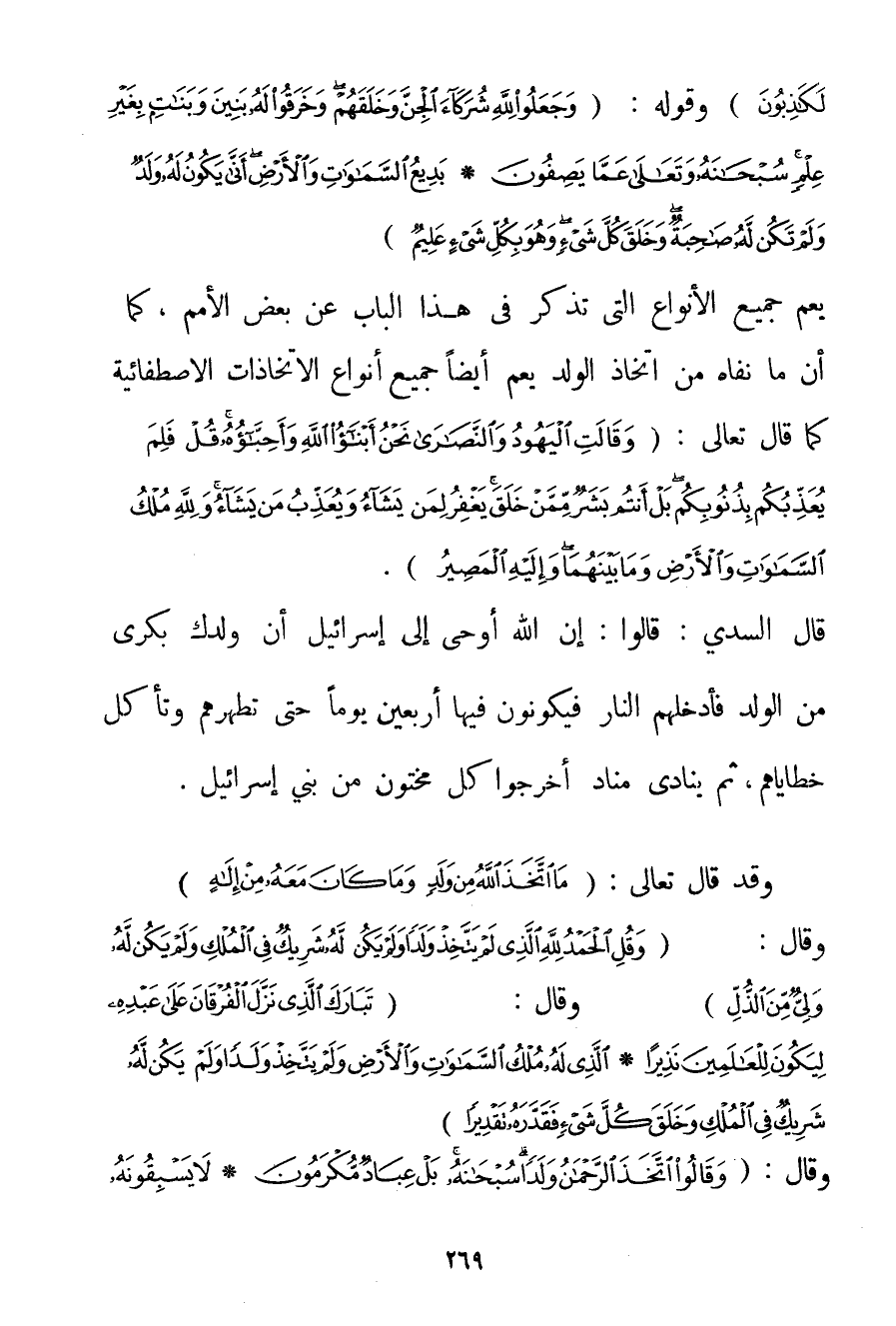 لَكَاذِبُونَ} وَقَوْلِهِ: {وَجَعَلُوا لِلَّهِ شُرَكَاءَ الْجِنَّ وَخَلَقَهُمْ وَخَرَقُوا لَهُ بَنِينَ وَبَنَاتٍ بِغَيْرِ عِلْمٍ سُبْحَانَهُ وَتَعَالَى عَمَّا يَصِفُونَ} {بَدِيعُ السَّمَاوَاتِ وَالْأَرْضِ أَنَّى يَكُونُ لَهُ وَلَدٌ وَلَمْ تَكُنْ لَهُ صَاحِبَةٌ وَخَلَقَ كُلَّ شَيْءٍ وَهُوَ بِكُلِّ شَيْءٍ عَلِيمٌ} يَعُمُّ جَمِيعَ الْأَنْوَاعِ الَّتِي تُذْكَرُ فِي هَذَا الْبَابِ عَنْ بَعْضِ الْأُمَمِ كَمَا أَنَّ مَا نَفَاهُ مِنْ اتِّخَاذِ الْوَلَدِ يَعُمُّ أَيْضًا جَمِيعَ أَنْوَاعِ الِاتِّخَاذَاتِ الاصطفائية كَمَا قَالَ تَعَالَى: {وَقَالَتِ الْيَهُودُ وَالنَّصَارَى نَحْنُ أَبْنَاءُ اللَّهِ وَأَحِبَّاؤُهُ قُلْ فَلِمَ يُعَذِّبُكُمْ بِذُنُوبِكُمْ بَلْ أَنْتُمْ بَشَرٌ مِمَّنْ خَلَقَ يَغْفِرُ لِمَنْ يَشَاءُ وَيُعَذِّبُ مَنْ يَشَاءُ وَلِلَّهِ مُلْكُ السَّمَاوَاتِ وَالْأَرْضِ وَمَا بَيْنَهُمَا وَإِلَيْهِ الْمَصِيرُ} . قَالَ السدي: قَالُوا: إنَّ اللَّهَ أَوْحَى إلَى إسْرَائِيلَ أَنَّ وَلَدَك بِكْرِيٍّ مِنْ الْوَلَدِ فَأُدْخِلُهُمْ النَّارَ فَيَكُونُونَ فِيهَا أَرْبَعِينَ يَوْمًا حَتَّى تُطَهِّرَهُمْ وَتَأْكُلَ خَطَايَاهُمْ ثُمَّ يُنَادِي مُنَادٍ أَخْرِجُوا كُلَّ مَخْتُونٍ مِنْ بَنِي إسْرَائِيلَ. وَقَدْ قَالَ تَعَالَى: {مَا اتَّخَذَ اللَّهُ مِنْ وَلَدٍ وَمَا كَانَ مَعَهُ مِنْ إلَهٍ} وَقَالَ: {وَقُلِ الْحَمْدُ لِلَّهِ الَّذِي لَمْ يَتَّخِذْ وَلَدًا وَلَمْ يَكُنْ لَهُ شَرِيكٌ فِي الْمُلْكِ وَلَمْ يَكُنْ لَهُ وَلِيٌّ مِنَ الذُّلِّ} وَقَالَ: {تَبَارَكَ الَّذِي نَزَّلَ الْفُرْقَانَ عَلَى عَبْدِهِ لِيَكُونَ لِلْعَالَمِينَ نَذِيرًا} {الَّذِي لَهُ مُلْكُ السَّمَاوَاتِ وَالْأَرْضِ وَلَمْ يَتَّخِذْ وَلَدًا وَلَمْ يَكُنْ لَهُ شَرِيكٌ فِي الْمُلْكِ وَخَلَقَ كُلَّ شَيْءٍ فَقَدَّرَهُ تَقْدِيرًا} وَقَالَ: {وَقَالُوا اتَّخَذَ الرَّحْمَنُ وَلَدًا سُبْحَانَهُ بَلْ عِبَادٌ مُكْرَمُونَ}