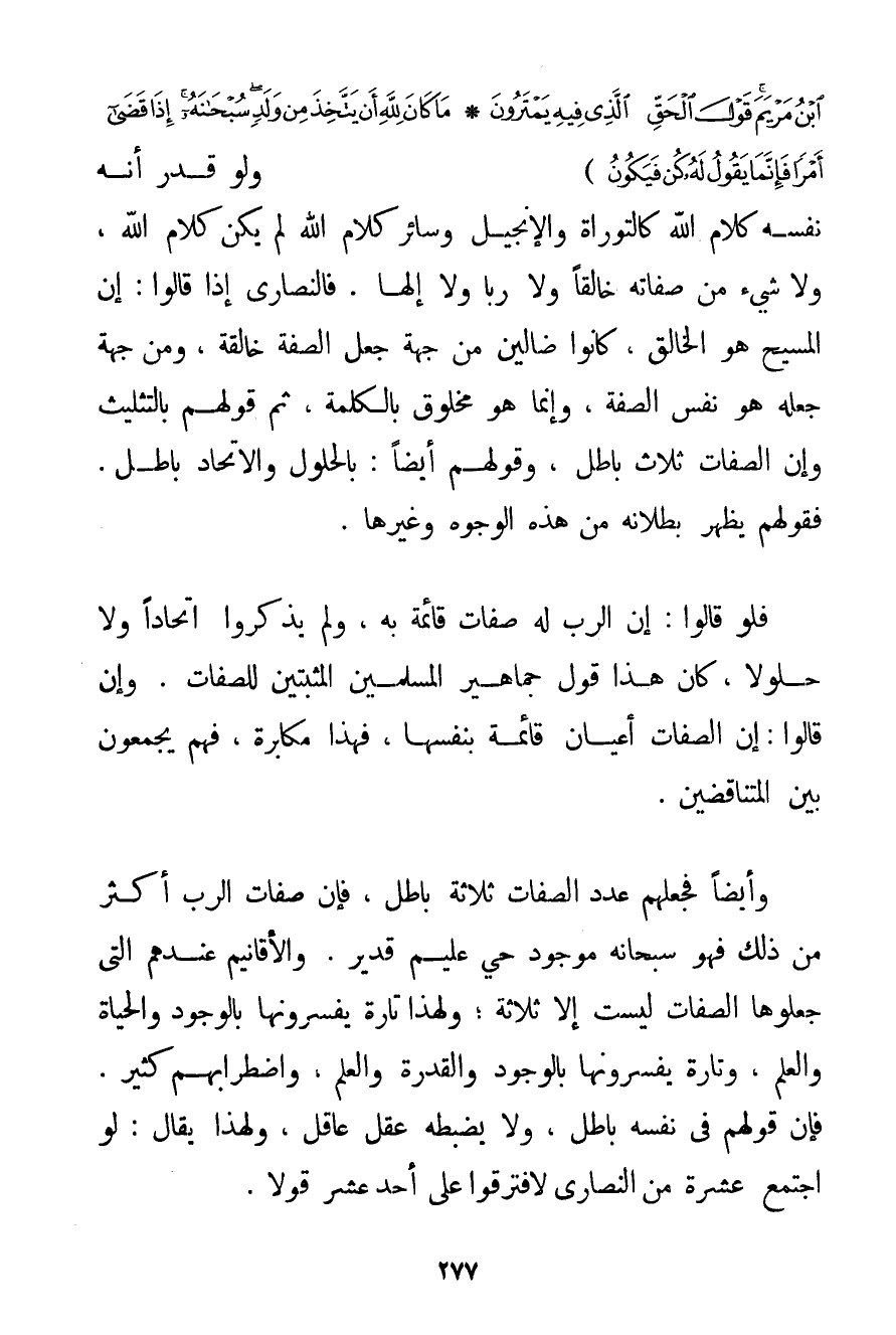ابْنُ مَرْيَمَ قَوْلَ الْحَقِّ الَّذِي فِيهِ يَمْتَرُونَ} {مَا كَانَ لِلَّهِ أَنْ يَتَّخِذَ مِنْ وَلَدٍ سُبْحَانَهُ إذَا قَضَى أَمْرًا فَإِنَّمَا يَقُولُ لَهُ كُنْ فَيَكُونُ} وَلَوْ قُدِّرَ أَنَّهُ نَفْسَهُ كَلَامُ اللَّهِ كَالتَّوْرَاةِ وَالْإِنْجِيلِ وَسَائِرِ كَلَامِ اللَّهِ لَمْ يَكُنْ كَلَامُ اللَّهِ وَلَا شَيْءٌ مِنْ صِفَاتِهِ خَالِقًا وَلَا رَبًّا وَلَا إلَهًا. فَالنَّصَارَى إذَا قَالُوا: إنَّ الْمَسِيحَ هُوَ الْخَالِقُ كَانُوا ضَالِّينَ مِنْ جِهَةِ جَعْلِ الصِّفَةِ خَالِقَةً وَمِنْ جِهَةِ جَعْلِهِ هُوَ نَفْسَ الصِّفَةِ وَإِنَّمَا هُوَ مَخْلُوقٌ بِالْكَلِمَةِ ثُمَّ قَوْلُهُمْ بِالتَّثْلِيثِ وَأَنَّ الصِّفَاتِ ثَلَاثٌ بَاطِلٌ وَقَوْلُهُمْ أَيْضًا: بِالْحُلُولِ وَالِاتِّحَادِ بَاطِلٌ. فَقَوْلُهُمْ يَظْهَرُ بُطْلَانُهُ مِنْ هَذِهِ الْوُجُوهِ وَغَيْرِهَا. فَلَوْ قَالُوا: إنَّ الرَّبَّ لَهُ صِفَاتٌ قَائِمَةٌ بِهِ وَلَمْ يَذْكُرُوا اتِّحَادًا وَلَا حُلُولًا كَانَ هَذَا قَوْلَ جَمَاهِيرِ الْمُسْلِمِينَ الْمُثْبِتِينَ لِلصِّفَاتِ. وَإِنْ قَالُوا: إنَّ الصِّفَاتِ أَعْيَانٌ قَائِمَةٌ بِنَفْسِهَا فَهَذَا مُكَابَرَةٌ فَهُمْ يَجْمَعُونَ بَيْنَ الْمُتَنَاقِضَيْنِ. وَأَيْضًا فَجَعْلُهُمْ عَدَدَ الصِّفَاتِ ثَلَاثَةً بَاطِلٌ فَإِنَّ صِفَاتِ الرَّبِّ أَكْثَرُ مِنْ ذَلِكَ فَهُوَ سُبْحَانَهُ مَوْجُودٌ حَيٌّ عَلِيمٌ قَدِيرٌ. وَالْأَقَانِيمُ عِنْدَهُمْ الَّتِي جَعَلُوهَا الصِّفَاتِ لَيْسَتْ إلَّا ثَلَاثَةً؛ وَلِهَذَا تَارَةً يُفَسِّرُونَهَا بِالْوُجُودِ وَالْحَيَاةِ وَالْعِلْمِ وَتَارَةً يُفَسِّرُونَهَا بِالْوُجُودِ وَالْقُدْرَةِ وَالْعِلْمِ وَاضْطِرَابهمْ كَثِيرٌ. فَإِنَّ قَوْلَهُمْ فِي نَفْسِهِ بَاطِلٌ وَلَا يَضْبُطُهُ عَقْلُ عَاقِلٍ وَلِهَذَا يُقَالُ: لَوْ اجْتَمَعَ عَشَرَةٌ مِنْ النَّصَارَى لَافْتَرَقُوا عَلَى أَحَدَ عَشَرَ قَوْلًا