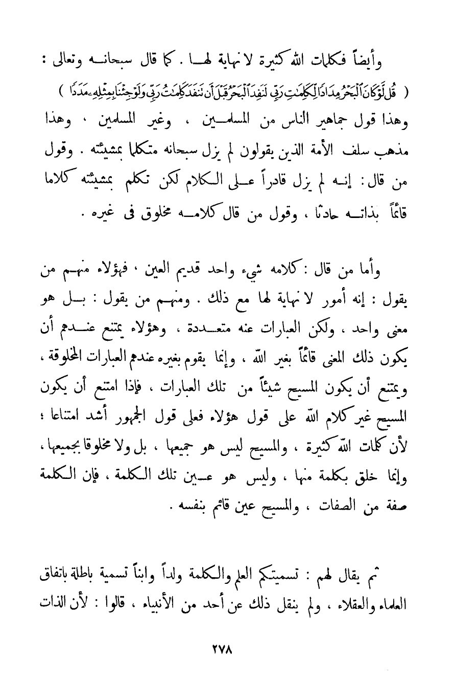 وَأَيْضًا فَكَلِمَاتُ اللَّهِ كَثِيرَةٌ لَا نِهَايَةَ لَهَا. كَمَا قَالَ سُبْحَانَهُ وَتَعَالَى: {قُلْ لَوْ كَانَ الْبَحْرُ مِدَادًا لِكَلِمَاتِ رَبِّي لَنَفِدَ الْبَحْرُ قَبْلَ أَنْ تَنْفَدَ كَلِمَاتُ رَبِّي وَلَوْ جِئْنَا بِمِثْلِهِ مَدَدًا} وَهَذَا قَوْلُ جَمَاهِيرِ النَّاسِ مِنْ الْمُسْلِمِينَ وَغَيْرِ الْمُسْلِمِينَ وَهَذَا مَذْهَبُ سَلَفِ الْأُمَّةِ الَّذِينَ يَقُولُونَ لَمْ يَزَلْ سُبْحَانَهُ مُتَكَلِّمًا بِمَشِيئَتِهِ. وَقَوْلُ مَنْ قَالَ: إنَّهُ لَمْ يَزَلْ قَادِرًا عَلَى الْكَلَامِ لَكِنْ تَكَلَّمَ بِمَشِيئَتِهِ كَلَامًا قَائِمًا بِذَاتِهِ حَادِثًا وَقَوْلُ مَنْ قَالَ كَلَامُهُ مَخْلُوقٌ فِي غَيْرِهِ. وَأَمَّا مَنْ قَالَ: كَلَامُهُ شَيْءٌ وَاحِدٌ قَدِيمُ الْعَيْنِ فَهَؤُلَاءِ مِنْهُمْ مَنْ يَقُولُ: إنَّهُ أُمُورٌ لَا نِهَايَةَ لَهَا مَعَ ذَلِكَ. وَمِنْهُمْ مَنْ يَقُولُ: بَلْ هُوَ مَعْنًى وَاحِدٌ وَلَكِنَّ الْعِبَارَاتِ عَنْهُ مُتَعَدِّدَةٌ وَهَؤُلَاءِ يَمْتَنِعُ عِنْدَهُمْ أَنْ يَكُونَ ذَلِكَ الْمَعْنَى قَائِمًا بِغَيْرِ اللَّهِ وَإِنَّمَا يَقُومُ بِغَيْرِهِ عِنْدَهُمْ الْعِبَارَاتُ الْمَخْلُوقَةُ وَيَمْتَنِعُ أَنْ يَكُونَ الْمَسِيحُ شَيْئًا مِنْ تِلْكَ الْعِبَارَاتِ فَإِذَا امْتَنَعَ أَنْ يَكُونَ الْمَسِيحُ غَيْرَ كَلَامِ اللَّهِ عَلَى قَوْلِ هَؤُلَاءِ فَعَلَى قَوْلِ الْجُمْهُورِ أَشَدُّ امْتِنَاعًا؛ لِأَنَّ كَلِمَاتِ اللَّهِ كَثِيرَةٌ وَالْمَسِيحُ لَيْسَ هُوَ جَمِيعَهَا بَلْ وَلَا مَخْلُوقًا بِجَمِيعِهَا وَإِنَّمَا خُلِقَ بِكَلِمَةٍ مِنْهَا وَلَيْسَ هُوَ عَيْنُ تِلْكَ الْكَلِمَةِ فَإِنَّ الْكَلِمَةَ صِفَةٌ مِنْ الصِّفَاتِ وَالْمَسِيحُ عَيْنٌ قَائِمٌ بِنَفْسِهِ. ثُمَّ يُقَالُ لَهُمْ: تَسْمِيَتُكُمْ الْعِلْمَ وَالْكَلِمَةَ وَلَدًا وَابْنًا تَسْمِيَةٌ بَاطِلَةٌ بِاتِّفَاقِ الْعُلَمَاءِ وَالْعُقَلَاءِ وَلَمْ يُنْقَلْ ذَلِكَ عَنْ أَحَدٍ مِنْ الْأَنْبِيَاءِ قَالُوا: لِأَنَّ الذَّاتَ