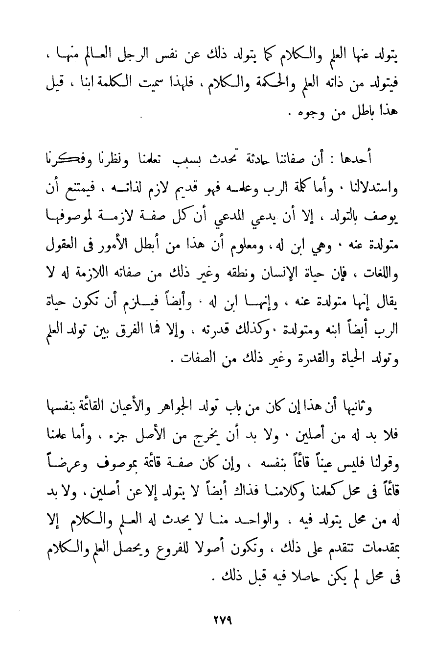 يَتَوَلَّدُ عَنْهَا الْعِلْمُ وَالْكَلَامُ كَمَا يَتَوَلَّدُ ذَلِكَ عَنْ نَفْسِ الرَّجُلِ الْعَالِمِ مِنْهَا فَيَتَوَلَّدُ مِنْ ذَاتِهِ الْعِلْمُ وَالْحِكْمَةُ وَالْكَلَامُ فَلِهَذَا سُمِّيَتْ الْكَلِمَةُ ابْنًا قِيلَ هَذَا بَاطِلٌ مِنْ وُجُوهٍ. أَحَدُهَا: أَنَّ صِفَاتِنَا حَادِثَةٌ تَحْدُثُ بِسَبَبِ تَعَلُّمِنَا وَنَظَرِنَا وَفِكْرِنَا وَاسْتِدْلَالِنَا وَأَمَّا كَلِمَةُ الرَّبِّ وَعِلْمُهُ فَهُوَ قَدِيمٌ لَازِمٌ لِذَاتِهِ فَيَمْتَنِعُ أَنْ يُوصَفَ بِالتَّوَلُّدِ إلَّا أَنْ يَدَّعِيَ الْمُدَّعِي أَنَّ كُلَّ صِفَةٍ لَازِمَةٌ لِمَوْصُوفِهَا مُتَوَلِّدَةٌ عَنْهُ وَهِيَ ابْنُ لَهُ وَمَعْلُومٌ أَنَّ هَذَا مِنْ أَبْطَلْ الْأُمُورَ فِي الْعُقُولِ وَاللُّغَاتِ فَإِنَّ حَيَاةَ الْإِنْسَانِ وَنُطْقَهُ وَغَيْرَ ذَلِكَ مِنْ صِفَاتِهِ اللَّازِمَةِ لَهُ لَا يُقَالُ إنَّهَا مُتَوَلِّدَةٌ عَنْهُ وَإِنَّهَا ابْنٌ لَهُ وَأَيْضًا فَيَلْزَمُ أَنْ يَكُونَ حَيَاةُ الرَّبِّ أَيْضًا ابْنَهُ وَمُتَوَلِّدَةَ وَكَذَلِكَ قُدْرَتُهُ وَإِلَّا فَمَا الْفَرْقُ بَيْنَ تَوَلُّدِ الْعِلْمِ وَتَوَلُّدِ الْحَيَاةِ وَالْقُدْرَةِ وَغَيْرِ ذَلِكَ مِنْ الصِّفَاتِ. وَثَانِيهَا أَنَّ هَذَا إنْ كَانَ مِنْ بَابِ تَوَلُّدِ الْجَوَاهِرِ وَالْأَعْيَانِ الْقَائِمَةِ بِنَفْسِهَا فَلَا بُدَّ لَهُ مِنْ أَصْلَيْنِ وَلَا بُدَّ أَنْ يَخْرُجَ مِنْ الْأَصْلِ جُزْءٌ وَأَمَّا عِلْمُنَا وَقَوْلُنَا فَلَيْسَ عَيْنًا قَائِمًا بِنَفْسِهِ وَإِنْ كَانَ صِفَةً قَائِمَةً بِمَوْصُوفِ وَعَرَضًا قَائِمًا فِي مَحَلٍّ كَعِلْمِنَا وَكَلَامِنَا فَذَاكَ أَيْضًا لَا يَتَوَلَّدُ إلَّا عَنْ أَصْلَيْنِ وَلَا بُدَّ لَهُ مِنْ مَحَلٍّ يَتَوَلَّدُ فِيهِ. وَالْوَاحِدُ مِنَّا لَا يَحْدُثُ لَهُ الْعِلْمُ وَالْكَلَامُ إلَّا بِمُقَدِّمَاتٍ تَتَقَدَّمُ عَلَى ذَلِكَ وَتَكُونُ أُصُولًا لِلْفُرُوعِ وَيَحْصُلُ الْعِلْمُ وَالْكَلَامُ فِي مَحَلٍّ لَمْ يَكُنْ حَاصِلًا فِيهِ قَبْلَ ذَلِكَ.