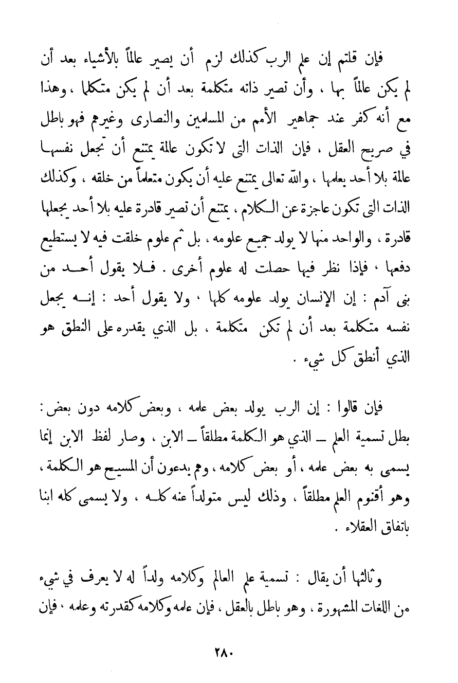 فَإِنْ قُلْتُمْ إنَّ عِلْمَ الرَّبِّ كَذَلِكَ لَزِمَ أَنْ يَصِيرَ عَالِمًا بِالْأَشْيَاءِ بَعْدَ أَنْ لَمْ يَكُنْ عَالِمًا بِهَا وَأَنْ تَصِيرَ ذَاتُهُ مُتَكَلِّمَةً بَعْدَ أَنْ لَمْ يَكُنْ مُتَكَلِّمًا وَهَذَا مَعَ أَنَّهُ كُفْرٌ عِنْدَ جَمَاهِيرِ الْأُمَمِ مِنْ الْمُسْلِمِينَ وَالنَّصَارَى وَغَيْرِهِمْ فَهُوَ بَاطِلٌ فِي صَرِيحِ الْعَقْلِ فَإِنَّ الذَّاتَ الَّتِي لَا تَكُونُ عَالِمَةً يَمْتَنِعُ أَنْ تَجْعَلَ نَفْسَهَا عَالِمَةً بِلَا أَحَدٍ يُعَلِّمُهَا وَاَللَّهُ تَعَالَى يَمْتَنِعُ عَلَيْهِ أَنْ يَكُونَ مُتَعَلِّمًا مِنْ خَلْقِهِ وَكَذَلِكَ الذَّاتُ الَّتِي تَكُونُ عَاجِزَةً عَنْ الْكَلَامِ يَمْتَنِعُ أَنْ تَصِيرَ قَادِرَةً عَلَيْهِ بِلَا أَحَدٍ يَجْعَلُهَا قَادِرَةً وَالْوَاحِدُ مِنْهَا لَا يُوَلِّدُ جَمِيعَ عُلُومِهِ بَلْ ثَمَّ عُلُومٌ خُلِقَتْ فِيهِ لَا يَسْتَطِيعُ دَفْعَهَا فَإِذَا نَظَرَ فِيهَا حَصَلَتْ لَهُ عُلُومٌ أُخْرَى. فَلَا يَقُولُ أَحَدٌ مِنْ بَنِي آدَمَ: إنَّ الْإِنْسَانَ يُوَلِّدُ عُلُومَهُ كُلَّهَا وَلَا يَقُولُ أَحَدٌ: إنَّهُ يَجْعَلُ نَفْسَهُ مُتَكَلِّمَةً بَعْد أَنْ لَمْ تَكُنْ مُتَكَلِّمَةً بَلْ الَّذِي يُقَدِّرُهُ عَلَى النُّطْقِ هُوَ الَّذِي أَنْطَقَ كُلَّ شَيْءٍ. فَإِنْ قَالُوا: إنَّ الرَّبَّ يُوَلِّدُ بَعْضَ عِلْمِهِ وَبَعْضَ كَلَامِهِ دُونَ بَعْضٍ: بَطَلَ تَسْمِيَةُ الْعِلْمِ - الَّذِي هُوَ الْكَلِمَةُ مُطْلَقًا - الِابْنَ وَصَارَ لَفْظُ الِابْنِ إنَّمَا يُسَمَّى بِهِ بَعْضُ عِلْمِهِ أَوْ بَعْضُ كَلَامِهِ وَهُمْ يَدَّعُونَ أَنَّ الْمَسِيحَ هُوَ الْكَلِمَةُ وَهُوَ أُقْنُومُ الْعِلْمِ مُطْلَقًا وَذَلِكَ لَيْسَ مُتَوَلِّدًا عَنْهُ كُلِّهِ وَلَا يُسَمَّى كُلَّهُ ابْنًا بِاتِّفَاقِ الْعُقَلَاءِ. وَثَالِثُهَا أَنْ يُقَالَ: تَسْمِيَةُ عِلْمِ الْعَالِمِ وَكَلَامِهِ وَلَدًا لَهُ لَا يُعْرَفُ فِي شَيْءٍ مِنْ اللُّغَاتِ الْمَشْهُورَةِ وَهُوَ بَاطِلٌ بِالْعَقْلِ فَإِنَّ عِلْمَهُ وَكَلَامَهُ كَقُدْرَتِهِ وَعِلْمِهِ فَإِنْ