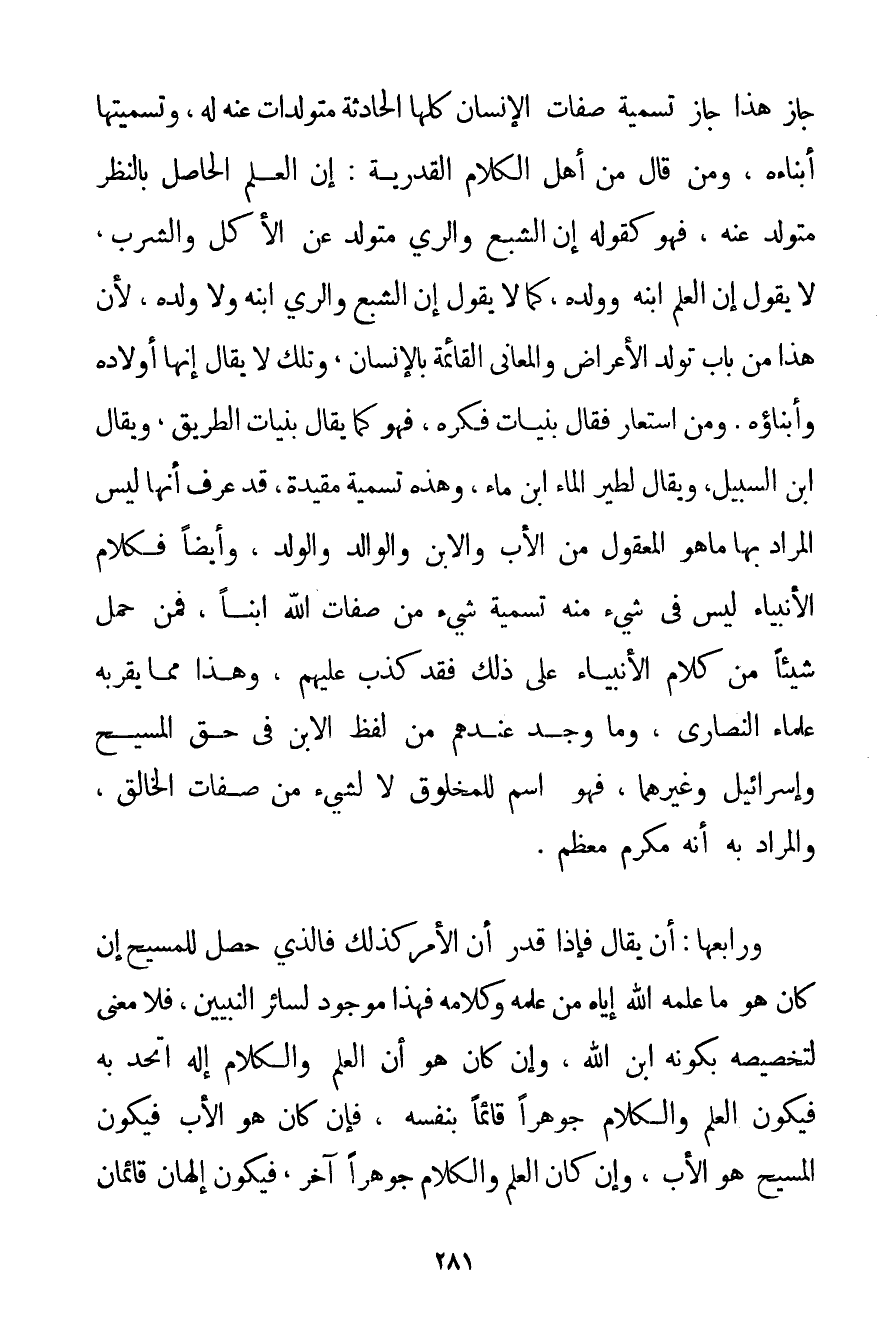 جَازَ هَذَا جَازَ تَسْمِيَةُ صِفَاتِ الْإِنْسَانِ كُلِّهَا الْحَادِثَةِ مُتَوَلِّدَاتٍ عَنْهُ لَهُ وَتَسْمِيَتُهَا أَبْنَاءَهُ وَمَنْ قَالَ مِنْ أَهْلِ الْكَلَامِ الْقَدَرِيَّةِ. إنَّ الْعِلْمَ الْحَاصِلَ بِالنَّظَرِ مُتَوَلِّدٌ عَنْهُ فَهُوَ كَقَوْلِهِ إنَّ الشِّبَعَ وَالرِّيَّ مُتَوَلِّدٌ عَنْ الْأَكْلِ وَالشُّرْبِ لَا يَقُولُ إنَّ الْعِلْمَ ابْنُهُ وَوَلَدُهُ كَمَا لَا يَقُولُ إنَّ الشِّبَعَ وَالرِّيَّ ابْنُهُ وَلَا وَلَدَهُ لِأَنَّ هَذَا مِنْ بَابِ تَوَلُّدِ الْأَعْرَاضِ وَالْمَعَانِي الْقَائِمَةِ بِالْإِنْسَانِ وَتِلْكَ لَا يُقَالُ إنَّهَا أَوْلَادُهُ وَأَبْنَاؤُهُ. وَمَنْ اسْتَعَارَ فَقَالَ بُنَيَّاتُ فِكْرِهِ فَهُوَ كَمَا يُقَالُ بُنَيَّاتُ الطَّرِيقِ وَيُقَالُ ابْنُ السَّبِيلِ وَيُقَالُ لِطَيْرِ الْمَاءِ ابْنُ مَاءٍ وَهَذِهِ تَسْمِيَةٌ مُقَيَّدَةٌ قَدْ عُرِفَ أَنَّهَا لَيْسَ الْمُرَادُ بِهَا مَا هُوَ الْمَعْقُولُ مِنْ الْأَبِ وَالِابْنِ وَالْوَالِدِ وَالْوَلَدِ وَأَيْضًا فَكَلَامُ الْأَنْبِيَاءِ لَيْسَ فِي شَيْءٍ مِنْهُ تَسْمِيَةُ شَيْءٍ مِنْ صِفَاتِ اللَّهِ ابْنًا فَمَنْ حَمَلَ شَيْئًا مِنْ كَلَامِ الْأَنْبِيَاءِ عَلَى ذَلِكَ فَقَدْ كَذَبَ عَلَيْهِمْ وَهَذَا مِمَّا يُقِرُّ بِهِ عُلَمَاءُ النَّصَارَى وَمَا وُجِدَ عِنْدَهُمْ مِنْ لَفْظِ الِابْنِ فِي حَقِّ الْمَسِيحِ وَإِسْرَائِيلَ وَغَيْرِهِمَا فَهُوَ اسْمٌ لِلْمَخْلُوقِ لَا لِشَيْءٍ مِنْ صِفَاتِ الْخَالِقِ وَالْمُرَادُ بِهِ أَنَّهُ مُكَرَّمٌ مُعْظَمٌ. وَرَابِعُهَا: أَنْ يُقَالَ فَإِذَا قُدِّرَ أَنَّ الْأَمْرَ كَذَلِكَ فَاَلَّذِي حَصَلَ لِلْمَسِيحِ إنْ كَانَ هُوَ مَا عَلَّمَهُ اللَّهُ إيَّاهُ مِنْ عِلْمِهِ وَكَلَامِهِ فَهَذَا مَوْجُودٌ لِسَائِرِ النَّبِيِّينَ فَلَا مَعْنَى لِتَخْصِيصِهِ بِكَوْنِهِ ابْنَ اللَّهِ وَإِنْ كَانَ هُوَ أَنَّ الْعِلْمَ وَالْكَلَامَ إلَهٌ اتَّحَدَ بِهِ فَيَكُونُ الْعِلْمُ وَالْكَلَامُ جَوْهَرًا قَائِمًا بِنَفْسِهِ فَإِنْ كَانَ هُوَ الْأَبَ فَيَكُونُ الْمَسِيحُ هُوَ الْأَبَ وَإِنْ كَانَ الْعِلْمُ وَالْكَلَامُ جَوْهَرًا آخَرَ فَيَكُونُ إلَهَانِ قَائِمَانِ