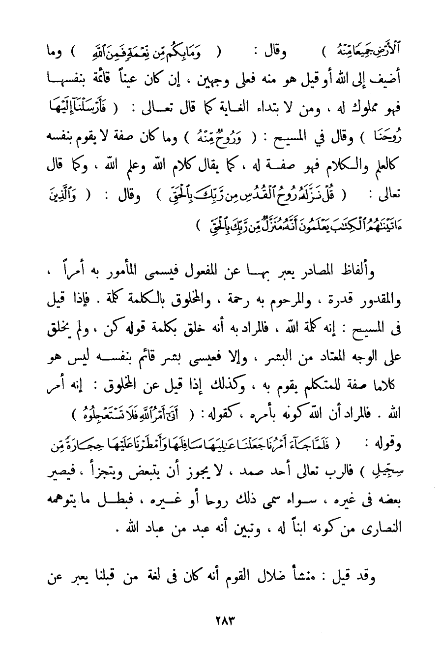 وَمَا فِي الْأَرْضِ جَمِيعًا مِنْهُ} وَقَالَ: {وَمَا بِكُمْ مِنْ نِعْمَةٍ فَمِنَ اللَّهِ} وَمَا أُضِيفَ إلَى اللَّهِ أَوْ قِيلَ هُوَ مِنْهُ فَعَلَى وَجْهَيْنِ إنْ كَانَ عَيْنًا قَائِمَةً بِنَفْسِهَا فَهُوَ مَمْلُوكٌ لَهُ وَمِنْ لِابْتِدَاءِ الْغَايَةِ كَمَا قَالَ تَعَالَى: {فَأَرْسَلْنَا إلَيْهَا رُوحَنَا} وَقَالَ فِي الْمَسِيحِ: {وَرُوحٌ مِنْهُ} وَمَا كَانَ صِفَةً لَا يَقُومُ بِنَفْسِهِ كَالْعِلْمِ وَالْكَلَامِ فَهُوَ صِفَةٌ لَهُ كَمَا يُقَالُ كَلَامُ اللَّهِ وَعِلْمُ اللَّهِ وَكَمَا قَالَ تَعَالَى: {قُلْ نَزَّلَهُ رُوحُ الْقُدُسِ مِنْ رَبِّكَ بِالْحَقِّ} وَقَالَ: {وَالَّذِينَ آتَيْنَاهُمُ الْكِتَابَ يَعْلَمُونَ أَنَّهُ مُنَزَّلٌ مِنْ رَبِّكَ بِالْحَقِّ} وَأَلْفَاظُ الْمَصَادِرِ يُعَبَّرُ بِهَا عَنْ الْمَفْعُولِ فَيُسَمَّى الْمَأْمُورُ بِهِ أَمْرًا وَالْمَقْدُورُ قُدْرَةً وَالْمَرْحُومُ بِهِ رَحْمَةً وَالْمَخْلُوقُ بِالْكَلِمَةِ كَلِمَةً فَإِذَا قِيلَ فِي الْمَسِيحِ: إنَّهُ كَلِمَةُ اللَّهِ فَالْمُرَادُ بِهِ أَنَّهُ خُلِقَ بِكَلِمَةِ قَوْلِهِ كُنْ وَلَمْ يُخْلَقْ عَلَى الْوَجْهِ الْمُعْتَادِ مِنْ الْبَشَرِ وَإِلَّا فَعِيسَى بَشَرٌ قَائِمٌ بِنَفْسِهِ لَيْسَ هُوَ كَلَامًا صِفَةً لِلْمُتَكَلِّمِ يَقُومُ بِهِ وَكَذَلِكَ إذَا قِيلَ عَنْ الْمَخْلُوقِ: إنَّهُ أَمْرُ اللَّهِ. فَالْمُرَادُ أَنَّ اللَّهَ كَوْنُهُ بِأَمْرِهِ كَقَوْلِهِ: {أَتَى أَمْرُ اللَّهِ فَلَا تَسْتَعْجِلُوهُ} وَقَوْلِهِ: {فَلَمَّا جَاءَ أَمْرُنَا جَعَلْنَا عَالِيَهَا سَافِلَهَا وَأَمْطَرْنَا عَلَيْهَا حِجَارَةً مِنْ سِجِّيلٍ} فَالرَّبُّ تَعَالَى أَحَدٌ صَمَدٌ لَا يَجُوزُ أَنْ يَتَبَعَّضَ وَيَتَجَزَّأَ فَيَصِيرُ بَعْضُهُ فِي غَيْرِهِ سَوَاءٌ سُمِّيَ ذَلِكَ رُوحًا أَوْ غَيْرُهُ فَبَطَلَ مَا يَتَوَهَّمُهُ النَّصَارَى مِنْ كَوْنِهِ ابْنًا لَهُ وَتَبَيَّنَ أَنَّهُ عَبْدٌ مِنْ عِبَادِ اللَّهِ. وَقَدْ قِيلَ: مَنْشَأُ ضَلَالِ الْقَوْمِ أَنَّهُ كَانَ فِي لُغَةِ مَنْ قَبْلَنَا يُعَبَّرُ عَنْ