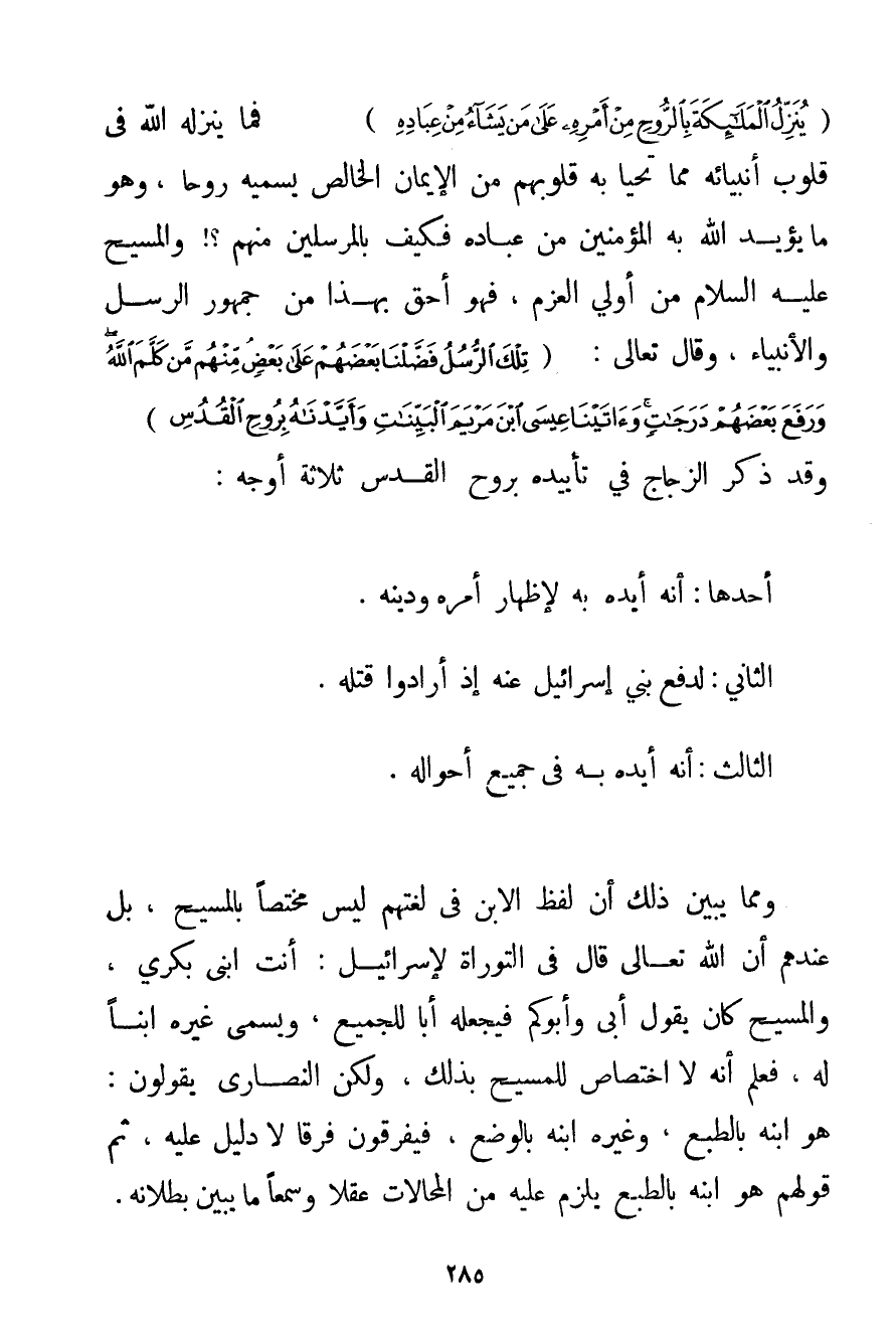 الْمَلَائِكَةَ بِالرُّوحِ مِنْ أَمْرِهِ عَلَى مَنْ يَشَاءُ مِنْ عِبَادِهِ} فَمَا يُنَزِّلُهُ اللَّهُ فِي قُلُوبِ أَنْبِيَائِهِ مِمَّا تَحْيَا بِهِ قُلُوبُهُمْ مِنْ الْإِيمَانِ الْخَالِصِ يُسَمِّيهِ رُوحًا وَهُوَ مَا يُؤَيِّدُ اللَّهُ بِهِ الْمُؤْمِنِينَ مِنْ عِبَادِهِ فَكَيْفَ بِالْمُرْسَلِينَ مِنْهُمْ وَالْمَسِيحُ عَلَيْهِ السَّلَامُ مِنْ أُولِي الْعَزْمِ فَهُوَ أَحَقُّ بِهَذَا مِنْ جُمْهُورِ الرُّسُلِ وَالْأَنْبِيَاءِ وَقَالَ تَعَالَى: {تِلْكَ الرُّسُلُ فَضَّلْنَا بَعْضَهُمْ عَلَى بَعْضٍ مِنْهُمْ مَنْ كَلَّمَ اللَّهُ وَرَفَعَ بَعْضَهُمْ دَرَجَاتٍ وَآتَيْنَا عِيسَى ابْنَ مَرْيَمَ الْبَيِّنَاتِ وَأَيَّدْنَاهُ بِرُوحِ الْقُدُسِ} وَقَدْ ذَكَرَ الزَّجَّاجُ فِي تَأْيِيدِهِ بِرُوحِ الْقُدُسِ ثَلَاثَةَ أَوْجُهٍ: أَحَدُهَا: أَنَّهُ أَيَّدَهُ بِهِ لِإِظْهَارِ أَمْرِهِ وَدِينِهِ. الثَّانِي: لِدَفْعِ بَنِي إسْرَائِيلَ عَنْهُ إذْ أَرَادُوا قَتْلَهُ. الثَّالِثُ: أَنَّهُ أَيَّدَهُ بِهِ فِي جَمِيعِ أَحْوَالِهِ. وَمِمَّا يُبَيِّنُ ذَلِكَ أَنَّ لَفْظَ الِابْنِ فِي لُغَتِهِمْ لَيْسَ مُخْتَصًّا بِالْمَسِيحِ بَلْ عِنْدَهُمْ أَنَّ اللَّهَ تَعَالَى قَالَ فِي التَّوْرَاةِ لِإِسْرَائِيلَ: أَنْتَ ابْنِي بِكْرِيّ وَالْمَسِيحُ كَانَ يَقُولُ أَبِي وَأَبُوكُمْ فَيَجْعَلُهُ أَبًا لِلْجَمِيعِ وَيُسَمِّي غَيْرَهُ ابْنًا لَهُ فَعُلِمَ أَنَّهُ لَا اخْتِصَاصَ لِلْمَسِيحِ بِذَلِكَ وَلَكِنَّ النَّصَارَى يَقُولُونَ: هُوَ ابْنُهُ بِالطَّبْعِ وَغَيْرُهُ ابْنُهُ بِالْوَضْعِ فَيُفَرِّقُونَ فَرْقًا لَا دَلِيلَ عَلَيْهِ ثُمَّ قَوْلُهُمْ هُوَ ابْنُهُ بِالطَّبْعِ يَلْزَمُ عَلَيْهِ مِنْ الْمُحَالَاتِ عَقْلًا وَسَمْعًا مَا يَبِينُ بُطْلَانُهُ.