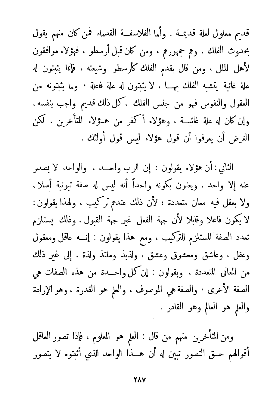 قَدِيمٌ مَعْلُولٌ لِعِلَّةٍ قَدِيمَةٍ. وَأَمَّا الْفَلَاسِفَةُ الْقُدَمَاءُ فَمَنْ كَانَ مِنْهُمْ يَقُولُ بِحُدُوثِ الْفَلَكِ وَهُمْ جُمْهُورُهُمْ وَمَنْ كَانَ قَبْلَ أَرِسْطُو فَهَؤُلَاءِ مُوَافِقُونَ لِأَهْلِ الْمِلَلِ وَمَنْ قَالَ بِقِدَمِ الْفَلَكِ كَأَرِسْطُو وَشِيعَتِهِ فَإِنَّمَا يُثْبِتُونَ لَهُ عِلَّةً غائية يَتَشَبَّهُ الْفَلَكُ بِهَا لَا يُثْبِتُونَ لَهُ عِلَّةً فَاعِلَةً وَمَا يُثْبِتُونَهُ مِنْ الْعُقُولِ وَالنُّفُوسِ فَهُوَ مِنْ جِنْسِ الْفَلَكِ كُلُّ ذَلِكَ قَدِيمٌ وَاجِبٌ بِنَفْسِهِ وَإِنْ كَانَ لَهُ عِلَّةٌ غائية وَهَؤُلَاءِ أَكْفَرُ مِنْ هَؤُلَاءِ الْمُتَأَخِّرِينَ لَكِنَّ الْغَرَضَ أَنْ يَعْرِفُوا أَنَّ قَوْلَ هَؤُلَاءِ لَيْسَ قَوْلَ أُولَئِكَ. الثَّانِي: أَنَّ هَؤُلَاءِ يَقُولُونَ: إنَّ الرَّبَّ وَاحِدٌ وَالْوَاحِدُ لَا يَصْدُرُ عَنْهُ إلَّا وَاحِدٌ وَيَعْنُونَ بِكَوْنِهِ وَاحِدًا أَنَّهُ لَيْسَ لَهُ صِفَةٌ ثُبُوتِيَّةٌ أَصْلًا وَلَا يُعْقَلُ فِيهِ مَعَانٍ مُتَعَدِّدَةٌ؛ لِأَنَّ ذَلِكَ عِنْدَهُمْ تَرْكِيبٌ وَلِهَذَا يَقُولُونَ: لَا يَكُونُ فَاعِلًا وَقَابِلًا لِأَنَّ جِهَةَ الْفِعْلِ غَيْرُ جِهَةِ الْقَبُولِ وَذَلِكَ يَسْتَلْزِمُ تَعَدُّدَ الصِّفَةِ الْمُسْتَلْزِمِ لِلتَّرْكِيبِ وَمَعَ هَذَا يَقُولُونَ: إنَّهُ عَاقِلٌ وَمَعْقُولٌ وَعَقْلٌ وَعَاشِقٌ وَمَعْشُوقٌ وَعِشْقٌ وَلَذِيذٌ وَمُلْتَذٌّ وَلَذَّةٌ إلَى غَيْرِ ذَلِكَ مِنْ الْمَعَانِي الْمُتَعَدِّدَةِ وَيَقُولُونَ: إنَّ كُلَّ وَاحِدَةٍ مِنْ هَذِهِ الصِّفَاتِ هِيَ الصِّفَةُ الْأُخْرَى وَالصِّفَةُ هِيَ الْمَوْصُوفُ وَالْعِلْمُ هُوَ الْقُدْرَةُ وَهُوَ الْإِرَادَةُ وَالْعِلْمُ هُوَ الْعَالَمُ وَهُوَ الْقَادِرُ. وَمِنْ الْمُتَأَخِّرِينَ مِنْهُمْ مَنْ قَالَ: الْعِلْمُ هُوَ الْمَعْلُومُ فَإِذَا تَصَوَّرَ الْعَاقِلُ أَقْوَالَهُمْ حَقَّ التَّصَوُّرِ تَبَيَّنَ لَهُ أَنَّ هَذَا الْوَاحِدَ الَّذِي أَثْبَتُوهُ لَا يُتَصَوَّرُ