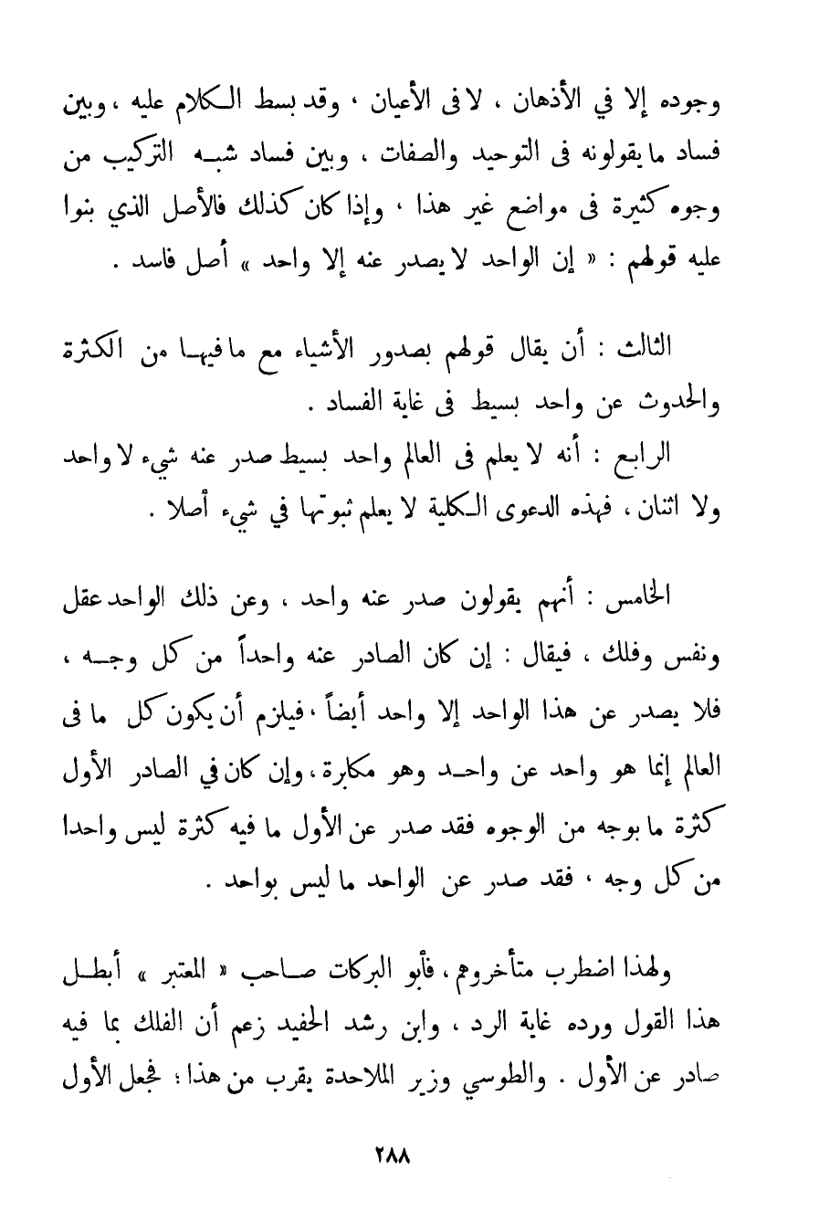 وُجُودُهُ إلَّا فِي الْأَذْهَانِ لَا فِي الْأَعْيَانِ وَقَدْ بُسِطَ الْكَلَامُ عَلَيْهِ وَبُيِّنَ فَسَادُ مَا يَقُولُونَهُ فِي التَّوْحِيدِ وَالصِّفَاتِ وَبُيِّنَ فَسَادُ شُبَهِ التَّرْكِيبِ مِنْ وُجُوهٍ كَثِيرَةٍ فِي مَوَاضِعَ غَيْرِ هَذَا وَإِذَا كَانَ كَذَلِكَ فَالْأَصْلُ الَّذِي بَنَوْا عَلَيْهِ قَوْلَهُمْ: " إنَّ الْوَاحِدَ لَا يَصْدُرُ عَنْهُ إلَّا وَاحِدٌ " أَصْلٌ فَاسِدٌ. الثَّالِثُ: أَنْ يُقَالَ قَوْلُهُمْ بِصُدُورِ الْأَشْيَاءِ مَعَ مَا فِيهَا مِنْ الْكَثْرَةِ وَالْحُدُوثِ عَنْ وَاحِدٍ بَسِيطٍ فِي غَايَةِ الْفَسَادِ. الرَّابِعُ: أَنَّهُ لَا يُعْلَمُ فِي الْعَالِمِ وَاحِدٌ بَسِيطٌ صَدَرَ عَنْهُ شَيْءٌ لَا وَاحِدٌ وَلَا اثْنَانِ فَهَذِهِ الدَّعْوَى الْكُلِّيَّةُ لَا يُعْلَمُ ثُبُوتُهَا فِي شَيْءٍ أَصْلًا. الْخَامِسُ: أَنَّهُمْ يَقُولُونَ صَدَرَ عَنْهُ وَاحِدٌ وَعَنْ ذَلِكَ الْوَاحِدِ عَقْلٌ وَنَفْسٌ وَفَلَكٌ فَيُقَالُ: إنْ كَانَ الصَّادِرُ عَنْهُ وَاحِدًا مِنْ كُلِّ وَجْهٍ فَلَا يَصْدُرُ عَنْ هَذَا الْوَاحِدِ إلَّا وَاحِدٌ أَيْضًا فَيَلْزَمُ أَنْ يَكُونَ كُلُّ مَا فِي الْعَالَمِ إنَّمَا هُوَ وَاحِدٌ عَنْ وَاحِدٍ وَهُوَ مُكَابَرَةٌ وَإِنْ كَانَ فِي الصَّادِرِ الْأَوَّلِ كَثْرَةٌ مَا بِوَجْهٍ مِنْ الْوُجُوهِ فَقَدْ صَدَرَ عَنْ الْأَوَّلِ مَا فِيهِ كَثْرَةٌ لَيْسَ وَاحِدًا مِنْ كُلِّ وَجْهٍ فَقَدْ صَدَرَ عَنْ الْوَاحِدِ مَا لَيْسَ بِوَاحِدِ. وَلِهَذَا اضْطَرَبَ مُتَأَخِّرُوهُمْ فَأَبُو الْبَرَكَاتِ صَاحِبُ " الْمُعْتَبَرِ " أَبْطَلَ هَذَا الْقَوْلَ وَرَدَّهُ غَايَةَ الرَّدِّ وَابْنُ رُشْدٍ الْحَفِيدُ زَعَمَ أَنَّ الْفَلَكَ بِمَا فِيهِ صَادِرٌ عَنْ الْأَوَّلِ. والطوسي وَزِيرُ الْمَلَاحِدَةِ يَقْرُبُ مِنْ هَذَا؛ فَجَعَلَ الْأَوَّلَ