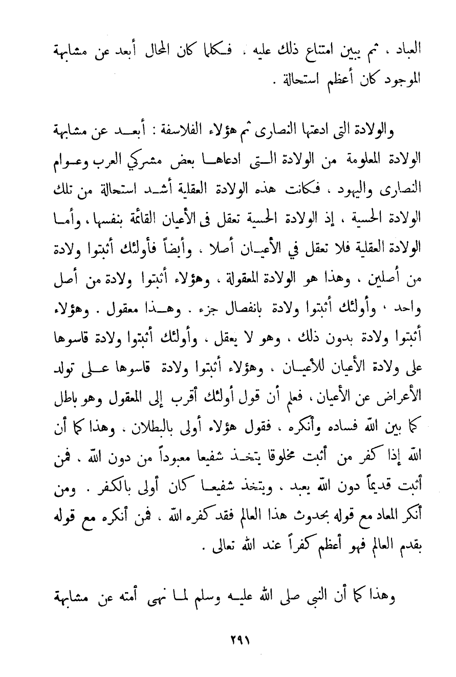 الْعِبَادِ ثُمَّ يُبَيِّنُ امْتِنَاعَ ذَلِكَ عَلَيْهِ فَكُلَّمَا كَانَ الْمُحَالُ أَبْعَدَ عَنْ مُشَابَهَةِ الْمَوْجُودِ كَانَ أَعْظَمَ اسْتِحَالَةٍ. وَالْوِلَادَةُ الَّتِي ادَّعَتْهَا النَّصَارَى ثُمَّ هَؤُلَاءِ الْفَلَاسِفَةُ: أَبْعَدُ عَنْ مُشَابَهَةِ الْوِلَادَةِ الْمَعْلُومَةِ مِنْ الْوِلَادَةِ الَّتِي ادَّعَاهَا بَعْضُ مُشْرِكِي الْعَرَبِ وَعَوَّامِ النَّصَارَى وَالْيَهُودِ فَكَانَتْ هَذِهِ الْوِلَادَةُ الْعَقْلِيَّةُ أَشَدَّ اسْتِحَالَةً مِنْ تِلْكَ الْوِلَادَةِ الْحِسِّيَّةِ إذْ الْوِلَادَةُ الْحِسِّيَّةُ تُعْقَلُ فِي الْأَعْيَانِ الْقَائِمَةِ بِنَفْسِهَا وَأَمَّا الْوِلَادَةُ الْعَقْلِيَّةُ فَلَا تُعْقَلُ فِي الْأَعْيَانِ أَصْلًا وَأَيْضًا فَأُولَئِكَ أَثْبَتُوا وِلَادَةً مِنْ أَصْلَيْنِ وَهَذَا هُوَ الْوِلَادَةُ الْمَعْقُولَةُ وَهَؤُلَاءِ أَثْبَتُوا وِلَادَةً مِنْ أَصْلٍ وَاحِدٍ وَأُولَئِكَ أَثْبَتُوا وِلَادَةً بِانْفِصَالِ جُزْءٍ وَهَذَا مَعْقُولٌ. وَهَؤُلَاءِ أَثْبَتُوا وِلَادَةً بِدُونِ ذَلِكَ وَهُوَ لَا يُعْقَلُ وَأُولَئِكَ أَثْبَتُوا وِلَادَةً قَاسُوهَا عَلَى وِلَادَةِ الْأَعْيَانِ لِلْأَعْيَانِ وَهَؤُلَاءِ أَثْبَتُوا وِلَادَةً قَاسُوهَا عَلَى تَوَلُّدِ الْأَعْرَاضِ عَنْ الْأَعْيَانِ فَعُلِمَ أَنَّ قَوْلَ أُولَئِكَ أَقْرَبُ إلَى الْمَعْقُولِ وَهُوَ بَاطِلٌ كَمَا بَيَّنَ اللَّهُ فَسَادَهُ وَأَنْكَرَهُ فَقَوْلُ هَؤُلَاءِ أَوْلَى بِالْبُطْلَانِ وَهَذَا كَمَا أَنَّ اللَّهَ إذَا كَفَّرَ مَنْ أَثْبَتَ مَخْلُوقًا يُتَّخَذُ شَفِيعًا مَعْبُودًا مِنْ دُونِ اللَّهِ فَمَنْ أَثْبَتَ قَدِيمًا دُونَ اللَّهِ يُعْبَدُ وَيُتَّخَذُ شَفِيعًا كَانَ أَوْلَى بِالْكُفْرِ. وَمَنْ أَنْكَرَ الْمَعَادَ مَعَ قَوْلِهِ بِحُدُوثِ هَذَا الْعَالَمِ فَقَدْ كَفَّرَهُ اللَّهُ فَمَنْ أَنْكَرَهُ مَعَ قَوْلِهِ بِقِدَمِ الْعَالَمِ فَهُوَ أَعْظَمُ كُفْرًا عِنْدَ اللَّهِ تَعَالَى. وَهَذَا كَمَا أَنَّ النَّبِيَّ صَلَّى اللَّهُ عَلَيْهِ وَسَلَّمَ لَمَّا نَهَى أُمَّتَهُ عَنْ مُشَابَهَةِ