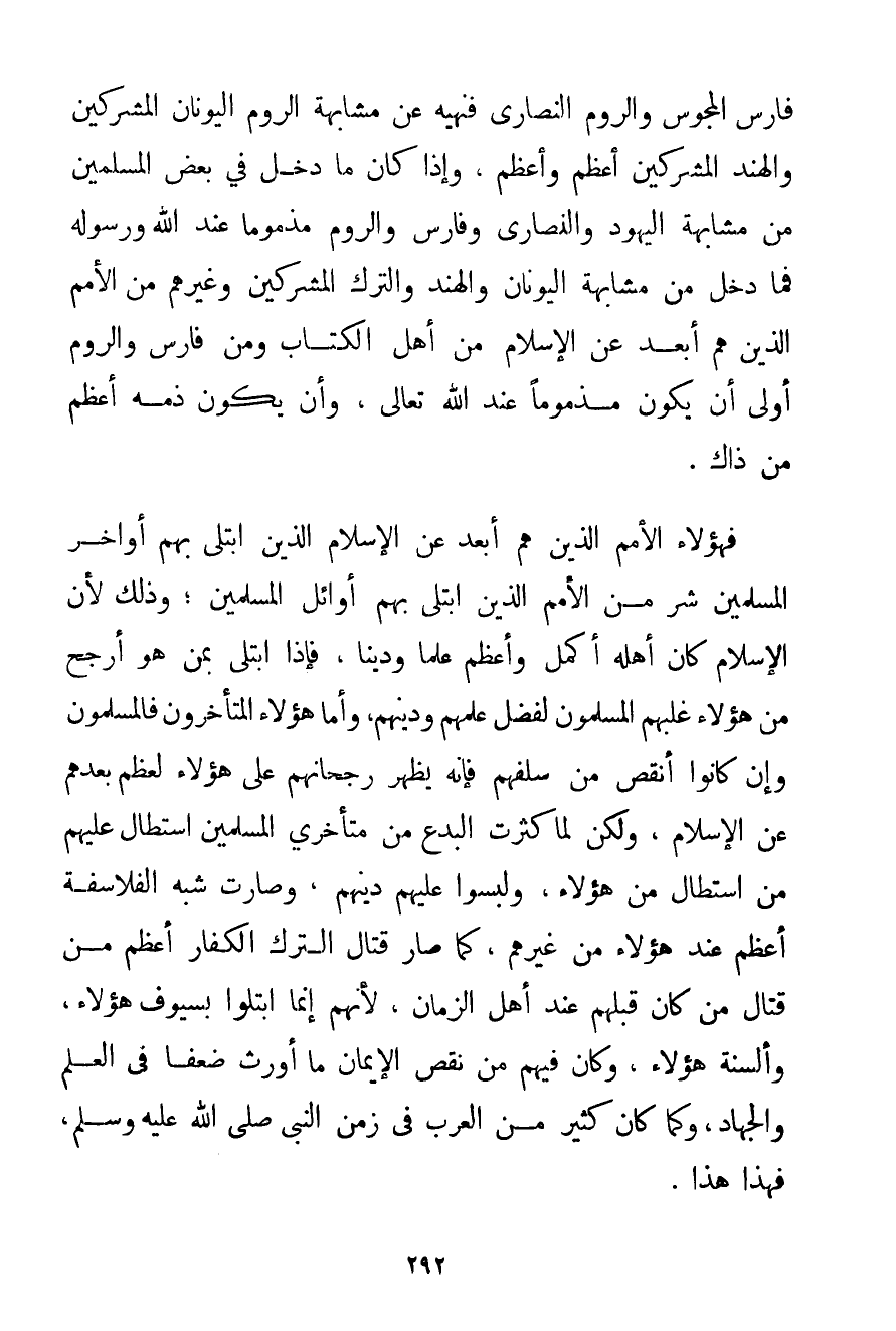 فَارِسَ الْمَجُوسِ وَالرُّومِ النَّصَارَى فَنَهْيُهُ عَنْ مُشَابَهَةِ الرُّومِ الْيُونَانِ الْمُشْرِكِينَ وَالْهِنْدِ الْمُشْرِكِينَ أَعْظَمُ وَأَعْظَمُ وَإِذَا كَانَ مَا دَخَلَ فِي بَعْضِ الْمُسْلِمِينَ مِنْ مُشَابَهَةِ الْيَهُودِ وَالنَّصَارَى وَفَارِسَ وَالرُّومِ مَذْمُومًا عِنْدَ اللَّهِ وَرَسُولِهِ فَمَا دَخَلَ مِنْ مُشَابَهَةِ الْيُونَانِ وَالْهِنْدِ وَالتُّرْكِ الْمُشْرِكِينَ وَغَيْرِهِمْ مِنْ الْأُمَمِ الَّذِينَ هُمْ أَبْعَدُ عَنْ الْإِسْلَامِ مِنْ أَهْلِ الْكِتَابِ وَمِنْ فَارِسَ وَالرُّومِ أَوْلَى أَنْ يَكُونَ مَذْمُومًا عِنْدَ اللَّهِ تَعَالَى وَأَنْ يَكُونَ ذَمُّهُ أَعْظَمَ مِنْ ذَاكَ. فَهَؤُلَاءِ الْأُمَمُ الَّذِينَ هُمْ أَبْعَدُ عَنْ الْإِسْلَامِ الَّذِينَ اُبْتُلِيَ بِهِمْ أَوَاخِرُ الْمُسْلِمِينَ شَرٌّ مِنْ الْأُمَمِ الَّذِينَ اُبْتُلِيَ بِهِمْ أَوَائِلُ الْمُسْلِمِينَ؛ وَذَلِكَ لِأَنَّ الْإِسْلَامَ كَانَ أَهْلُهُ أَكْمَلَ وَأَعْظَمَ عِلْمًا وَدِينًا فَإِذَا اُبْتُلِيَ بِمَنْ هُوَ أَرْجَحُ مِنْ هَؤُلَاءِ غَلَبَهُمْ الْمُسْلِمُونَ لِفَضْلِ عِلْمِهِمْ وَدِينِهِمْ وَأَمَّا هَؤُلَاءِ الْمُتَأَخِّرُونَ فَالْمُسْلِمُونَ وَإِنْ كَانُوا أَنْقَصَ مِنْ سَلَفِهِمْ فَإِنَّهُ يَظْهَرُ رُجْحَانُهُمْ عَلَى هَؤُلَاءِ لِعِظَمِ بُعْدِهِمْ عَنْ الْإِسْلَامِ وَلَكِنْ لَمَّا كَثُرَتْ الْبِدَعُ مِنْ مُتَأَخَّرِي الْمُسْلِمِينَ اسْتَطَالَ عَلَيْهِمْ مَنْ اسْتَطَالَ مِنْ هَؤُلَاءِ وَلَبَّسُوا عَلَيْهِمْ دِينَهُمْ وَصَارَتْ شُبَهُ الْفَلَاسِفَةِ أَعْظَمَ عِنْدَ هَؤُلَاءِ مِنْ غَيْرِهِمْ كَمَا صَارَ قِتَالُ التُّرْكِ الْكُفَّارِ أَعْظَمَ مِنْ قِتَالِ مَنْ كَانَ قَبْلَهُمْ عِنْدَ أَهْلِ الزَّمَانِ لِأَنَّهُمْ إنَّمَا اُبْتُلُوا بِسُيُوفِ هَؤُلَاءِ وَأَلْسِنَةِ هَؤُلَاءِ وَكَانَ فِيهِمْ مِنْ نَقْصِ الْإِيمَانِ مَا أَوْرَثَ ضَعْفًا فِي الْعِلْمِ وَالْجِهَادِ وَكَمَا كَانَ كَثِيرٌ مِنْ الْعَرَب فِي زَمَنِ النَّبِيِّ صَلَّى اللَّهُ عَلَيْهِ وَسَلَّمَ فَهَذَا هَذَا.