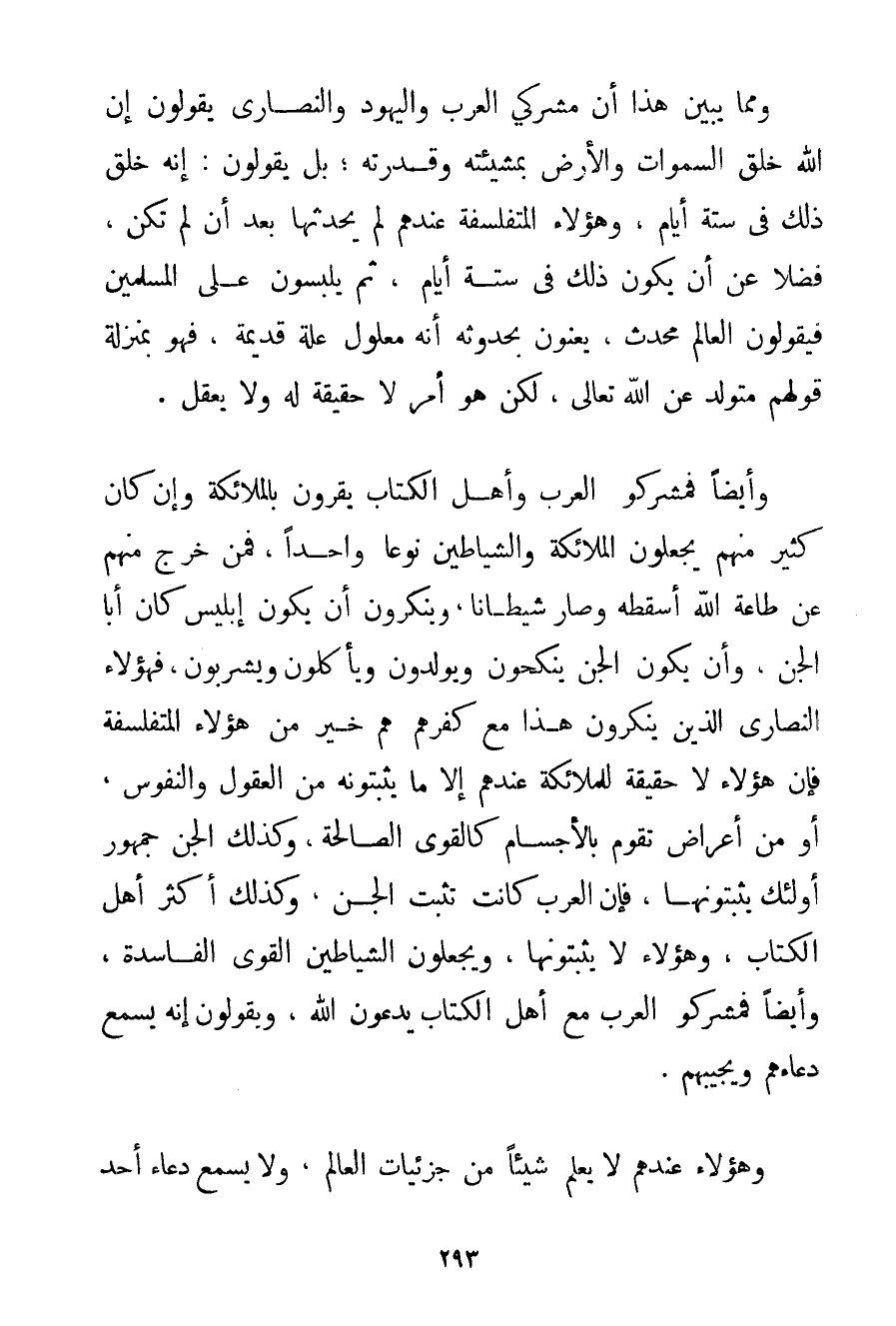 وَمِمَّا يَبِينُ هَذَا أَنَّ مُشْرِكِي الْعَرَبِ وَالْيَهُودِ وَالنَّصَارَى يَقُولُونَ إنَّ اللَّهَ خَلَقَ السَّمَوَاتِ وَالْأَرْضَ بِمَشِيئَتِهِ وَقُدْرَتِهِ: بَلْ يَقُولُونَ: إنَّهُ خَلَقَ ذَلِكَ فِي سِتَّةِ أَيَّامٍ وَهَؤُلَاءِ الْمُتَفَلْسِفَةُ عِنْدَهُمْ لَمْ يُحْدِثْهَا بَعْدَ أَنْ لَمْ تَكُنْ فَضْلًا عَنْ أَنْ يَكُونَ ذَلِكَ فِي سِتَّةِ أَيَّامٍ ثُمَّ يُلْبِسُونَ عَلَى الْمُسْلِمِينَ فَيَقُولُونَ الْعَالَمُ مُحْدَثٌ يَعْنُونَ بِحُدُوثِهِ أَنَّهُ مَعْلُولٌ عِلَّةً قَدِيمَةً فَهُوَ بِمَنْزِلَةِ قَوْلِهِمْ مُتَوَلِّدٌ عَنْ اللَّهِ تَعَالَى لَكِنْ هُوَ أَمْرٌ لَا حَقِيقَةَ لَهُ وَلَا يَعْقِلُ. وَأَيْضًا فَمُشْرِكُو الْعَرَبِ وَأَهْلُ الْكِتَابِ يُقِرُّونَ بِالْمَلَائِكَةِ وَإِنْ كَانَ كَثِيرٌ مِنْهُمْ يَجْعَلُونَ الْمَلَائِكَةَ وَالشَّيَاطِينَ نَوْعًا وَاحِدًا فَمَنْ خَرَجَ مِنْهُمْ عَنْ طَاعَةِ اللَّهِ أَسْقَطَهُ وَصَارَ شَيْطَانًا وَيَنْكَرُونَ أَنْ يَكُونَ إبْلِيسُ كَانَ أَبَا الْجِنِّ وَأَنْ يَكُونَ الْجِنُّ يَنْكِحُونَ وَيُولَدُونَ وَيَأْكُلُونَ وَيَشْرَبُونَ فَهَؤُلَاءِ النَّصَارَى الَّذِينَ يُنْكِرُونَ هَذَا مَعَ كُفْرِهِمْ هُمْ خَيْرٌ مِنْ هَؤُلَاءِ الْمُتَفَلْسِفَةِ فَإِنَّ هَؤُلَاءِ لَا حَقِيقَةَ لِلْمَلَائِكَةِ عِنْدَهُمْ إلَّا مَا يُثْبِتُونَهُ مِنْ الْعُقُولِ وَالنُّفُوسِ أَوْ مِنْ أَعْرَاضٍ تَقُومُ بِالْأَجْسَامِ كَالْقُوَى الصَّالِحَةِ وَكَذَلِكَ الْجِنُّ جُمْهُورُ أُولَئِكَ يُثْبِتُونَهَا فَإِنَّ الْعَرَبَ كَانَتْ تُثْبِتُ الْجِنَّ وَكَذَلِكَ أَكْثَرُ أَهْلِ الْكِتَابِ وَهَؤُلَاءِ لَا يُثْبِتُونَهَا وَيَجْعَلُونَ الشَّيَاطِينَ الْقُوَى الْفَاسِدَةَ وَأَيْضًا فَمُشْرِكُو الْعَرَبِ مَعَ أَهْلِ الْكِتَابِ يَدْعُونَ اللَّهَ وَيَقُولُونَ إنَّهُ يَسْمَعُ دُعَاءَهُمْ وَيُجِيبُهُمْ. وَهَؤُلَاءِ عِنْدَهُمْ لَا يَعْلَمُ شَيْئًا مِنْ جُزْئِيَّاتِ الْعَالَمِ وَلَا يَسْمَعُ دُعَاءَ أَحَدٍ
