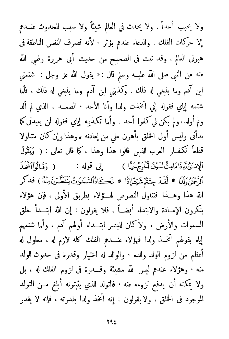 وَلَا يُجِيبُ أَحَدًا وَلَا يُحْدِثُ فِي الْعَالَمِ شَيْئًا وَلَا سَبَبً لِلْحُدُوثِ عِنْدَهُمْ إلَّا حَرَكَاتُ الْفَلَكِ وَالدُّعَاءِ عِنْدَهُمْ يُؤَثِّرُ لِأَنَّهُ تَصَرُّفُ النَّفْسِ النَّاطِقَةِ فِي هَيُولَى الْعَالَمِ وَقَدْ ثَبَتَ فِي الصَّحِيحِ مِنْ حَدِيثِ أَبِي هُرَيْرَةَ رَضِيَ اللَّهُ عَنْهُ عَنْ النَّبِيِّ صَلَّى اللَّهُ عَلَيْهِ وَسَلَّمَ قَالَ: {يَقُولُ اللَّهُ عَزَّ وَجَلَّ: شَتَمَنِي ابْنُ آدَمَ وَمَا يَنْبَغِي لَهُ ذَلِكَ وَكَذَّبَنِي ابْنُ آدَمَ وَمَا يَنْبَغِي لَهُ ذَلِكَ فَأَمَّا شَتْمُهُ إيَّايَ فَقَوْلُهُ إنِّي اتَّخَذْت وَلَدًا وَأَنَا الْأَحَدُ الصَّمَدُ الَّذِي لَمْ أَلِدْ وَلَمْ أُولَدْ وَلَمْ يَكُنْ لِي كُفُوًا أَحَدٌ وَأَمَّا تَكْذِيبُهُ إيَّايَ فَقَوْلُهُ لَنْ يُعِيدَنِي كَمَا بَدَأَنِي وَلَيْسَ أَوَّلُ الْخَلْقِ بِأَهْوَنَ عَلَيَّ مِنْ إعَادَتِهِ} وَهَذَا وَإِنْ كَانَ مُتَنَاوِلًا قَطْعًا لِكُفَّارِ الْعَرَبِ الَّذِينَ قَالُوا هَذَا وَهَذَا كَمَا قَالَ تَعَالَى: {وَيَقُولُ الْإِنْسَانُ أَئِذَا مَا مِتُّ لَسَوْفَ أُخْرَجُ حَيًّا} إلَى قَوْلِهِ: {وَقَالُوا اتَّخَذَ الرَّحْمَنُ وَلَدًا} {لَقَدْ جِئْتُمْ شَيْئًا إدًّا} {تَكَادُ السَّمَاوَاتُ يَتَفَطَّرْنَ مِنْهُ} فَذِكْرُ اللَّهِ هَذَا وَهَذَا فَتَنَاوُلُ النُّصُوصِ لِهَؤُلَاءِ بِطَرِيقِ الْأَوْلَى فَإِنَّ هَؤُلَاءِ يُنْكِرُونَ الْإِعَادَةَ وَالِابْتِدَاءَ أَيْضًا فَلَا يَقُولُونَ: إنَّ اللَّهَ ابْتَدَأَ خَلْقَ السَّمَوَاتِ وَالْأَرْضِ وَلَا كَانَ لِلْبَشَرِ ابْتِدَاءٌ أَوَّلُهُمْ آدَمَ وَأَمَّا شَتْمُهُمْ إيَّاهُ بِقَوْلِهِمْ اتَّخَذَ وَلَدًا فَهَؤُلَاءِ عِنْدَهُمْ الْفَلَكُ كُلُّهُ لَازِمٌ لَهُ مَعْلُولٌ لَهُ أَعْظَمُ مِنْ لُزُومِ الْوَلَدِ وَالِدَهُ وَالْوَالِدُ لَهُ اخْتِيَارٌ وَقُدْرَةٌ فِي حُدُوثِ الْوَلَدِ مِنْهُ وَهَؤُلَاءِ عِنْدَهُمْ لَيْسَ لِلَّهِ مَشِيئَةٌ وَقُدْرَةٌ فِي لُزُومِ الْفَلَكِ لَهُ بَلْ وَلَا يُمْكِنُهُ أَنْ يَدْفَعَ لُزُومَهُ عَنْهُ فَالتَّوَلُّدُ الَّذِي يُثْبِتُونَهُ أَبْلَغُ مِنْ التَّوَلُّدِ الْمَوْجُودِ فِي الْخَلْقِ وَلَا يَقُولُونَ: إنَّهُ اتَّخَذَ وَلَدًا بِقُدْرَتِهِ فَإِنَّهُ لَا يَقْدِرُ