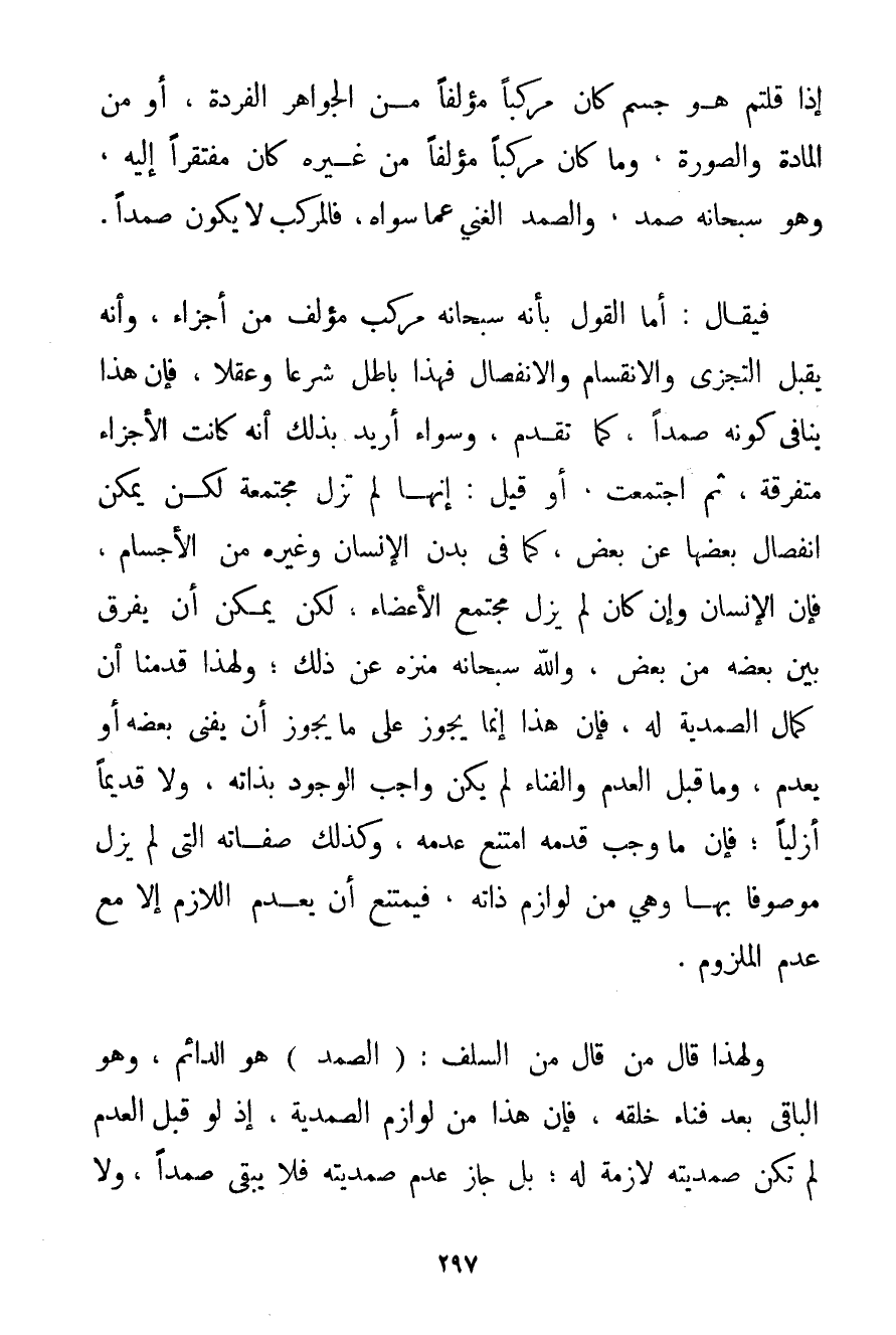 إذَا قُلْتُمْ هُوَ جِسْمٌ كَانَ مُرَكَّبًا مُؤَلَّفًا مِنْ الْجَوَاهِرِ الْفَرْدَةِ أَوْ مِنْ الْمَادَّةِ وَالصُّورَةِ وَمَا كَانَ مُرَكَّبًا مُؤَلَّفًا مِنْ غَيْرِهِ كَانَ مُفْتَقِرًا إلَيْهِ وَهُوَ سُبْحَانَهُ صَمَدٌ وَالصَّمَدُ الْغَنِيُّ عَمَّا سِوَاهُ فَالْمُرَكَّبُ لَا يَكُونُ صَمَدًا. فَيُقَالُ: أَمَّا الْقَوْلُ بِأَنَّهُ سُبْحَانَهُ مُرَكَّبٌ مُؤَلَّفٌ مِنْ أَجْزَاءَ وَأَنَّهُ يَقْبَلُ التَّجَزُّؤَ وَالِانْقِسَامَ وَالِانْفِصَالَ فَهَذَا بَاطِلٌ شَرْعًا وَعَقْلًا فَإِنَّ هَذَا يُنَافِي كَوْنَهُ صَمَدًا كَمَا تَقَدَّمَ وَسَوَاءٌ أُرِيدَ بِذَلِكَ أَنَّهُ كَانَتْ الْأَجْزَاءُ مُتَفَرِّقَةً ثُمَّ اجْتَمَعَتْ أَوْ قِيلَ: إنَّهَا لَمْ تَزَلْ مُجْتَمِعَةً لَكِنْ يُمْكِنُ انْفِصَالُ بَعْضِهَا عَنْ بَعْضٍ كَمَا فِي بَدَنِ الْإِنْسَانِ وَغَيْرِهِ مِنْ الْأَجْسَامِ فَإِنَّ الْإِنْسَانَ وَإِنْ كَانَ لَمْ يَزَلْ مُجْتَمِعَ الْأَعْضَاءِ: لَكِنْ يُمْكِنُ أَنْ يُفَرَّقَ بَيْنَ بَعْضِهِ مِنْ بَعْضٍ وَاَللَّهُ سُبْحَانَهُ مُنَزَّهٌ عَنْ ذَلِكَ؛ وَلِهَذَا قَدَّمْنَا أَنَّ كَمَالَ الصَّمَدِيَّةِ لَهُ فَإِنَّ هَذَا إنَّمَا يَجُوزُ عَلَى مَا يَجُوزُ أَنْ يَفْنَى بَعْضُهُ أَوْ يَعْدَمَ وَمَا قَبْلَ الْعَدَمِ وَالْفِنَاءِ لَمْ يَكُنْ وَاجِبَ الْوُجُودِ بِذَاتِهِ وَلَا قَدِيمًا أَزَلِيًّا؛ فَإِنَّ مَا وَجَبَ قِدَمُهُ امْتَنَعَ عَدَمُهُ وَكَذَلِكَ صِفَاتُهُ الَّتِي لَمْ يَزَلْ مَوْصُوفًا بِهَا وَهِيَ مِنْ لَوَازِمِ ذَاتِهِ فَيَمْتَنِعُ أَنْ يَعْدَمَ اللَّازِمُ إلَّا مَعَ عَدَمِ الْمَلْزُومِ. وَلِهَذَا قَالَ مَنْ قَالَ مِنْ السَّلَفِ. الصَّمَدُ هُوَ الدَّائِمُ وَهُوَ الْبَاقِي بَعْدَ فَنَاءِ خَلْقِهِ فَإِنَّ هَذَا مِنْ لَوَازِمِ الصَّمَدِيَّةِ إذْ لَوْ قَبْلَ الْعَدَمِ لَمْ تَكُنْ صَمَدِيَّتُهُ لَازِمَةً لَهُ؛ بَلْ جَازَ عَدَمُ صَمَدِيَّتِهِ فَلَا يَبْقَى صَمَدًا وَلَا
