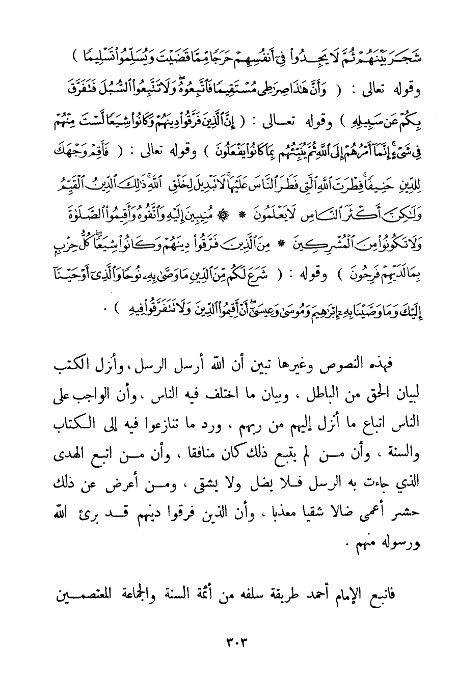 وَيُسَلِّمُوا تَسْلِيمًا} وَقَوْلُهُ تَعَالَى: {وَأَنَّ هَذَا صِرَاطِي مُسْتَقِيمًا فَاتَّبِعُوهُ وَلَا تَتَّبِعُوا السُّبُلَ فَتَفَرَّقَ بِكُمْ عَنْ سَبِيلِهِ} وَقَوْلُهُ تَعَالَى: {إنَّ الَّذِينَ فَرَّقُوا دِينَهُمْ وَكَانُوا شِيَعًا لَسْتَ مِنْهُمْ فِي شَيْءٍ إنَّمَا أَمْرُهُمْ إلَى اللَّهِ ثُمَّ يُنَبِّئُهُمْ بِمَا كَانُوا يَفْعَلُونَ} وَقَوْلُهُ تَعَالَى: {فَأَقِمْ وَجْهَكَ لِلدِّينِ حَنِيفًا فِطْرَةَ اللَّهِ الَّتِي فَطَرَ النَّاسَ عَلَيْهَا لَا تَبْدِيلَ لِخَلْقِ اللَّهِ ذَلِكَ الدِّينُ الْقَيِّمُ وَلَكِنَّ أَكْثَرَ النَّاسِ لَا يَعْلَمُونَ} {مُنِيبِينَ إلَيْهِ وَاتَّقُوهُ وَأَقِيمُوا الصَّلَاةَ وَلَا تَكُونُوا مِنَ الْمُشْرِكِينَ} {مِنَ الَّذِينَ فَرَّقُوا دِينَهُمْ وَكَانُوا شِيَعًا كُلُّ حِزْبٍ بِمَا لَدَيْهِمْ فَرِحُونَ} وَقَوْلُهُ: {شَرَعَ لَكُمْ مِنَ الدِّينِ مَا وَصَّى بِهِ نُوحًا وَالَّذِي أَوْحَيْنَا إلَيْكَ وَمَا وَصَّيْنَا بِهِ إبْرَاهِيمَ وَمُوسَى وَعِيسَى أَنْ أَقِيمُوا الدِّينَ وَلَا تَتَفَرَّقُوا فِيهِ} . فَهَذِهِ النُّصُوصُ وَغَيْرُهَا تُبَيِّنُ أَنَّ اللَّهَ أَرْسَلَ الرُّسُلَ وَأَنْزَلَ الْكُتُبَ لِبَيَانِ الْحَقِّ مِنْ الْبَاطِلِ وَبَيَانِ مَا اخْتَلَفَ فِيهِ النَّاسُ وَأَنَّ الْوَاجِبَ عَلَى النَّاسِ اتِّبَاعُ مَا أُنْزِلَ إلَيْهِمْ مِنْ رَبِّهِمْ وَرَدُّ مَا تَنَازَعُوا فِيهِ إلَى الْكِتَابِ وَالسُّنَّةِ وَأَنَّ مَنْ لَمْ يَتَّبِعْ ذَلِكَ كَانَ مُنَافِقًا وَأَنَّ مَنْ اتَّبَعَ الْهُدَى الَّذِي جَاءَتْ بِهِ الرُّسُلُ فَلَا يَضِلُّ وَلَا يَشْقَى وَمَنْ أَعْرَضَ عَنْ ذَلِكَ حُشِرَ أَعْمَى ضَالًّا شَقِيًّا مُعَذَّبًا وَأَنَّ الَّذِينَ فَرَّقُوا دِينَهُمْ قَدْ بَرِئَ اللَّهُ وَرَسُولُهُ مِنْهُمْ. فَاتَّبَعَ الْإِمَامُ أَحْمَد طَرِيقَةَ سَلَفِهِ مِنْ أَئِمَّةِ السُّنَّةِ وَالْجَمَاعَةِ الْمُعْتَصِمِينَ