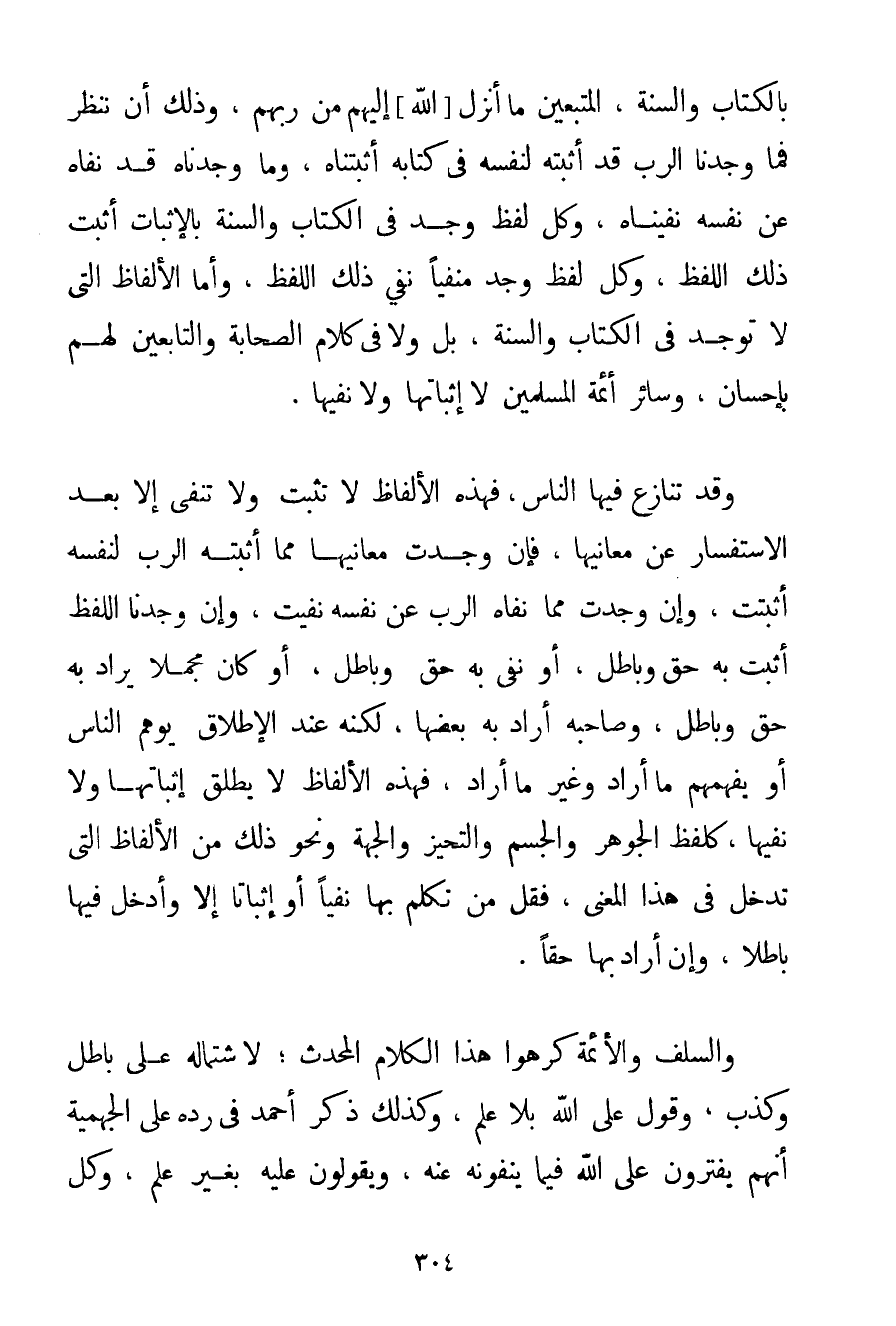 بِالْكِتَابِ وَالسُّنَّةِ الْمُتَّبِعِينَ مَا أَنْزَلَ اللَّهُ إلَيْهِمْ مِنْ رَبِّهِمْ وَذَلِكَ أَنْ نَنْظُرَ فَمَا وَجَدْنَا الرَّبَّ قَدْ أَثْبَتَهُ لِنَفْسِهِ فِي كِتَابِهِ أَثْبَتْنَاهُ وَمَا وَجَدْنَاهُ قَدْ نَفَاهُ عَنْ نَفْسِهِ نَفَيْنَاهُ وَكُلُّ لَفْظٍ وُجِدَ فِي الْكِتَابِ وَالسُّنَّةِ بِالْإِثْبَاتِ أُثْبِتَ ذَلِكَ اللَّفْظُ وَكُلُّ لَفْظٍ وُجِدَ مَنْفِيًّا نُفِيَ ذَلِكَ اللَّفْظُ وَأَمَّا الْأَلْفَاظُ الَّتِي لَا تُوجَدُ فِي الْكِتَابِ وَالسُّنَّةِ بَلْ وَلَا فِي كَلَامِ الصَّحَابَةِ وَالتَّابِعِينَ لَهُمْ بِإِحْسَانِ وَسَائِرِ أَئِمَّةِ الْمُسْلِمِينَ لَا إثْبَاتُهَا وَلَا نَفْيُهَا. وَقَدْ تَنَازَعَ فِيهَا النَّاسُ فَهَذِهِ الْأَلْفَاظُ لَا تُثْبَتُ وَلَا تُنْفَى إلَّا بَعْدَ الِاسْتِفْسَارِ عَنْ مَعَانِيهَا فَإِنْ وُجِدَتْ مَعَانِيهَا مِمَّا أَثْبَتَهُ الرَّبُّ لِنَفْسِهِ أُثْبِتَتْ وَإِنْ وُجِدَتْ مِمَّا نَفَاهُ الرَّبُّ عَنْ نَفْسِهِ نُفِيت وَإِنْ وَجَدْنَا اللَّفْظَ أُثْبِتَ بِهِ حَقٌّ وَبَاطِلٌ أَوْ نُفِيَ بِهِ حَقٌّ وَبَاطِلٌ أَوْ كَانَ مُجْمَلًا يُرَادُ بِهِ حَقٌّ وَبَاطِلٌ وَصَاحِبُهُ أَرَادَ بِهِ بَعْضَهَا لَكِنَّهُ عِنْدَ الْإِطْلَاقِ يُوهِمُ النَّاسَ أَوْ يُفْهِمُهُمْ مَا أَرَادَ وَغَيْرَ مَا أَرَادَ فَهَذِهِ الْأَلْفَاظُ لَا يُطْلَقُ إثْبَاتُهَا وَلَا نَفْيُهَا كَلَفْظِ الْجَوْهَرِ وَالْجِسْمِ وَالتَّحَيُّزِ وَالْجِهَةِ وَنَحْوِ ذَلِكَ مِنْ الْأَلْفَاظِ الَّتِي تَدْخُلُ فِي هَذَا الْمَعْنَى فَقَلَّ مَنْ تَكَلَّمَ بِهَا نَفْيًا أَوْ إثْبَاتًا إلَّا وَأَدْخَلَ فِيهَا بَاطِلًا وَإِنْ أَرَادَ بِهَا حَقًّا. وَالسَّلَفُ وَالْأَئِمَّةُ كَرِهُوا هَذَا الْكَلَامَ الْمُحْدَثَ؛ لِاشْتِمَالِهِ عَلَى بَاطِلٍ وَكَذِبٍ وَقَوْلٍ عَلَى اللَّهِ بِلَا عِلْمٍ وَكَذَلِكَ ذَكَرَ أَحْمَد فِي رَدِّهِ عَلَى الْجَهْمِيَّة أَنَّهُمْ يَفْتَرُونَ عَلَى اللَّهِ فِيمَا يَنْفُونَهُ عَنْهُ وَيَقُولُونَ عَلَيْهِ بِغَيْرِ عِلْمٍ وَكُلُّ