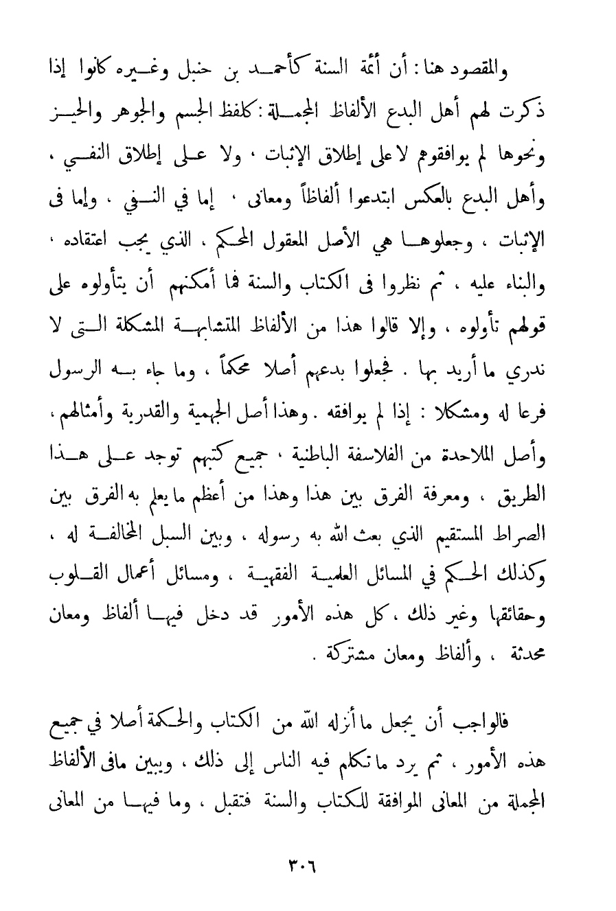 وَالْمَقْصُودُ هُنَا: أَنَّ أَئِمَّةَ السُّنَّةِ كَأَحْمَدَ بْنِ حَنْبَلٍ وَغَيْرِهِ كَانُوا إذَا ذَكَرَتْ لَهُمْ أَهْلُ الْبِدَعِ الْأَلْفَاظَ الْمُجْمَلَةَ: كَلَفْظِ الْجِسْمِ وَالْجَوْهَرِ وَالْحَيِّزِ وَنَحْوِهَا لَمْ يُوَافِقُوهُمْ لَا عَلَى إطْلَاقِ الْإِثْبَاتِ " وَلَا عَلَى إطْلَاقِ النَّفْيِ وَأَهْلُ الْبِدَعِ بِالْعَكْسِ ابْتَدَعُوا أَلْفَاظًا وَمَعَانِيَ إمَّا فِي النَّفْيِ وَإِمَّا فِي الْإِثْبَاتِ وَجَعَلُوهَا هِيَ الْأَصْلُ الْمَعْقُولُ الْمُحْكَمُ الَّذِي يَجِبُ اعْتِقَادُهُ وَالْبِنَاءُ عَلَيْهِ ثُمَّ نَظَرُوا فِي الْكِتَابِ وَالسُّنَّةِ فَمَا أَمْكَنَهُمْ أَنْ يَتَأَوَّلُوهُ عَلَى قَوْلِهِمْ تَأَوَّلُوهُ وَإِلَّا قَالُوا هَذَا مِنْ الْأَلْفَاظِ الْمُتَشَابِهَةِ الْمُشْكَلَةِ الَّتِي لَا نَدْرِي مَا أُرِيدَ بِهَا. فَجَعَلُوا بِدَعَهُمْ أَصْلًا مُحْكَمًا وَمَا جَاءَ بِهِ الرَّسُولُ فَرْعًا لَهُ وَمُشْكِلًا: إذَا لَمْ يُوَافِقْهُ. وَهَذَا أَصْلُ الْجَهْمِيَّة وَالْقَدَرِيَّةِ وَأَمْثَالِهِمْ وَأَصْلُ الْمَلَاحِدَةِ مِنْ الْفَلَاسِفَةِ الْبَاطِنِيَّةِ جَمِيعُ كُتُبِهِمْ تُوجَدُ عَلَى هَذَا الطَّرِيقِ وَمَعْرِفَةُ الْفَرْقِ بَيْنَ هَذَا وَهَذَا مِنْ أَعْظَمِ مَا يُعْلَمُ بِهِ الْفِرَقُ بَيْنَ الصِّرَاطِ الْمُسْتَقِيمِ الَّذِي بَعَثَ اللَّهُ بِهِ رَسُولَهُ وَبَيْنَ السُّبُلِ الْمُخَالِفَةِ لَهُ وَكَذَلِكَ الْحُكْمُ فِي الْمَسَائِلِ الْعِلْمِيَّةِ الْفِقْهِيَّةِ وَمَسَائِل أَعْمَالِ الْقُلُوبِ وَحَقَائِقِهَا وَغَيْرِ ذَلِكَ كُلُّ هَذِهِ الْأُمُورِ قَدْ دَخَلَ فِيهَا أَلْفَاظٌ وَمَعَانٍ مُحْدَثَةٌ وَأَلْفَاظٌ وَمَعَانٍ مُشْتَرِكَةٌ. فَالْوَاجِبُ أَنْ يَجْعَلَ مَا أَنْزَلَهُ اللَّهُ مِنْ الْكِتَابِ وَالْحِكْمَةِ أَصْلًا فِي جَمِيعِ هَذِهِ الْأُمُورِ ثُمَّ يَرُدَّ مَا تَكَلَّمَ فِيهِ النَّاسُ إلَى ذَلِكَ وَيُبَيِّنُ مَا فِي الْأَلْفَاظِ الْمُجْمَلَةِ مِنْ الْمَعَانِي الْمُوَافِقَةِ لِلْكِتَابِ وَالسُّنَّةِ فَتُقْبَلُ وَمَا فِيهَا مِنْ الْمَعَانِي
