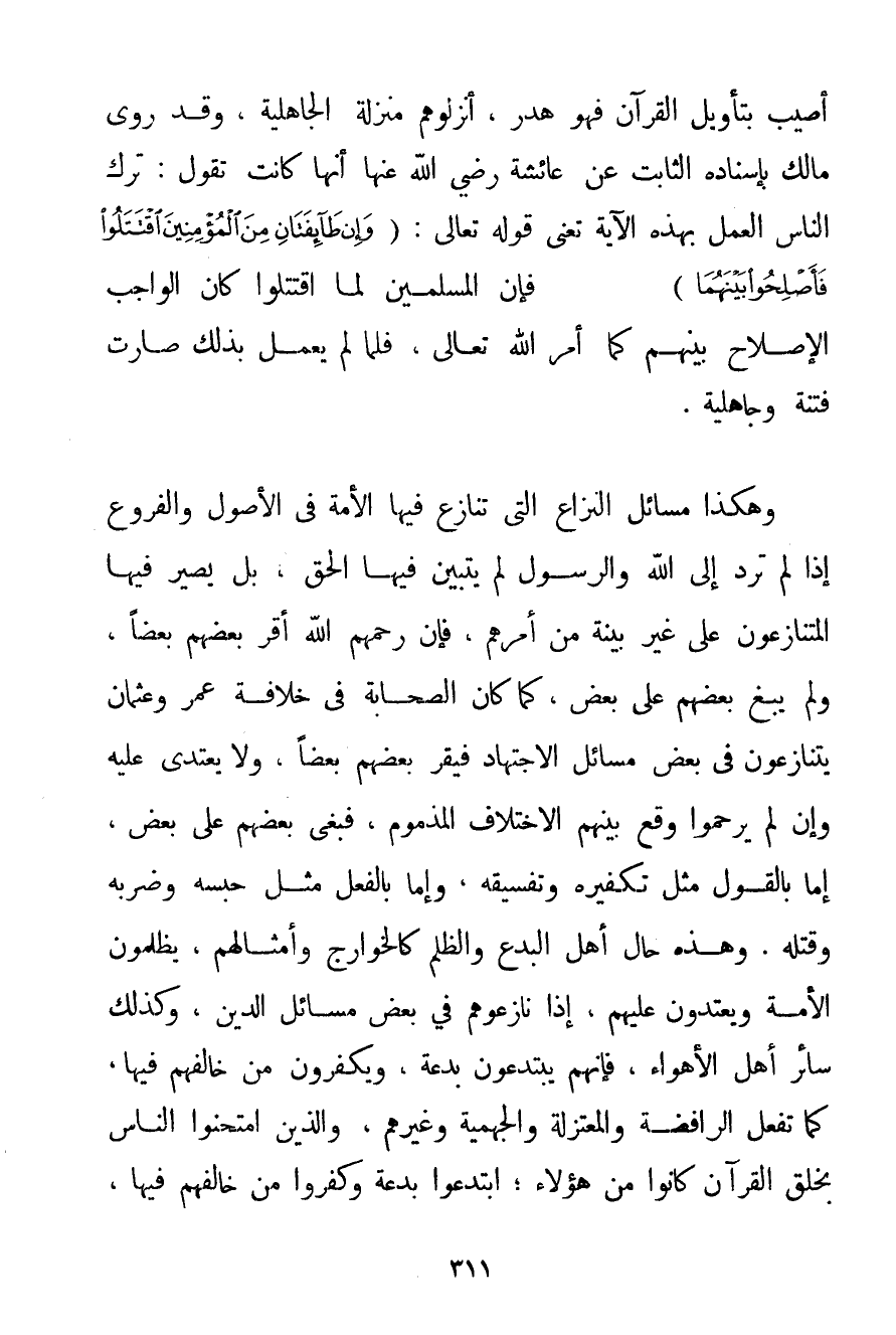 أُصِيبَ بِتَأْوِيلِ الْقُرْآنِ فَهُوَ هَدْرٌ أَنْزَلُوهُمْ مَنْزِلَةَ الْجَاهِلِيَّةِ وَقَدْ رَوَى مَالِكٌ بِإِسْنَادِهِ الثَّابِتِ عَنْ عَائِشَةَ رَضِيَ اللَّهُ عَنْهَا أَنَّهَا كَانَتْ تَقُولُ: تَرَكَ النَّاسُ الْعَمَلَ بِهَذِهِ الْآيَةِ تَعْنِي قَوْلَهُ تَعَالَى: {وَإِنْ طَائِفَتَانِ مِنَ الْمُؤْمِنِينَ اقْتَتَلُوا فَأَصْلِحُوا بَيْنَهُمَا} فَإِنَّ الْمُسْلِمِينَ لَمَّا اقْتَتَلُوا كَانَ الْوَاجِبُ الْإِصْلَاحَ بَيْنَهُمْ كَمَا أَمَرَ اللَّهُ تَعَالَى فَلَمَّا لَمْ يُعْمَلْ بِذَلِكَ صَارَتْ فِتْنَةٌ وَجَاهِلِيَّةٌ. وَهَكَذَا مَسَائِلُ النِّزَاعِ الَّتِي تَنَازَعَ فِيهَا الْأُمَّةُ فِي الْأُصُولِ وَالْفُرُوعِ إذَا لَمْ تُرَدَّ إلَى اللَّهِ وَالرَّسُولِ لَمْ يُتَبَيَّنْ فِيهَا الْحَقُّ بَلْ يَصِيرُ فِيهَا الْمُتَنَازِعُونَ عَلَى غَيْرِ بَيِّنَةٍ مِنْ أَمْرِهِمْ فَإِنْ رَحِمَهُمْ اللَّهُ أَقَرَّ بَعْضُهُمْ بَعْضًا وَلَمْ يَبْغِ بَعْضُهُمْ عَلَى بَعْضٍ كَمَا كَانَ الصَّحَابَةُ فِي خِلَافَةِ عُمَرَ وَعُثْمَانَ يَتَنَازَعُونَ فِي بَعْضِ مَسَائِلِ الِاجْتِهَادِ فَيُقِرُّ بَعْضُهُمْ بَعْضًا وَلَا يَعْتَدِي عَلَيْهِ وَإِنْ لَمْ يَرْحَمُوا وَقَعَ بَيْنَهُمْ الِاخْتِلَافُ الْمَذْمُومُ فَبَغَى بَعْضُهُمْ عَلَى بَعْضٍ إمَّا بِالْقَوْلِ مِثْلَ تَكْفِيرِهِ وَتَفْسِيقِهِ " وَإِمَّا بِالْفِعْلِ مِثْلَ حَبْسِهِ وَضَرْبِهِ وَقَتْلِهِ. وَهَذِهِ حَالُ أَهْلِ الْبِدَعِ وَالظُّلْمِ كَالْخَوَارِجِ وَأَمْثَالِهِمْ يَظْلِمُونَ الْأُمَّةَ وَيَعْتَدُونَ عَلَيْهِمْ إذَا نَازَعُوهُمْ فِي بَعْضِ مَسَائِلِ الدِّينِ وَكَذَلِكَ سَائِرُ أَهْلِ الْأَهْوَاءِ فَإِنَّهُمْ يَبْتَدِعُونَ بِدْعَةً وَيُكَفِّرُونَ مَنْ خَالَفَهُمْ فِيهَا كَمَا تَفْعَلُ الرَّافِضَةُ وَالْمُعْتَزِلَةُ وَالْجَهْمِيَّة وَغَيْرُهُمْ وَاَلَّذِينَ امْتَحَنُوا النَّاسَ بِخَلْقِ الْقُرْآنِ كَانُوا مِنْ هَؤُلَاءِ؛ ابْتَدَعُوا بِدْعَةً وَكَفَّرُوا مَنْ خَالَفَهُمْ فِيهَا