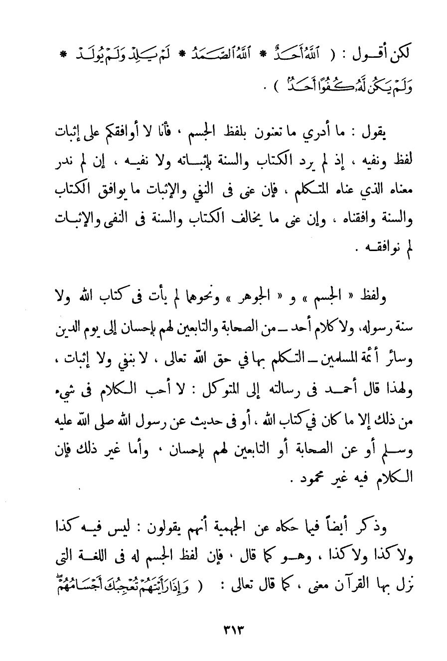 لَكِنْ أَقُولُ: {اللَّهِ أَحَدٌ} {اللَّهُ الصَّمَدُ} {لَمْ يَلِدْ وَلَمْ يُولَدْ} {وَلَمْ يَكُنْ لَهُ كُفُوًا أَحَدٌ} . يَقُولُ: مَا أَدْرِي مَا تَعْنُونَ بِلَفْظِ الْجِسْمِ فَأَنَا لَا أُوَافِقُكُمْ عَلَى إثْبَاتِ لَفْظٍ وَنَفْيِهِ إذْ لَمْ يَرِدُ الْكِتَابُ وَالسُّنَّةُ بِإِثْبَاتِهِ وَلَا نَفْيِهِ إنْ لَمْ نَدْرِ مَعْنَاهُ الَّذِي عَنَاهُ الْمُتَكَلِّمُ فَإِنْ عَنَى فِي النَّفْيِ وَالْإِثْبَاتِ مَا يُوَافِقُ الْكِتَابَ وَالسُّنَّةَ وَافَقْنَاهُ وَإِنْ عَنَى مَا يُخَالِفُ الْكِتَابَ وَالسُّنَّةَ فِي النَّفْيِ وَالْإِثْبَاتِ لَمْ نُوَافِقْهُ. وَلَفْظُ " الْجِسْمِ " و " الْجَوْهَرِ " وَنَحْوِهِمَا لَمْ يَأْتِ فِي كِتَابِ اللَّهِ وَلَا سُنَّةِ رَسُولِهِ وَلَا كَلَامِ أَحَدٍ - مِنْ الصَّحَابَةِ وَالتَّابِعِينَ لَهُمْ بِإِحْسَانٍ إلَى يَوْمِ الدِّينِ وَسَائِرِ أَئِمَّةِ الْمُسْلِمِينَ - التَّكَلُّمُ بِهَا فِي حَقِّ اللَّهِ تَعَالَى لَا بِنَفْيِ وَلَا إثْبَاتٍ وَلِهَذَا قَالَ أَحْمَد فِي رِسَالَتِهِ إلَى الْمُتَوَكِّلِ: لَا أُحِبُّ الْكَلَامَ فِي شَيْءٍ مِنْ ذَلِكَ إلَّا مَا كَانَ فِي كِتَابِ اللَّهِ أَوْ فِي حَدِيثٍ عَنْ رَسُولِ اللَّهِ صَلَّى اللَّهُ عَلَيْهِ وَسَلَّمَ أَوْ عَنْ الصَّحَابَةِ أَوْ التَّابِعِينَ لَهُمْ بِإِحْسَانِ وَأَمَّا غَيْرُ ذَلِكَ فَإِنَّ الْكَلَامَ فِيهِ غَيْرُ مَحْمُودٍ. وَذَكَرَ أَيْضًا فِيمَا حَكَاهُ عَنْ الْجَهْمِيَّة أَنَّهُمْ يَقُولُونَ: لَيْسَ فِيهِ كَذَا وَلَا كَذَا وَلَا كَذَا وَهُوَ كَمَا قَالَ فَإِنَّ لَفْظَ الْجِسْمِ لَهُ فِي اللُّغَةِ الَّتِي نَزَلَ بِهَا الْقُرْآنُ مَعْنًى كَمَا قَالَ تَعَالَى: {وَإِذَا رَأَيْتَهُمْ تُعْجِبُكَ أَجْسَامُهُمْ
