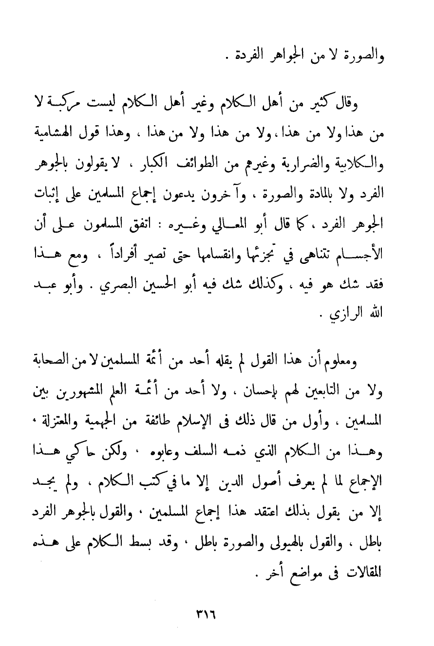 وَالصُّورَةِ لَا مِنْ الْجَوَاهِرِ الْفَرْدَةِ. وَقَالَ كَثِيرٌ مِنْ أَهْلِ الْكَلَامِ وَغَيْرِ أَهْلِ الْكَلَامِ لَيْسَتْ مُرَكَّبَةً لَا مِنْ هَذَا وَلَا مِنْ هَذَا وَلَا مِنْ هَذَا وَلَا مِنْ هَذَا وَهَذَا قَوْلُ الهشامية والْكُلَّابِيَة والضرارية وَغَيْرِهِمْ مِنْ الطَّوَائِفِ الْكِبَارِ لَا يَقُولُونَ بِالْجَوْهَرِ الْفَرْدِ وَلَا بِالْمَادَّةِ وَالصُّورَةِ وَآخَرُونَ يَدَّعُونَ إجْمَاعَ الْمُسْلِمِينَ عَلَى إثْبَاتِ الْجَوْهَرِ الْفَرْدِ كَمَا قَالَ أَبُو الْمَعَالِي وَغَيْرُهُ: اتَّفَقَ الْمُسْلِمُونَ عَلَى أَنَّ الْأَجْسَامَ تَتَنَاهَى فِي تَجَزُّئِهَا وَانْقِسَامِهَا حَتَّى تَصِيرَ أَفْرَادًا وَمَعَ هَذَا فَقَدْ شَكَّ هُوَ فِيهِ وَكَذَلِكَ شَكَّ فِيهِ أَبُو الْحُسَيْنِ الْبَصْرِيُّ. وَأَبُو عَبْدِ اللَّهِ الرَّازِي. وَمَعْلُومٌ أَنَّ هَذَا الْقَوْلَ لَمْ يَقُلْهُ أَحَدٌ مِنْ أَئِمَّةِ الْمُسْلِمِينَ لَا مِنْ الصَّحَابَةِ وَلَا مِنْ التَّابِعِينَ لَهُمْ بِإِحْسَانِ وَلَا أَحَدٌ مِنْ أَئِمَّةِ الْعِلْمِ الْمَشْهُورِينَ بَيْنَ الْمُسْلِمِينَ وَأَوَّلُ مَنْ قَالَ ذَلِكَ فِي الْإِسْلَامِ طَائِفَةٌ مِنْ الْجَهْمِيَّة وَالْمُعْتَزِلَةِ وَهَذَا مِنْ الْكَلَامِ الَّذِي ذَمَّهُ السَّلَفُ وَعَابُوهُ وَلَكِنَّ حَاكِيَ هَذَا الْإِجْمَاعِ لَمَّا لَمْ يَعْرِفُ أُصُولَ الدِّينِ إلَّا مَا فِي كُتُبِ الْكَلَامِ وَلَمْ يَجِدْ إلَّا مَنْ يَقُولُ بِذَلِكَ اعْتَقَدَ هَذَا إجْمَاعَ الْمُسْلِمِينَ وَالْقَوْلُ بِالْجَوْهَرِ الْفَرْدِ بَاطِلٌ وَالْقَوْلُ بِالْهَيُولَى وَالصُّورَةِ بَاطِلٌ وَقَدْ بُسِطَ الْكَلَامُ عَلَى هَذِهِ الْمَقَالَاتِ فِي مَوَاضِعَ أُخَرٍ.