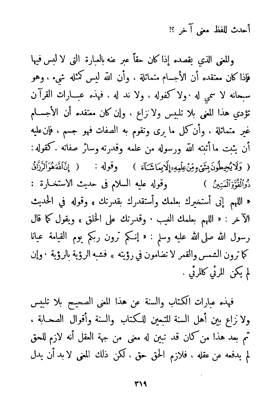 أَحْدَثَ لِلَّفْظِ مَعْنًى آخَرَ وَالْمَعْنَى الَّذِي يَقْصِدُهُ إذَا كَانَ حَقًّا عُبِّرَ عَنْهُ بِالْعِبَارَةِ الَّتِي لَا لَبْسَ فِيهَا فَإِذَا كَانَ مُعْتَقَدُهُ أَنَّ الْأَجْسَامَ مُتَمَاثِلَةٌ وَأَنَّ اللَّهَ لَيْسَ كَمِثْلِهِ شَيْءٌ وَهُوَ سُبْحَانَهُ لَا سَمِيَّ لَهُ وَلَا كُفُوَ لَهُ وَلَا نِدَّ لَهُ فَهَذِهِ عِبَارَاتُ الْقُرْآنِ تُؤَدِّي هَذَا الْمَعْنَى بِلَا تَلْبِيسٍ وَلَا نِزَاعَ وَإِنْ كَانَ مُعْتَقَدُهُ أَنَّ الْأَجْسَامَ غَيْرُ مُتَمَاثِلَةٍ وَأَنَّ كُلَّ مَا يُرَى وَتَقُومُ بِهِ الصِّفَاتُ فَهُوَ جِسْمٌ فَإِنَّ عَلَيْهِ أَنْ يُثْبِتَ مَا أَثْبَتّه اللَّهُ وَرَسُولُهُ مِنْ عِلْمِهِ وَقُدْرَتِهِ وَسَائِرِ صِفَاتِهِ. كَقَوْلِهِ: {وَلَا يُحِيطُونَ بِشَيْءٍ مِنْ عِلْمِهِ إلَّا بِمَا شَاءَ} وَقَوْلِهِ: {إنَّ اللَّهَ هُوَ الرَّزَّاقُ ذُو الْقُوَّةِ الْمَتِينُ} وَقَوْلِهِ عَلَيْهِ السَّلَامُ فِي حَدِيثِ الِاسْتِخَارَةِ: " {اللَّهُمَّ إنِّي أَسَتَخِيرُك بِعِلْمِك وَأَسْتَقْدِرُك بِقُدْرَتِك} " وَقَوْلِهِ فِي الْحَدِيثِ الْآخَرِ: " {اللَّهُمَّ بِعِلْمِك الْغَيْبَ وَقُدْرَتِك عَلَى الْخَلْقِ} " وَيَقُولُ كَمَا قَالَ رَسُولُ اللَّهِ صَلَّى اللَّهُ عَلَيْهِ وَسَلَّمَ " {إنَّكُمْ تَرَوْنَ رَبَّكُمْ يَوْمَ الْقِيَامَةِ عِيَانًا كَمَا تَرَوْنَ الشَّمْسَ وَالْقَمَرَ لَا تضامون فِي رُؤْيَتِهِ} " فَشَبَّهَ الرُّؤْيَةَ بِالرُّؤْيَةِ وَإِنْ لَمْ يَكُنْ الْمَرْئِيُّ كَالْمَرْئِيِّ. فَهَذِهِ عِبَارَاتُ الْكِتَابِ وَالسُّنَّةِ عَنْ هَذَا الْمَعْنَى الصَّحِيحِ بِلَا تَلْبِيسٍ وَلَا نِزَاعٍ بَيْنَ أَهْلِ السُّنَّةِ الْمُتَّبِعِينَ لِلْكِتَابِ وَالسُّنَّةِ وَأَقْوَالِ الصَّحَابَةِ ثُمَّ بَعْدَ هَذَا مَنْ كَانَ قَدْ تَبَيَّنَ لَهُ مَعْنًى مِنْ جِهَةِ الْعَقْلِ أَنَّهُ لَازِمٌ لِلْحَقِّ لَمْ يَدْفَعْهُ عَنْ عَقْلِهِ فَلَازِمُ الْحَقِّ حَقٌّ لَكِنَّ ذَلِكَ الْمَعْنَى لَا بُدَّ أَنْ يَدُلَّ
