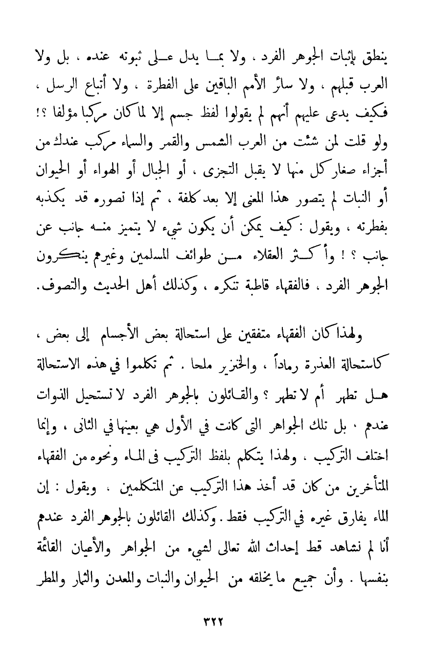 بِإِحْسَانٍ لَمْ يَنْطِقُ بِإِثْبَاتِ الْجَوْهَرِ الْفَرْدِ وَلَا بِمَا يَدُلُّ عَلَى ثُبُوتِهِ عِنْدَهُ بَلْ وَلَا الْعَرَبُ قَبْلَهُمْ وَلَا سَائِرُ الْأُمَمِ الْبَاقِينَ عَلَى الْفِطْرَةِ وَلَا أَتْبَاعُ الرُّسُلِ فَكَيْفَ يُدَعَّى عَلَيْهِمْ أَنَّهُمْ لَمْ يَقُولُوا لَفْظَ جِسْمٍ إلَّا لِمَا كَانَ مُرَكَّبًا مُؤَلَّفًا وَلَوْ قُلْت لِمَنْ شِئْت مِنْ الْعَرَبِ الشَّمْسُ وَالْقَمَرُ وَالسَّمَاءُ مُرَكَّبٌ عِنْدَك مِنْ أَجْزَاءٍ صِغَارٍ كُلٌّ مِنْهَا لَا يَقْبَلُ التجزي أَوْ الْجِبَالُ أَوْ الْهَوَاءُ أَوْ الْحَيَوَانُ أَوْ النَّبَاتُ لَمْ يَتَصَوَّرْ هَذَا الْمَعْنَى إلَّا بَعْدَ كُلْفَةٍ ثُمَّ إذَا تَصَوَّرَهُ قَدْ يُكَذِّبُهُ بِفِطْرَتِهِ وَيَقُولُ: كَيْفَ يُمْكِنُ أَنْ يَكُونَ شَيْءٌ لَا يَتَمَيَّزُ مِنْهُ جَانِبٌ عَنْ جَانِبٍ وَأَكْثَرُ الْعُقَلَاءِ مِنْ طَوَائِفِ الْمُسْلِمِينَ وَغَيْرِهِمْ يُنْكِرُونَ الْجَوْهَرَ الْفَرْدَ فَالْفُقَهَاءُ قَاطِبَةً تُنْكِرُهُ وَكَذَلِكَ أَهْلُ الْحَدِيثِ وَالتَّصَوُّفِ. وَلِهَذَا كَانَ الْفُقَهَاءُ مُتَّفِقِينَ عَلَى اسْتِحَالَةِ بَعْضِ الْأَجْسَامِ إلَى بَعْضٍ كَاسْتِحَالَةِ الْعَذِرَةِ رَمَادًا وَالْخِنْزِيرِ مِلْحًا. ثُمَّ تَكَلَّمُوا فِي هَذِهِ الِاسْتِحَالَةِ هَلْ تَطْهُرُ أَمْ لَا تَطْهُرُ؟ وَالْقَائِلُونَ بِالْجَوْهَرِ الْفَرْدِ لَا تَسْتَحِيلُ الذَّوَاتُ عِنْدَهُمْ بَلْ تِلْكَ الْجَوَاهِرُ الَّتِي كَانَتْ فِي الْأَوَّلِ هِيَ بِعَيْنِهَا فِي الثَّانِي وَإِنَّمَا اخْتَلَفَ التَّرْكِيب وَلِهَذَا يَتَكَلَّمُ بِلَفْظِ التَّرْكِيبِ فِي الْمَاءِ وَنَحْوِهِ مِنْ الْفُقَهَاءِ الْمُتَأَخِّرِينَ مَنْ كَانَ قَدْ أَخَذَ هَذَا التَّرْكِيبَ عَنْ الْمُتَكَلِّمِينَ وَيَقُولُ: إنَّ الْمَاءَ يُفَارِقُ غَيْرَهُ فِي التَّرْكِيبِ فَقَطْ. وَكَذَلِكَ الْقَائِلُونَ بِالْجَوْهَرِ الْفَرْدِ عِنْدَهُمْ إنَّا لَمْ نُشَاهِدْ قَطُّ إحْدَاثَ اللَّهِ تَعَالَى لِشَيْءٍ مِنْ الْجَوَاهِرِ وَالْأَعْيَانِ الْقَائِمَةِ بِنَفْسِهَا. وَأَنَّ جَمِيعَ مَا يَخْلُقُهُ مِنْ الْحَيَوَانِ وَالنَّبَاتِ وَالْمَعْدِنِ وَالثِّمَارِ وَالْمَطَرِ