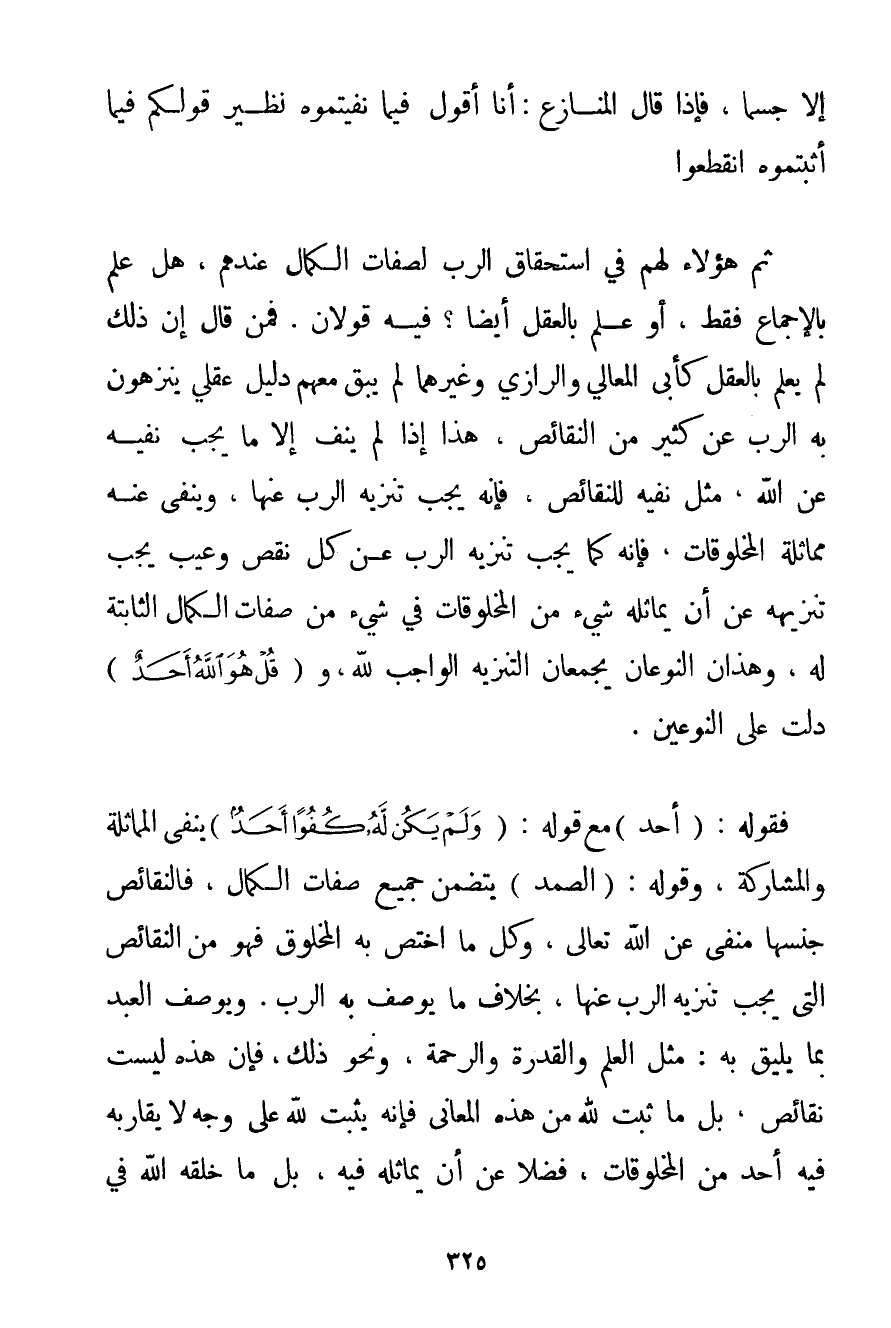 إلَّا جِسْمًا فَإِذَا قَالَ الْمُنَازِعُ: أَنَا أَقُولُ فِيمَا نَفَيْتُمُوهُ نَظِيرَ قَوْلِهِمْ فِيمَا أَثْبَتُّمُوهُ انْقَطَعُوا. ثُمَّ هَؤُلَاءِ لَهُمْ فِي اسْتِحْقَاقِ الرَّبِّ لِصِفَاتِ الْكَمَالِ عِنْدَهُمْ هَلْ عُلِمَ بِالْإِجْمَاعِ فَقَطْ أَوْ عُلِمَ بِالْعَقْلِ أَيْضًا؟ فِيهِ قَوْلَانِ. فَمَنْ قَالَ إنَّ ذَلِكَ لَمْ يُعْلَمْ بِالْعَقْلِ كَأَبِي الْمَعَالِي وَالرَّازِي وَغَيْرِهِمَا لَمْ يَبْقَ مَعَهُمْ دَلِيلٌ عَقْلِيٌّ يُنَزِّهُونَ بِهِ الرَّبَّ عَنْ كَثِيرٍ مِنْ النَّقَائِصِ هَذَا إذَا لَمْ يَنْفِ إلَّا مَا يَجِبُ نَفْيُهُ عَنْ اللَّهِ مِثْلُ نَفْيِهِ لِلنَّقَائِصِ فَإِنَّهُ يَجِبُ تَنْزِيهُ الرَّبِّ عَنْهَا وَيَنْفِي عَنْهُ مُمَاثَلَةَ الْمَخْلُوقَاتِ فَإِنَّهُ كَمَا يَجِبُ تَنْزِيهُ الرَّبِّ عَنْ كُلِّ نَقْصٍ وَعَيْبٍ يَجِبُ تَنْزِيهُهُ عَنْ أَنْ يُمَاثِلَهُ شَيْءٌ مِنْ الْمَخْلُوقَاتِ فِي شَيْءٍ مِنْ صِفَاتِ الْكَمَالِ الثَّابِتَةِ لَهُ وَهَذَانِ النَّوْعَانِ يَجْمَعَانِ التَّنْزِيهَ الْوَاجِبَ لِلَّهِ و {قُلْ هُوَ اللَّهُ أَحَدٌ} دَلَّتْ عَلَى النَّوْعَيْنِ. فَقَوْلُهُ: أَحَدٌ مَعَ قَوْلِهِ: {وَلَمْ يَكُنْ لَهُ كُفُوًا أَحَدٌ} يَنْفِي الْمُمَاثَلَةَ وَالْمُشَارَكَةَ وَقَوْلُهُ الصَّمَدُ يَتَضَمَّنُ جَمِيعَ صِفَاتِ الْكَمَالِ فَالنَّقَائِصُ جِنْسُهَا مَنْفِيٌّ عَنْ اللَّهِ تَعَالَى وَكُلُّ مَا اخْتَصَّ بِهِ الْمَخْلُوقُ فَهُوَ مِنْ النَّقَائِصِ الَّتِي يَجِبُ تَنْزِيهُ الرَّبِّ عَنْهَا بِخِلَافِ مَا يُوصَفُ بِهِ الرَّبُّ. وَيُوصَفُ الْعَبْدُ بِمَا يَلِيقُ بِهِ: مِثْلُ الْعِلْمِ وَالْقُدْرَةِ وَالرَّحْمَةِ وَنَحْوِ ذَلِكَ فَإِنَّ هَذِهِ لَيْسَتْ نَقَائِصَ بَلْ مَا ثَبَتَ لِلَّهِ مِنْ هَذِهِ الْمَعَانِي فَإِنَّهُ يَثْبُتُ لِلَّهِ عَلَى وَجْهٍ لَا يُقَارِبُهُ فِيهِ أَحَدٌ مِنْ الْمَخْلُوقَاتِ فَضْلًا عَنْ أَنْ يُمَاثِلَهُ فِيهِ بَلْ مَا خَلَقَهُ اللَّهُ فِي