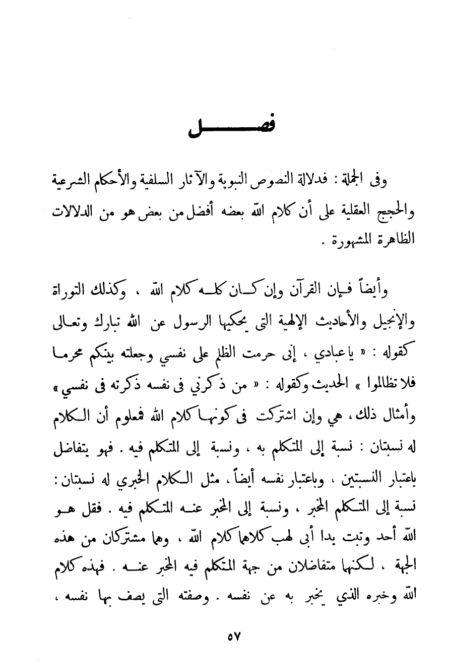 وَفِي الْجُمْلَةِ فَدَلَالَةُ النُّصُوصِ النَّبَوِيَّةِ وَالْآثَارِ السَّلَفِيَّةِ وَالْأَحْكَامِ الشَّرْعِيَّةِ وَالْحِجَجِ الْعَقْلِيَّةِ عَلَى أَنَّ كَلَامَ اللَّهِ بَعْضُهُ أَفْضَلُ مِنْ بَعْضٍ هُوَ مِنْ الدَّلَالَاتِ الظَّاهِرَةِ الْمَشْهُورَةِ. وَأَيْضًا فَإِنَّ الْقُرْآنَ وَإِنْ كَانَ كُلُّهُ كَلَامَ اللَّهِ وَكَذَلِكَ التَّوْرَاةُ وَالْإِنْجِيلُ وَالْأَحَادِيثُ الْإِلَهِيَّةُ الَّتِي يَحْكِيهَا الرَّسُولُ عَنْ اللَّهِ تَبَارَكَ وَتَعَالَى كَقَوْلِهِ: {يَا عِبَادِي إنِّي حَرَّمْت الظُّلْمَ عَلَى نَفْسِي وَجَعَلْته بَيْنَكُمْ مُحَرَّمًا فَلَا تَظَالَمُوا} الْحَدِيثَ وَكَقَوْلِهِ: {مَنْ ذَكَرَنِي فِي نَفْسِهِ ذَكَرْته فِي نَفْسِي} وَأَمْثَالُ ذَلِكَ هِيَ وَإِنْ اشْتَرَكَتْ فِي كَوْنِهَا كَلَامَ اللَّهِ فَمَعْلُومٌ أَنَّ الْكَلَامَ لَهُ نِسْبَتَانِ: نِسْبَةٌ إلَى الْمُتَكَلِّمِ بِهِ وَنِسْبَةٌ إلَى الْمُتَكَلَّمِ فِيهِ. فَهُوَ يَتَفَاضَلُ بِاعْتِبَارِ النِّسْبَتَيْنِ وَبِاعْتِبَارِ نَفْسِهِ أَيْضًا مِثْلَ الْكَلَامِ الْخَبَرِيِّ لَهُ نِسْبَتَانِ: نِسْبَةٌ إلَى الْمُتَكَلِّمِ الْمُخْبِرِ وَنِسْبَةٌ إلَى الْمَخْبَرِ عَنْهُ الْمُتَكَلَّمِ فِيهِ. ف {قُلْ هُوَ اللَّهُ أَحَدٌ} وَ {تَبَّتْ يَدَا أَبِي لَهَبٍ} كِلَاهُمَا كَلَامُ اللَّهِ وَهُمَا مُشْتَرِكَانِ مِنْ هَذِهِ الْجِهَةِ لَكِنَّهُمَا مُتَفَاضِلَانِ مِنْ جِهَةِ الْمُتَكَلِّمِ فِيهِ الْمُخْبِرِ عَنْهُ. فَهَذِهِ كَلَامُ اللَّهِ وَخَبَرُهُ الَّذِي يُخْبِرُ بِهِ عَنْ نَفْسِهِ وَصِفَتِهِ الَّتِي يَصِفُ بِهَا نَفْسَهُ
