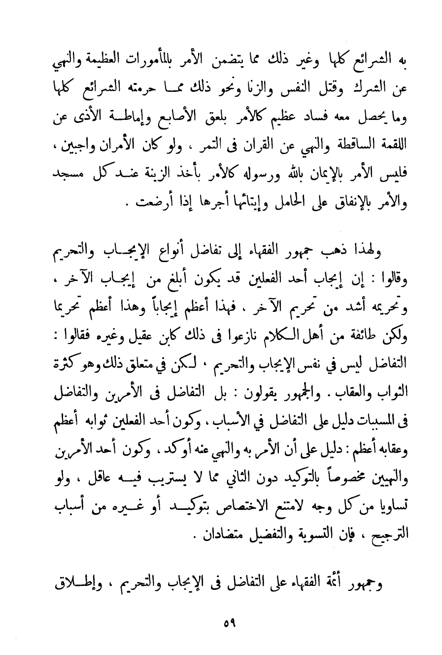 وَلِهَذَا ذَهَبَ جُمْهُورُ الْفُقَهَاءِ إلَى تَفَاضُلِ أَنْوَاعِ الْإِيجَابِ وَالتَّحْرِيمِ وَقَالُوا: إنَّ إيجَابَ أَحَدِ الْفِعْلَيْنِ قَدْ يَكُونُ أَبْلَغَ مِنْ إيجَابِ الْآخَرِ وَتَحْرِيمُهُ أَشَدُّ مِنْ تَحْرِيمِ الْآخَرِ فَهَذَا أَعْظَمُ إيجَابًا وَهَذَا أَعْظَمُ تَحْرِيمًا وَلَكِنْ طَائِفَةٌ مِنْ أَهْلِ الْكَلَامِ نَازَعُوا فِي ذَلِكَ كَابْنِ عَقِيلٍ وَغَيْرِهِ فَقَالُوا: التَّفَاضُلُ لَيْسَ فِي نَفْسِ الْإِيجَابِ وَالتَّحْرِيمِ لَكِنْ فِي مُتَعَلَّقِ ذَلِكَ وَهُوَ كَثْرَةُ الثَّوَابِ وَالْعِقَابِ. وَالْجُمْهُورُ يَقُولُونَ: بَلْ التَّفَاضُلُ فِي الْأَمْرَيْنِ وَالتَّفَاضُلُ فِي الْمُسَبِّبَاتِ دَلِيلٌ عَلَى التَّفَاضُلِ فِي الْأَسْبَابِ وَكَوْنُ أَحَدِ الْفِعْلَيْنِ ثَوَابُهُ أَعْظَمُ وَعِقَابُهُ أَعْظَمُ: دَلِيلٌ عَلَى أَنَّ الْأَمْرَ بِهِ وَالنَّهْيَ عَنْهُ أَوْكَدُ وَكَوْنُ أَحَدِ الْأَمْرَيْنِ وَالنَّهْيَيْنِ مَخْصُوصًا بِالتَّوْكِيدِ دُونَ الثَّانِي مِمَّا لَا يَسْتَرِيبُ فِيهِ عَاقِلٌ وَلَوْ تَسَاوَيَا مِنْ كُلِّ وَجْهٍ لَامْتَنَعَ الِاخْتِصَاصُ بِتَوْكِيدِ أَوْ غَيْرِهِ مِنْ أَسْبَابِ التَّرْجِيحِ فَإِنَّ التَّسْوِيَةَ وَالتَّفْضِيلَ مُتَضَادَّانِ. وَجُمْهُورُ أَئِمَّةِ الْفُقَهَاءِ عَلَى التَّفَاضُلِ فِي الْإِيجَابِ وَالتَّحْرِيمِ وَإِطْلَاقُ