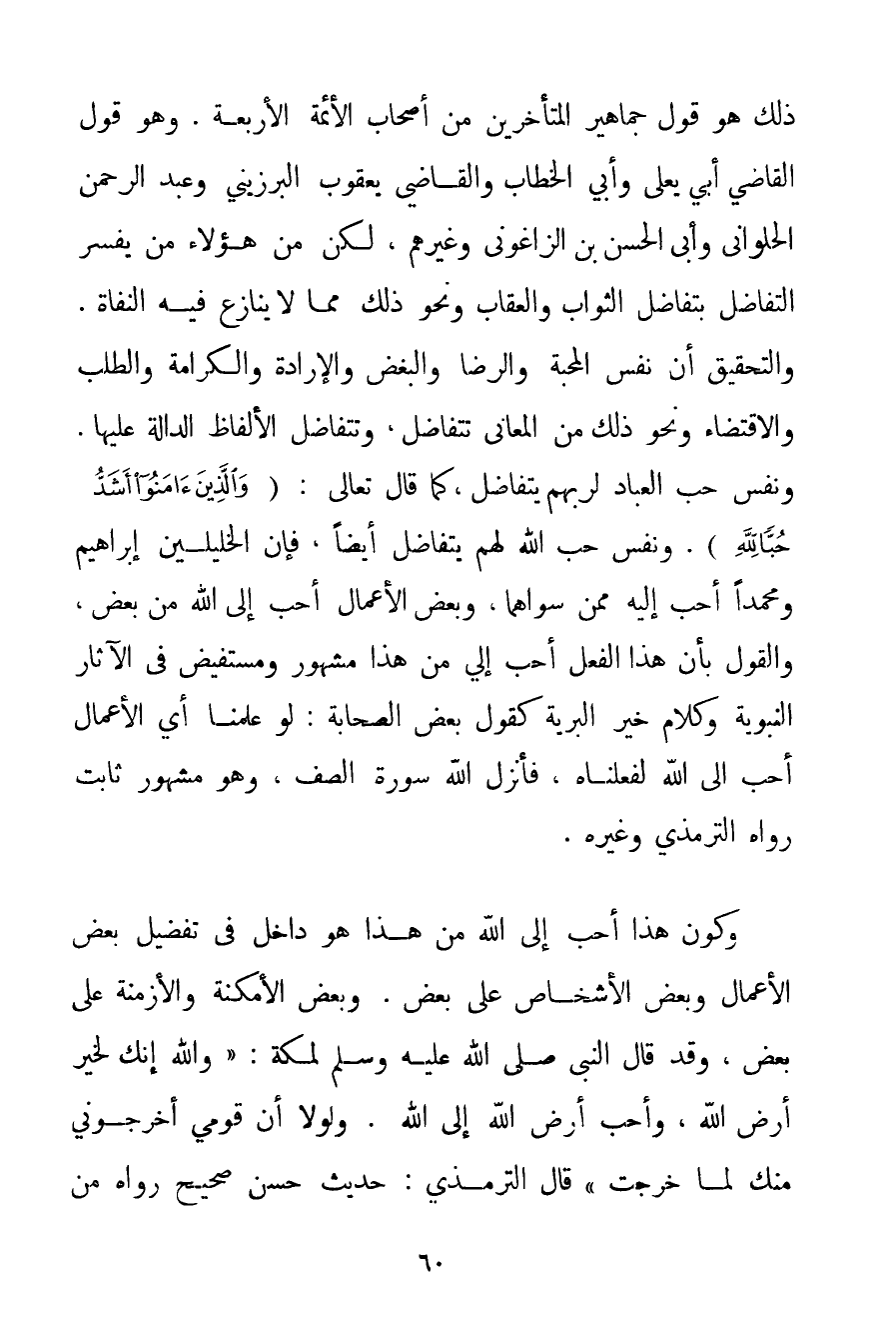 ذَلِكَ هُوَ قَوْلُ جَمَاهِيرِ الْمُتَأَخِّرِينَ مِنْ أَصْحَابِ الْأَئِمَّةِ الْأَرْبَعَةِ. وَهُوَ قَوْلُ الْقَاضِي أَبِي يَعْلَى وَأَبِي الْخَطَّابِ وَالْقَاضِي يَعْقُوبَ البرزبيني وَعَبْدِ الرَّحْمَنِ الْحَلْوَانِيِّ وأبي الْحَسَنِ بْنِ الزَّاغُونِي وَغَيْرِهِمْ لَكِنْ مِنْ هَؤُلَاءِ مَنْ يُفَسِّرُ التَّفَاضُلَ بِتَفَاضُلِ الثَّوَابِ وَالْعِقَابِ وَنَحْوِ ذَلِكَ مِمَّا لَا يُنَازِعُ فِيهِ الْنُّفَاةِ. وَالتَّحْقِيقُ أَنَّ نَفْسَ الْمَحَبَّةِ وَالرِّضَا وَالْبُغْضَ وَالْإِرَادَةَ وَالْكَرَامَةَ وَالطَّلَبَ وَالِاقْتِضَاءَ وَنَحْوَ ذَلِكَ مِنْ الْمَعَانِي تَتَفَاضَلُ وَتَتَفَاضَلُ الْأَلْفَاظُ الدَّالَّةُ عَلَيْهَا. وَنَفْسُ حُبِّ الْعِبَادِ لِرَبِّهِمْ يَتَفَاضَلُ كَمَا قَالَ تَعَالَى: {وَالَّذِينَ آمَنُوا أَشَدُّ حُبًّا لِلَّهِ} . وَنَفْسُ حُبِّ اللَّهِ لَهُمْ يَتَفَاضَلُ أَيْضًا فَإِنَّ الْخَلِيلَيْنِ إبْرَاهِيمَ وَمُحَمَّدًا أَحَبُّ إلَيْهِ مِمَّنْ سِوَاهُمَا وَبَعْضُ الْأَعْمَالِ أَحَبُّ إلَى اللَّهِ مِنْ بَعْضٍ وَالْقَوْلُ بِأَنَّ هَذَا الْفِعْلَ أَحَبُّ إلَيَّ مِنْ هَذَا مَشْهُورٌ وَمُسْتَفِيضٌ فِي الْآثَارِ النَّبَوِيَّةِ وَكَلَامِ خَيْرِ الْبَرِيَّةِ كَقَوْلِ بَعْضِ الصَّحَابَةِ: لَوْ عَلِمْنَا أَيَّ الْأَعْمَالِ أَحَبَّ إلَى اللَّهِ لَفَعَلْنَاهُ فَأَنْزَلَ اللَّهُ سُورَةَ الصَّفِّ وَهُوَ مَشْهُورٌ ثَابِتٌ رَوَاهُ التِّرْمِذِيُّ وَغَيْرُهُ. وَكَوْنُ هَذَا أَحَبَّ إلَى اللَّهِ مِنْ هَذَا هُوَ دَاخِلٌ فِي تَفْضِيلِ بَعْضِ الْأَعْمَالِ وَبَعْضِ الْأَشْخَاصِ عَلَى بَعْضٍ. وَبَعْضِ الْأَمْكِنَةِ وَالْأَزْمِنَةِ عَلَى بَعْضٍ وَقَدْ {قَالَ النَّبِيُّ صَلَّى اللَّهُ عَلَيْهِ وَسَلَّمَ لِمَكَّةَ: وَاَللَّهِ إنَّك لَخَيْرُ أَرْضِ اللَّهِ وَأَحَبُّ أَرْضِ اللَّهِ إلَى اللَّهِ. وَلَوْلَا أَنَّ قَوْمِي أَخْرَجُونِي مِنْك لَمَا خَرَجْت} قَالَ التِّرْمِذِيُّ: حَدِيثٌ حَسَنٌ صَحِيحٌ رَوَاهُ مِنْ