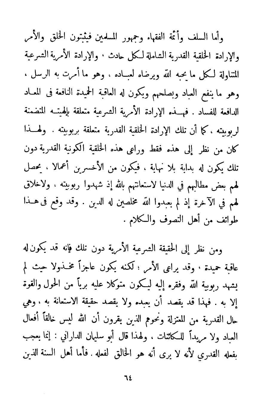 وَأَمَّا السَّلَفُ وَأَئِمَّةُ الْفُقَهَاءِ وَجُمْهُورُ الْمُسْلِمِينَ فَيُثْبِتُونَ الْخَلْقَ وَالْأَمْرَ وَالْإِرَادَةَ الْخِلْقِيَّةَ الْقَدَرِيَّةَ الشَّامِلَةَ لِكُلِّ حَادِثٍ وَالْإِرَادَةَ الْأَمْرِيَّةَ الشَّرْعِيَّةَ الْمُتَنَاوِلَةَ لِكُلِّ مَا يُحِبُّهُ اللَّهُ وَيَرْضَاهُ لِعِبَادِهِ وَهُوَ مَا أَمَرَتْ بِهِ الرُّسُلُ وَهُوَ مَا يَنْفَعُ الْعِبَادَ وَيُصْلِحُهُمْ وَيَكُونُ لَهُ الْعَاقِبَةُ الْحَمِيدَةُ النَّافِعَةُ فِي الْمَعَادِ الدَّافِعَةُ لِلْفَسَادِ. فَهَذِهِ الْإِرَادَةُ الْأَمْرِيَّةُ الشَّرْعِيَّةُ مُتَعَلِّقَةٌ بِإِلَهِيَّتِهِ الْمُتَضَمِّنَةُ لِرُبُوبِيَّتِهِ كَمَا أَنَّ تِلْكَ الْإِرَادَةَ الْخِلْقِيَّةَ الْقَدَرِيَّةَ مُتَعَلِّقَةٌ بِرُبُوبِيَّتِهِ. وَلِهَذَا كَانَ مَنْ نَظَرَ إلَى هَذِهِ فَقَطْ وَرَاعَى هَذِهِ الْخِلْقِيَّةَ الْكَوْنِيَّةَ الْقَدَرِيَّةَ دُونَ تِلْكَ يَكُونُ لَهُ بِدَايَةٌ بِلَا نِهَايَةٍ فَيَكُونُ مِنْ الْأَخْسَرِينَ أَعْمَالًا يَحْصُلُ لَهُمْ بَعْضُ مُطَالِبِهِمْ فِي الدُّنْيَا لِاسْتِعَانَتِهِمْ بِاَللَّهِ إذْ شَهِدُوا رُبُوبِيَّتَهُ وَلَا خَلَاقَ لَهُمْ فِي الْآخِرَةِ إذْ لَمْ يَعْبُدُوا اللَّهَ مُخْلِصِينَ لَهُ الدِّينَ. وَقَدْ وَقَعَ فِي هَذَا طَوَائِفُ مِنْ أَهْلِ التَّصَوُّفِ وَالْكَلَامِ. وَمَنْ نَظَرَ إلَى الْحَقِيقَةِ الشَّرْعِيَّةِ الْأَمْرِيَّةِ دُونَ تِلْكَ فَإِنَّهُ قَدْ يَكُونُ لَهُ عَاقِبَةٌ حَمِيدَةٌ وَقَدْ يُرَاعَى الْأَمْرُ؛ لَكِنَّهُ يَكُونُ عَاجِزًا مَخْذُولًا حَيْثُ لَمْ يَشْهَدْ رُبُوبِيَّةَ اللَّهِ وَفَقْرَهُ إلَيْهِ لِيَكُونَ مُتَوَكِّلًا عَلَيْهِ بَرِيًّا مِنْ الْحَوْلِ وَالْقُوَّةِ إلَّا بِهِ. فَهَذَا قَدْ يَقْصِدُ أَنْ يَعْبُدَهُ وَلَا يَقْصِدَ حَقِيقَةَ الِاسْتِعَانَةِ بِهِ وَهِيَ حَالُ الْقَدَرِيَّةِ مِنْ الْمُعْتَزِلَةِ وَنَحْوِهِمْ الَّذِينَ يُقِرُّونَ أَنَّ اللَّهَ لَيْسَ خَالِقًا أَفْعَالَ الْعِبَادِ وَلَا مُرِيدًا لِلْكَائِنَاتِ وَلِهَذَا قَالَ أَبُو سُلَيْمَانَ الداراني: إنَّمَا يَعْجَبُ بِفِعْلِهِ الْقَدَرِيِّ لِأَنَّهُ لَا يَرَى أَنَّهُ هُوَ الْخَالِقُ لِفِعْلِهِ. فَأَمَّا أَهْلُ السُّنَّةِ الَّذِينَ