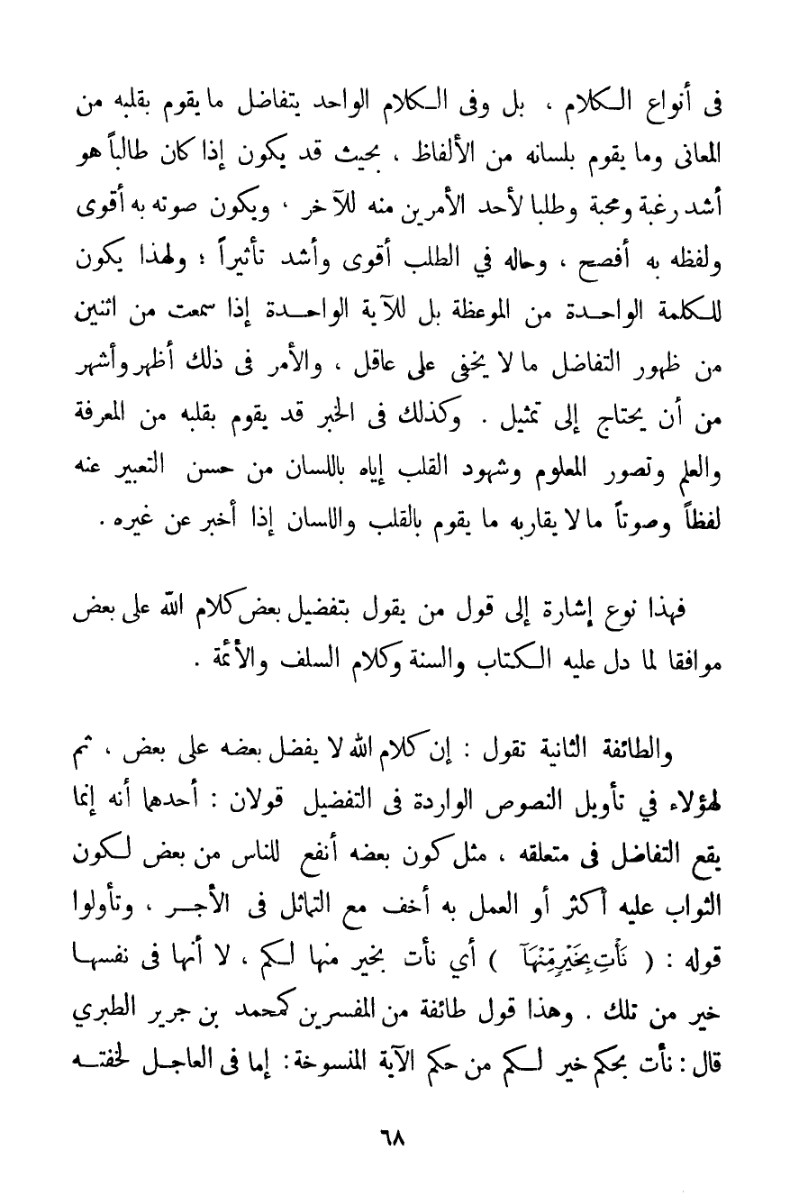 فِي أَنْوَاعِ الْكَلَامِ بَلْ وَفِي الْكَلَامِ الْوَاحِدِ يَتَفَاضَلُ مَا يَقُومُ بِقَلْبِهِ مِنْ الْمَعَانِي وَمَا يَقُومُ بِلِسَانِهِ مِنْ الْأَلْفَاظِ بِحَيْثُ قَدْ يَكُونُ إذَا كَانَ طَالِبًا هُوَ أَشَدُّ رَغْبَةً وَمَحَبَّةً وَطَلَبًا لِأَحَدِ الْأَمْرَيْنِ مِنْهُ لِلْآخَرِ وَيَكُونُ صَوْتُهُ بِهِ أَقْوَى وَلَفْظُهُ بِهِ أَفْصَحَ وَحَالُهُ فِي الطَّلَبِ أَقْوَى وَأَشَدُّ تَأْثِيرًا؛ وَلِهَذَا يَكُونُ لِلْكَلِمَةِ الْوَاحِدَةِ مِنْ الْمَوْعِظَةِ بَلْ لِلْآيَةِ الْوَاحِدَةِ إذَا سُمِعَتْ مِنْ اثْنَيْنِ مِنْ ظُهُورِ التَّفَاضُلِ مَا لَا يَخْفَى عَلَى عَاقِلٍ وَالْأَمْرُ فِي ذَلِكَ أَظْهَرُ وَأَشْهَرُ مِنْ أَنْ يَحْتَاجَ إلَى تَمْثِيلٍ. وَكَذَلِكَ فِي الْخَبَرِ قَدْ يَقُومُ بِقَلْبِهِ مِنْ الْمَعْرِفَةِ وَالْعِلْمِ وَتَصَوُّرِ الْمَعْلُومِ وَشُهُودِ الْقَلْبِ إيَّاهُ بِاللِّسَانِ مِنْ حُسْنِ التَّعْبِيرِ عَنْهُ لَفْظًا وَصَوْتًا مَا لَا يُقَارِبُهُ مَا يَقُومُ بِالْقَلْبِ وَاللِّسَانِ إذَا أَخْبَرَ عَنْ غَيْرِهِ. فَهَذَا نَوْعُ إشَارَةٍ إلَى قَوْلِ مَنْ يَقُولُ بِتَفْضِيلِ بَعْضِ كَلَامِ اللَّهِ عَلَى بَعْضٍ مُوَافِقًا لِمَا دَلَّ عَلَيْهِ الْكِتَابُ وَالسُّنَّةُ وَكَلَامُ السَّلَفِ وَالْأَئِمَّةُ. وَالطَّائِفَةُ الثَّانِيَةُ تَقُولُ: إنَّ كَلَامَ اللَّهِ لَا يُفَضَّلُ بَعْضُهُ عَلَى بَعْضٍ ثُمَّ لِهَؤُلَاءِ فِي تَأْوِيلِ النُّصُوصِ الْوَارِدَةِ فِي التَّفْضِيلِ قَوْلَانِ: أَحَدُهُمَا أَنَّهُ إنَّمَا يَقَعُ التَّفَاضُلُ فِي مُتَعَلَّقِهِ مِثْلَ كَوْنِ بَعْضِهِ أَنْفَعَ لِلنَّاسِ مِنْ بَعْضٍ لِكَوْنِ الثَّوَابِ عَلَيْهِ أَكْثَرَ أَوْ الْعَمَلِ بِهِ أَخَفَّ مَعَ التَّمَاثُلِ فِي الْأَجْرِ وَتَأَوَّلُوا قَوْلَهُ: {نَأْتِ بِخَيْرٍ مِنْهَا} أَيْ نَأْتِ بِخَيْرٍ مِنْهَا لَكُمْ لَا أَنَّهَا فِي نَفْسِهَا خَيْرٌ مِنْ تِلْكَ. وَهَذَا قَوْلُ طَائِفَةٍ مِنْ الْمُفَسِّرِينَ كَمُحَمَّدِ بْنِ جَرِيرٍ الطبري قَالَ. نَأْتِ بِحُكْمِ خَيْرٍ لَكُمْ مِنْ حُكْمِ الْآيَةِ الْمَنْسُوخَةِ: إمَّا فِي الْعَاجِلِ لِخِفَّتِهِ