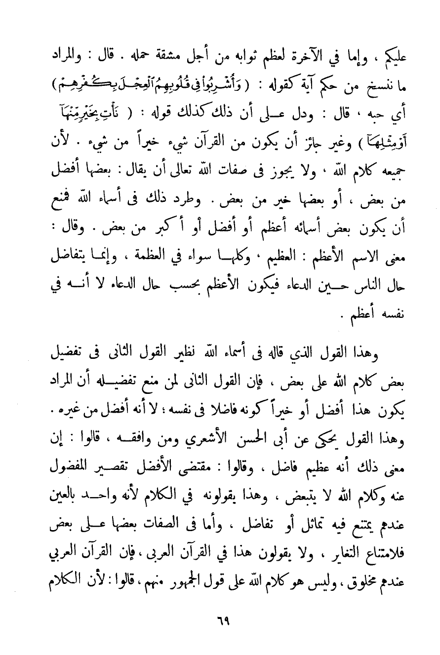 عَلَيْكُمْ وَإِمَّا فِي الْآخِرَةِ لِعِظَمِ ثَوَابِهِ مِنْ أَجْلِ مَشَقَّةِ حَمْلِهِ. قَالَ: وَالْمُرَادُ مَا نَنْسَخُ مِنْ حُكْمِ آيَةٍ كَقَوْلِهِ: {وَأُشْرِبُوا فِي قُلُوبِهِمُ الْعِجْلَ بِكُفْرِهِمْ} أَيْ حُبَّهُ قَالَ: وَدَلَّ عَلَى أَنَّ ذَلِكَ كَذَلِكَ قَوْلُهُ: {نَأْتِ بِخَيْرٍ مِنْهَا أَوْ مِثْلِهَا} وَغَيْرُ جَائِزٍ أَنْ يَكُونَ مِنْ الْقُرْآنِ شَيْءٌ خَيْرًا مِنْ شَيْءٍ. لِأَنَّ جَمِيعَهُ كَلَامُ اللَّهِ وَلَا يَجُوزُ فِي صِفَاتِ اللَّهِ تَعَالَى أَنْ يُقَالَ: بَعْضُهَا أَفْضَلُ مِنْ بَعْضٍ أَوْ بَعْضُهَا خَيْرٌ مِنْ بَعْضٍ. وَطَرْدُ ذَلِكَ فِي أَسْمَاءِ اللَّهِ فَمَنَعَ أَنْ يَكُونَ بَعْضُ أَسْمَائِهِ أَعْظَمَ أَوْ أَفْضَلَ أَوْ أَكْبَرَ مِنْ بَعْضٍ. وَقَالَ: مَعْنَى الِاسْمِ الْأَعْظَمِ: الْعَظِيمُ وَكُلُّهَا سَوَاءٌ فِي الْعَظَمَةِ وَإِنَّمَا يَتَفَاضَلُ حَالُ النَّاسِ حِينَ الدُّعَاءِ فَيَكُونُ الْأَعْظَمُ بِحَسَبِ حَالِ الدُّعَاءِ لَا أَنَّهُ فِي نَفْسِهِ أَعَظُمَ. وَهَذَا الْقَوْلُ الَّذِي قَالَهُ فِي أَسْمَاءِ اللَّهِ نَظِيرَ الْقَوْلِ الثَّانِي فِي تَفْضِيلِ بَعْضِ كَلَامِ اللَّهِ عَلَى بَعْضٍ فَإِنَّ الْقَوْلَ الثَّانِيَ لِمَنْ مَنَعَ تَفْضِيلَهُ أَنَّ الْمُرَادَ يَكُونُ هَذَا أَفْضَلَ أَوْ خَيْرًا كَوْنُهُ فَاضِلًا فِي نَفْسِهِ؛ لَا أَنَّهُ أَفْضَلُ مِنْ غَيْرِهِ. وَهَذَا الْقَوْلُ يُحْكَى عَنْ أَبِي الْحَسَنِ الْأَشْعَرِيِّ وَمَنْ وَافَقَهُ قَالُوا: إنَّ مَعْنَى ذَلِكَ أَنَّهُ عَظِيمٌ فَاضِلٌ وَقَالُوا: مُقْتَضَى الْأَفْضَلِ تَقْصِيرُ الْمَفْضُولِ عَنْهُ وَكَلَامُ اللَّهِ لَا يَتَبَعَّضُ وَهَذَا يَقُولُونَهُ فِي الْكَلَامِ لِأَنَّهُ وَاحِدٌ بِالْعَيْنِ عِنْدَهُمْ يَمْتَنِعُ فِيهِ تَمَاثُلُ أَوْ تَفَاضُلُ وَأَمَّا فِي الصِّفَاتِ بَعْضُهَا عَلَى بَعْضٍ فَلِامْتِنَاعِ التَّغَايُرِ وَلَا يَقُولُونَ هَذَا فِي الْقُرْآنِ الْعَرَبِيِّ فَإِنَّ الْقُرْآنَ الْعَرَبِيَّ عِنْدَهُمْ مَخْلُوقٌ وَلَيْسَ هُوَ كَلَامُ اللَّهِ عَلَى قَوْلِ الْجُمْهُورِ مِنْهُمْ قَالُوا: لِأَنَّ الْكَلَامَ