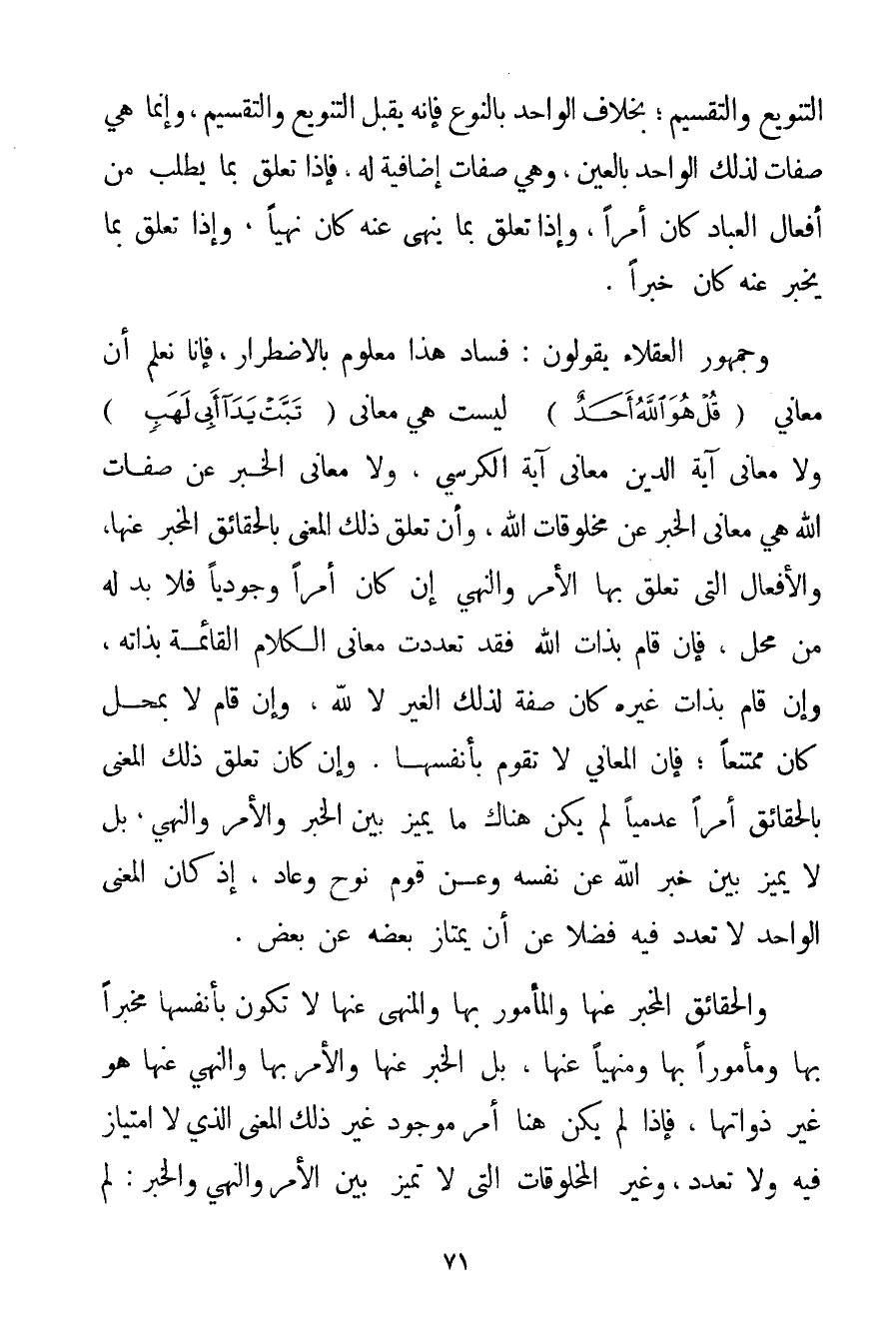 التَّنْوِيعَ وَالتَّقْسِيمَ؛ بِخِلَافِ الْوَاحِدِ بِالنَّوْعِ فَإِنَّهُ يَقْبَلُ التَّنْوِيعَ وَالتَّقْسِيمَ وَإِنَّمَا هِيَ صِفَاتٌ لِذَلِكَ الْوَاحِدِ بِالْعَيْنِ وَهِيَ صِفَاتٌ إضَافِيَّةٌ لَهُ فَإِذَا تَعَلَّقَ بِمَا يُطْلَبُ مِنْ أَفْعَالِ الْعِبَادِ كَانَ أَمْرًا وَإِذَا تَعَلَّقَ بِمَا يُنْهَى عَنْهُ كَانَ نَهْيًا وَإِذَا تَعَلَّقَ بِمَا يُخْبَرُ عَنْهُ كَانَ خَبَرًا. وَجُمْهُورُ الْعُقَلَاءِ يَقُولُونَ: فَسَادُ هَذَا مَعْلُومٌ بِالِاضْطِرَارِ فَإِنَّا نَعْلَمُ أَنَّ مَعَانِيَ {قُلْ هُوَ اللَّهُ أَحَدٌ} لَيْسَتْ هِيَ مَعَانِي {تَبَّتْ يَدَا أَبِي لَهَبٍ} وَلَا مَعَانِي آيَةِ الدَّيْنِ مَعَانِي آيَةِ الْكُرْسِيِّ وَلَا مَعَانِي الْخَبَرِ عَنْ صِفَاتِ اللَّهِ هِيَ مَعَانِي الْخَبَرِ عَنْ مَخْلُوقَاتِ اللَّهِ وَأَنَّ تَعَلُّقَ ذَلِكَ الْمَعْنَى بِالْحَقَائِقِ الْمَخْبَرِ عَنْهَا وَالْأَفْعَالُ الَّتِي تَعَلَّقَ بِهَا الْأَمْرُ وَالنَّهْيُ إنْ كَانَ أَمْرًا وُجُودِيًّا فَلَا بُدَّ لَهُ مِنْ مَحَلٍّ فَإِنْ قَامَ بِذَاتِ اللَّهِ فَقَدْ تَعَدَّدَتْ مَعَانِي الْكَلَامِ الْقَائِمَةُ بِذَاتِهِ وَإِنْ قَامَ بِذَاتِ غَيْرِهِ كَانَ صِفَةً لِذَلِكَ الْغَيْرِ لَا لِلَّهِ وَإِنْ قَامَ لَا بِمَحَلِّ كَانَ مُمْتَنِعًا؛ فَإِنَّ الْمَعَانِيَ لَا تَقُومُ بِأَنْفُسِهَا؛ وَإِنْ كَانَ تَعَلُّقُ ذَلِكَ الْمَعْنَى بِالْحَقَائِقِ أَمْرًا عَدَمِيًّا لَمْ يَكُنْ هُنَاكَ مَا يُمَيَّزُ بَيْنَ الْخَبَرِ وَالْأَمْرِ وَالنَّهْيِ بَلْ لَا يُمَيِّزُ بَيْنَ خَبَرِ اللَّهِ عَنْ نَفْسِهِ وَعَنْ قَوْمِ نُوحٍ وَعَادٍ إذْ كَانَ الْمَعْنَى الْوَاحِدُ لَا تَعَدُّدَ فِيهِ فَضْلًا عَنْ أَنْ يَمْتَازَ بَعْضُهُ عَنْ بَعْضٍ. وَالْحَقَائِقُ الْمَخْبَرُ عَنْهَا وَالْمَأْمُورُ بِهَا وَالْمَنْهِيُّ عَنْهَا لَا تَكُونُ بِأَنْفُسِهَا مُخْبَرًا بِهَا وَمَأْمُورًا بِهَا وَمَنْهِيًّا عَنْهَا بَلْ الْخَبَرُ عَنْهَا وَالْأَمْرُ بِهَا وَالنَّهْيُ عَنْهَا هُوَ غَيْرُ ذَوَاتِهَا فَإِذَا لَمْ يَكُنْ هُنَا أَمْرٌ مَوْجُودٌ غَيْرُ ذَلِكَ الْمَعْنَى الَّذِي لَا امْتِيَازَ فِيهِ وَلَا تَعَدُّدَ وَغَيْرُ الْمَخْلُوقَاتِ الَّتِي لَا تُمَيِّزُ بَيْنَ الْأَمْرِ وَالنَّهْيِ وَالْخَبَرِ: لَمْ